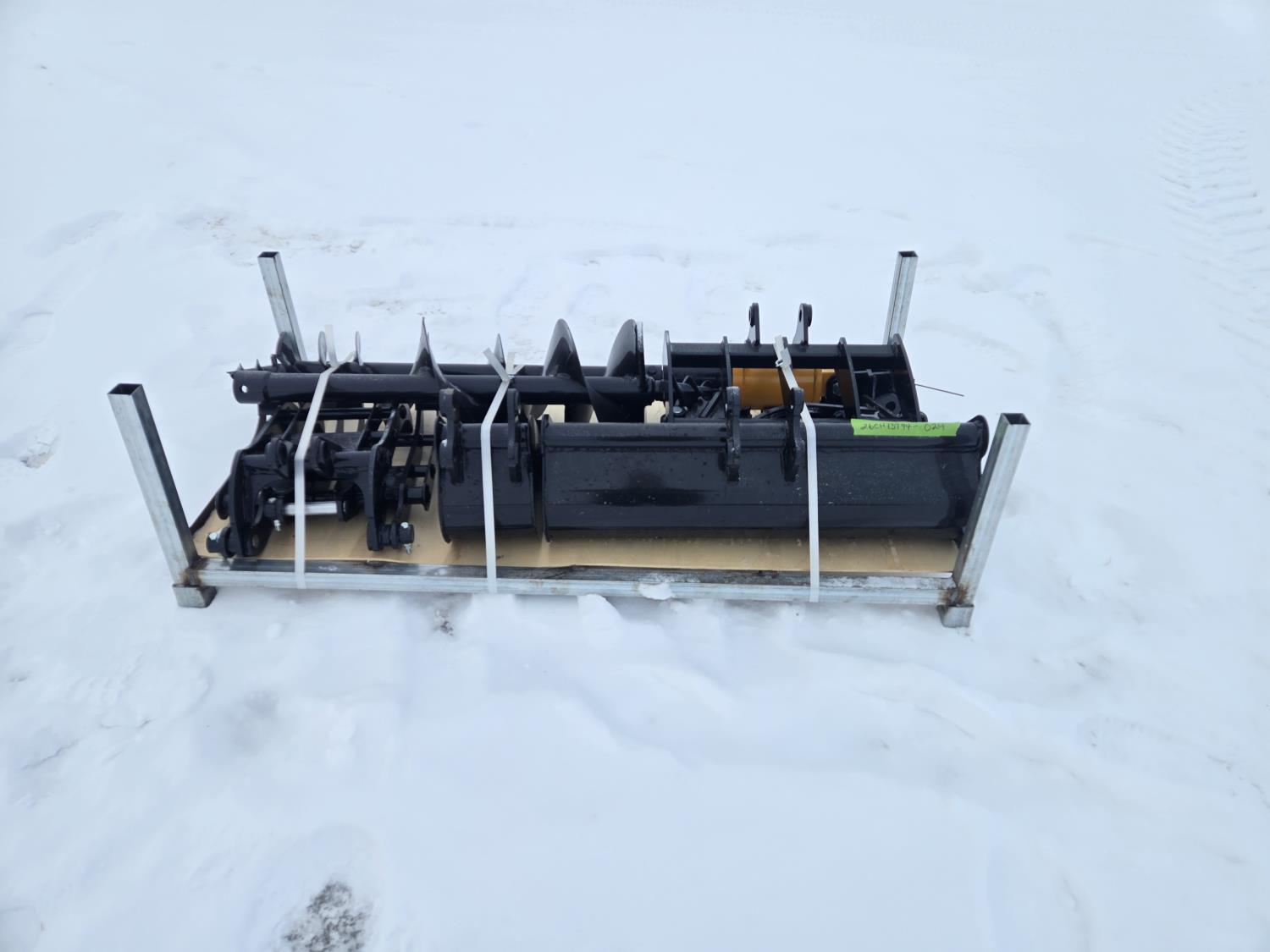 rake, ripper, grabber, 12 inch auger, 16 inch auger, 8 inch narrow bucket, 24 inch bucket, 32 inch bucket