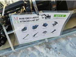 200 mm dig bucket, quick hitch, 800 mm bucket, grabber, 20 cm auger, 30 cm auger bit, rake, ripper