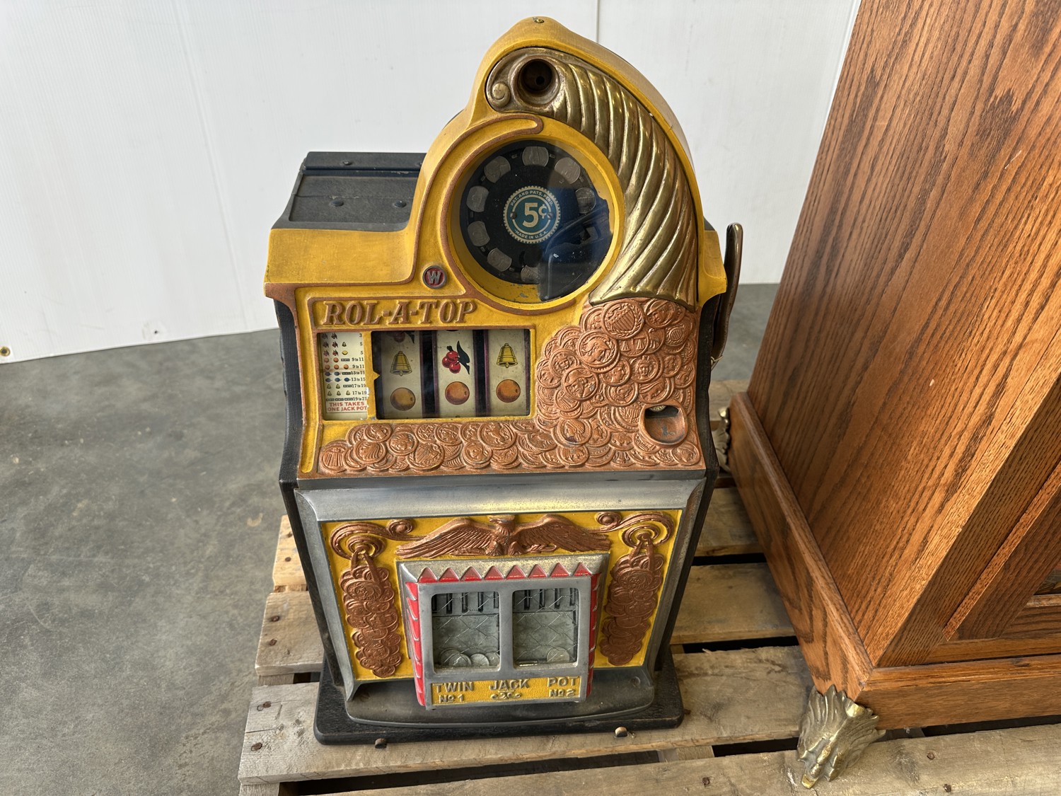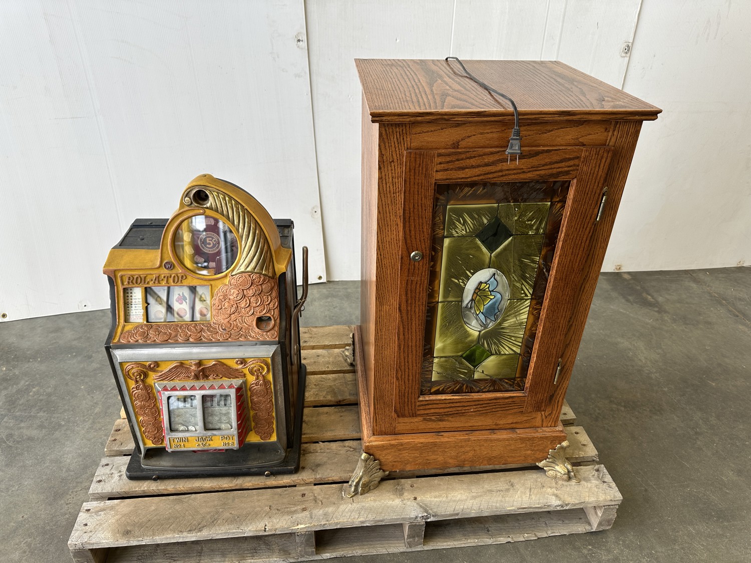 1937 Watling Five Cent "Rol-a-Top" Slot Machine and Cabinet