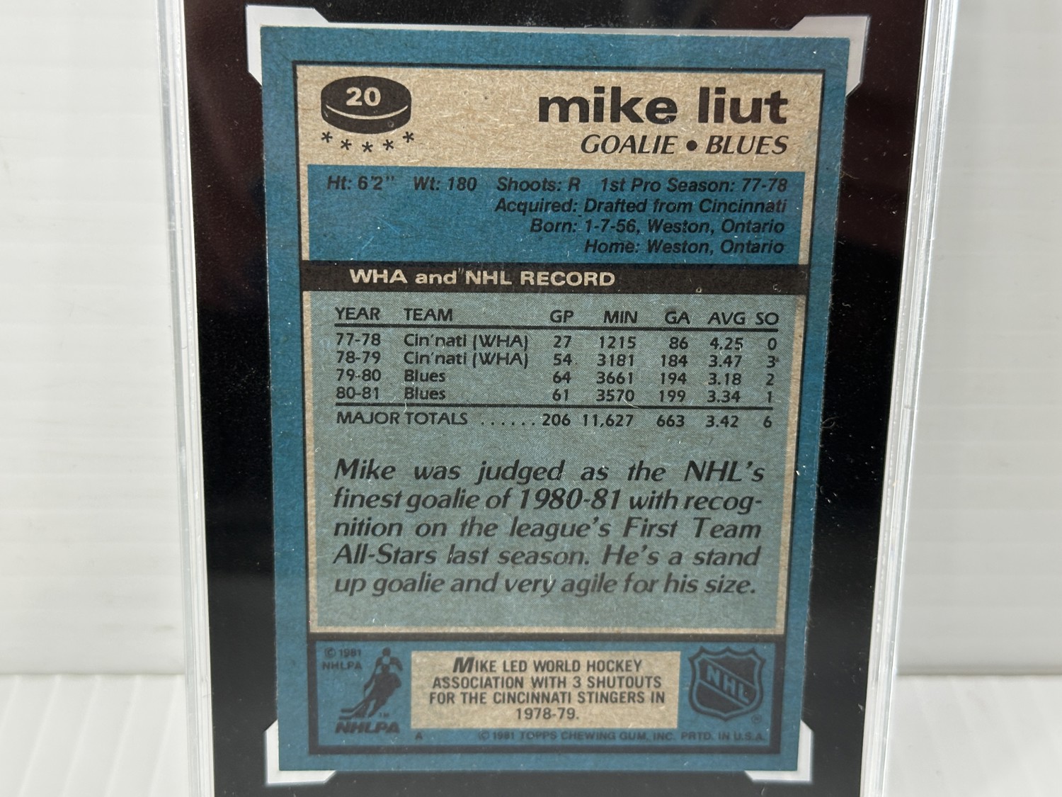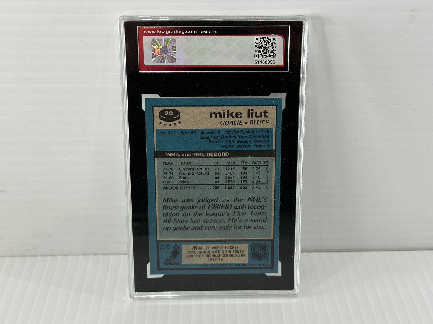 1981-82 Topps #20 Mike Liut hockey card, Grade 8.5 - (NMM+) Near Mint to Mint Plus