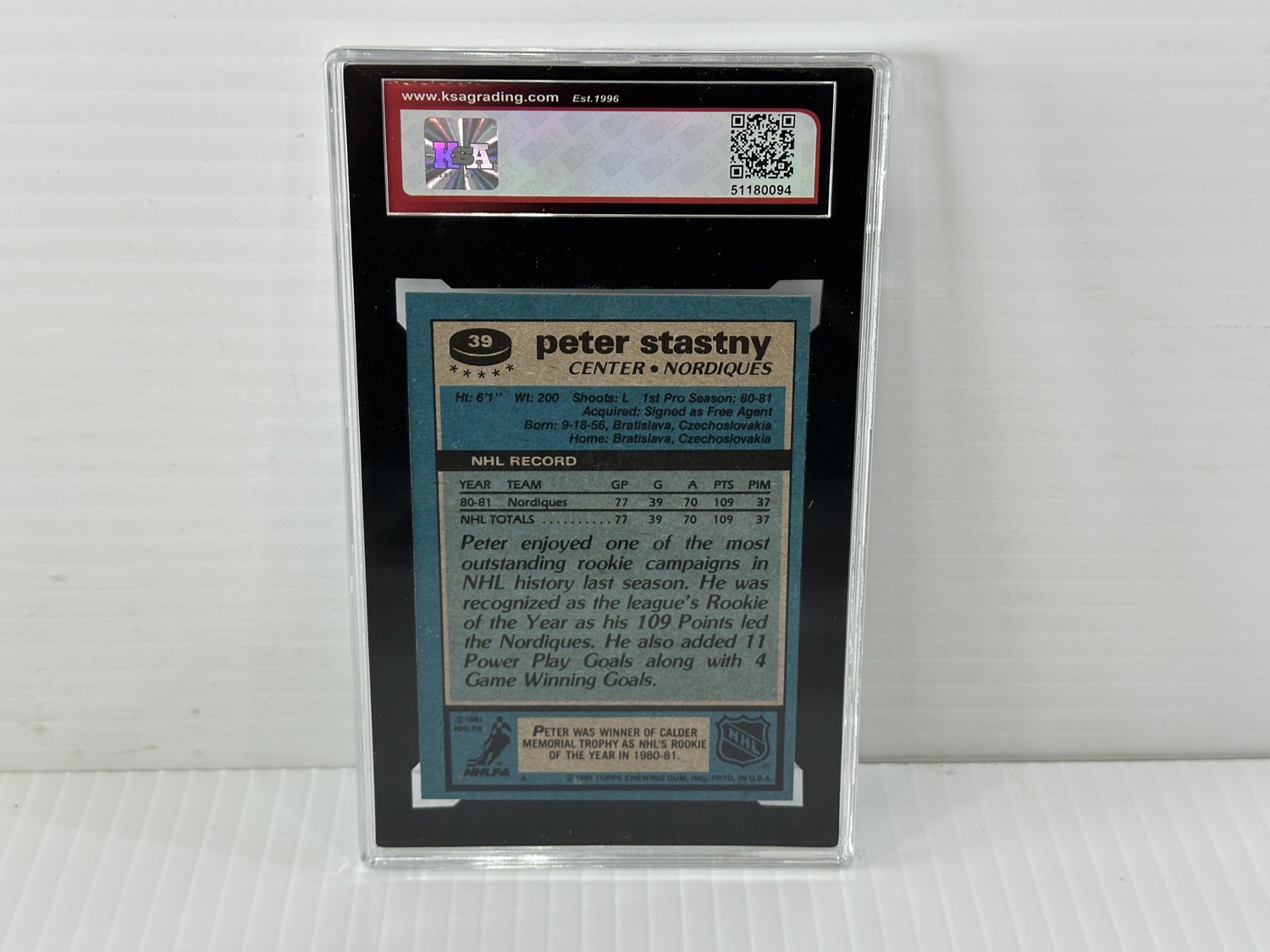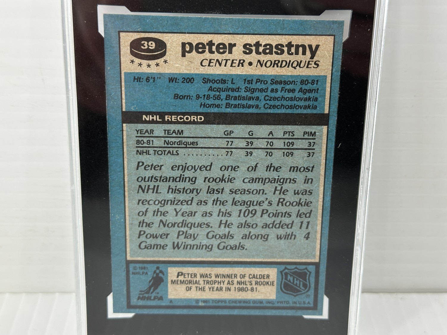 1981-82 Topps #39 Peter Stastny rookie card, Grade 8.5 - (NMM+) Near Mint to Mint Plus