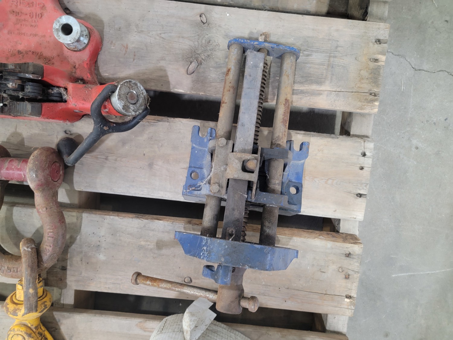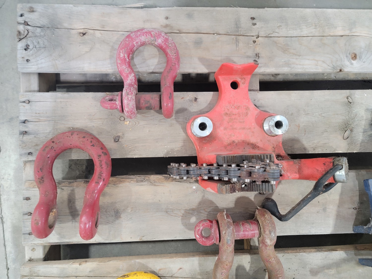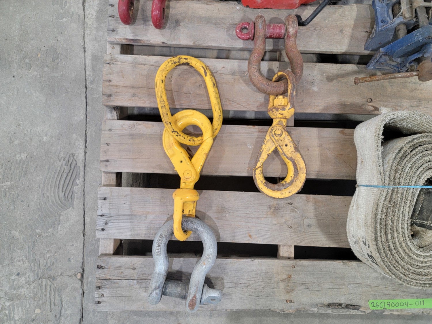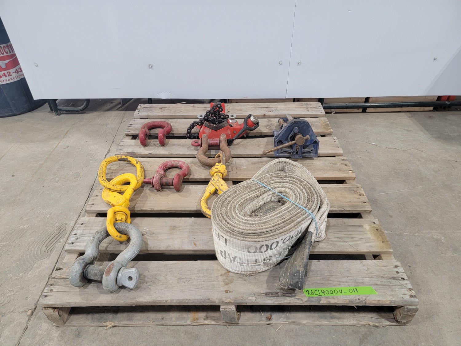 (4) shackles, (2) self locking swivel hooks, woodworking vise, top screw bench chain vise, (1) 100,000 lb tow strap