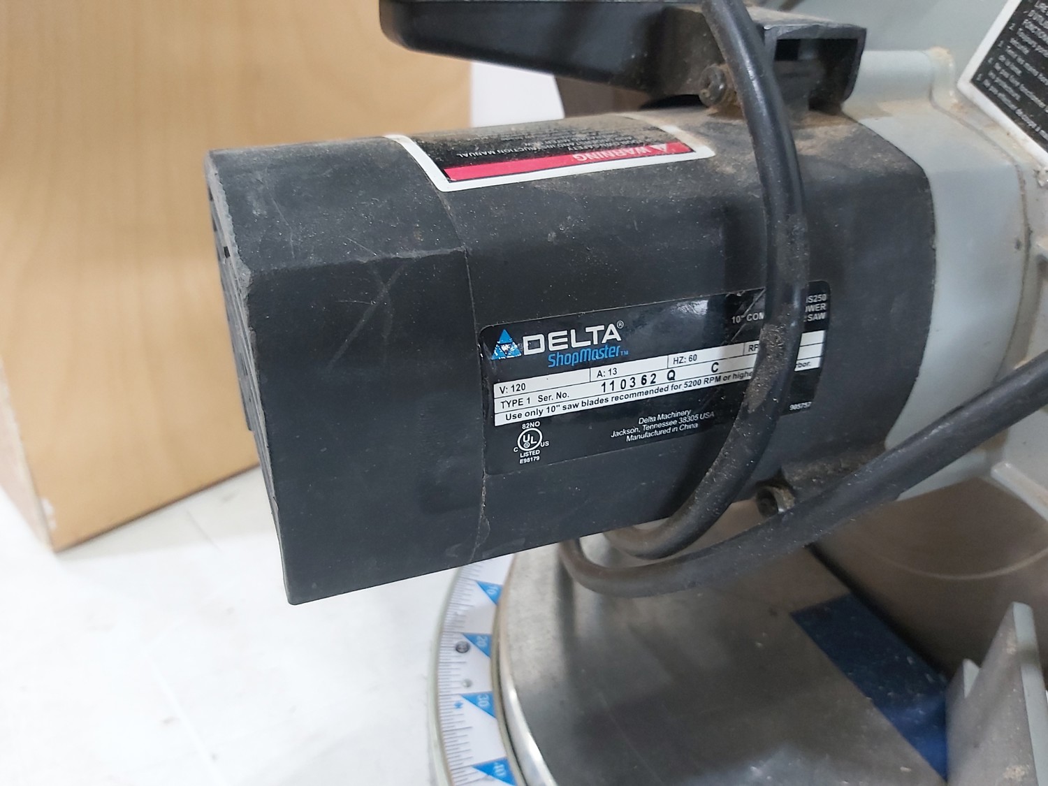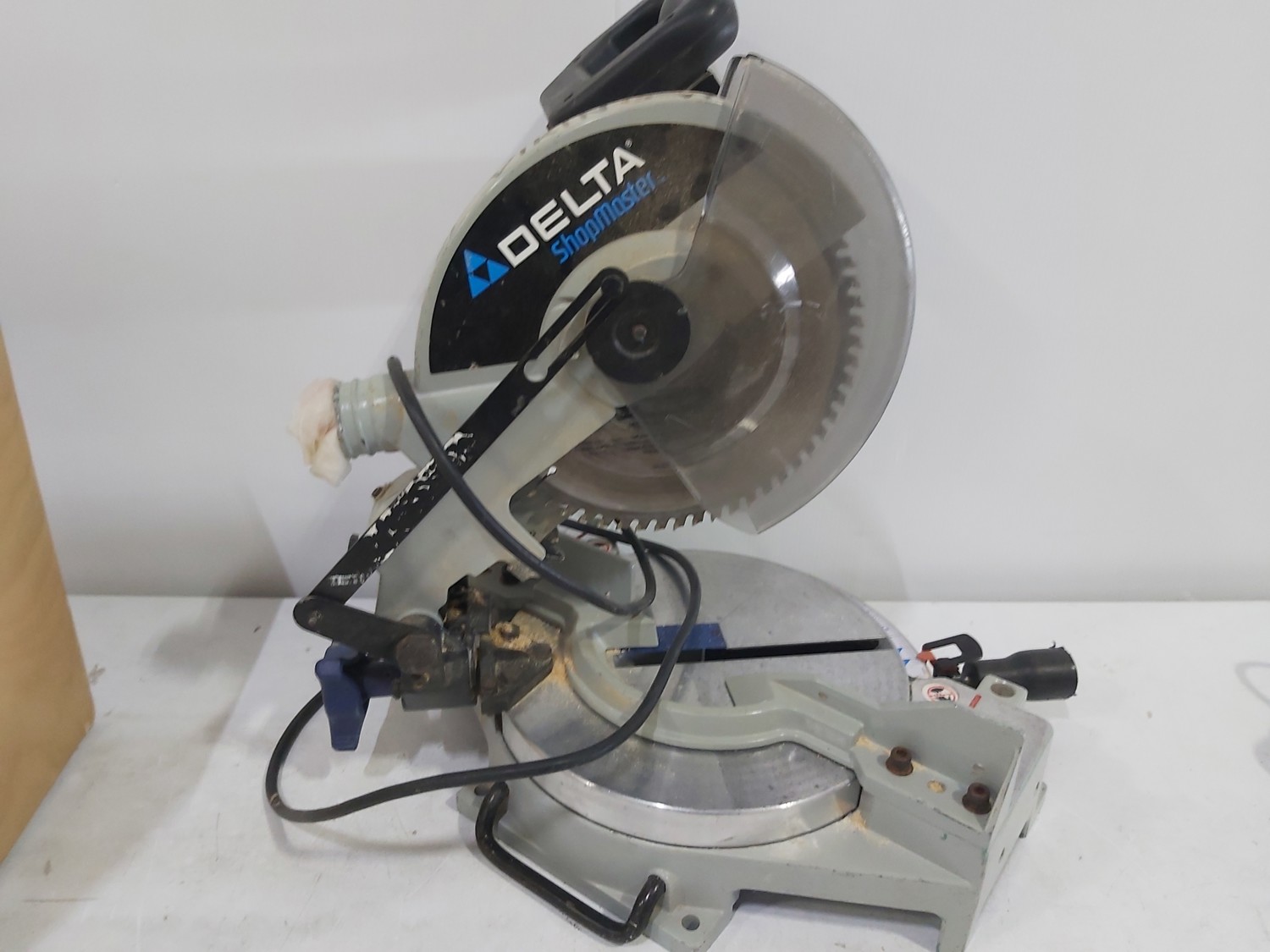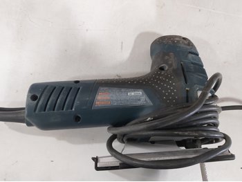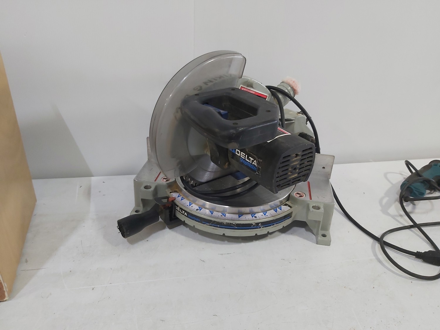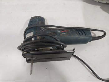Bosch jigsaw, Black & Decker jigsaw, Makita drill, Delta Shopmaster 10 inch compound miter saw, wooden box 24 inch x 12 inch x 15 inch h
