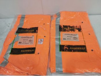 men's size small briefs, size small t-shirts, (2) size 2XL hoodies, (2) 2XL piece rainsuits, hi-vis vests