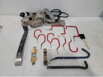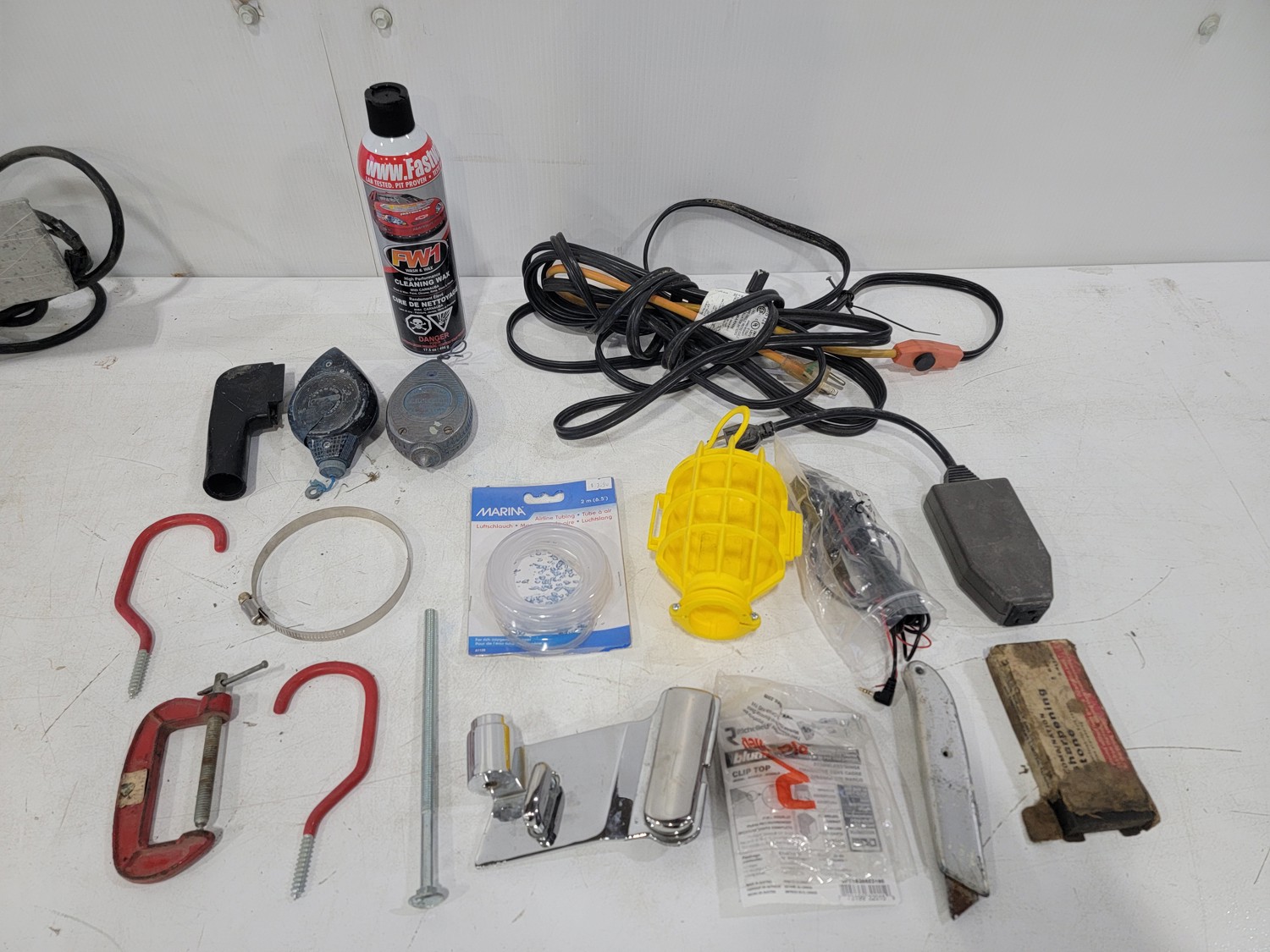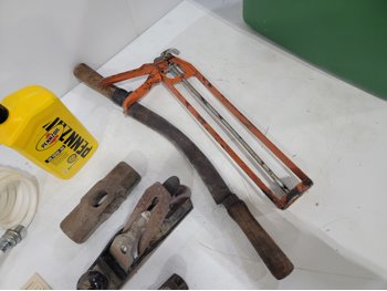 work light, hand planners, pry tools, draw knife, hand scythe, ball hitch, garage storage hooks, pipe wrench