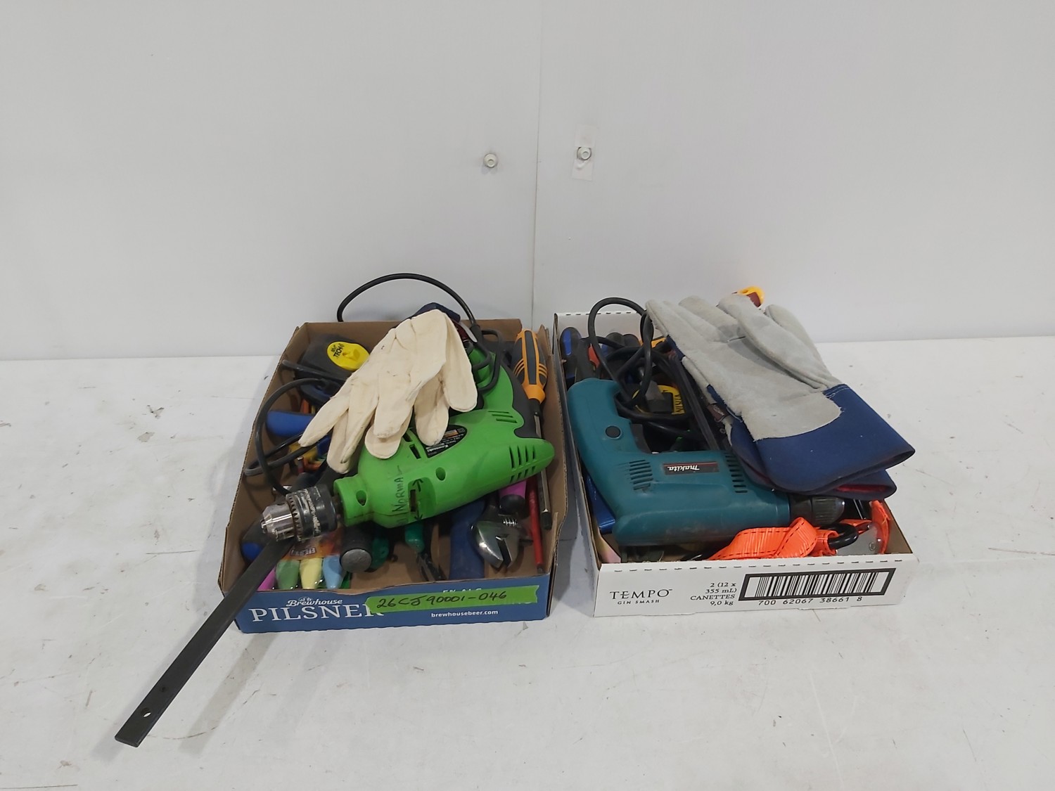 1137 Qty of Hand Tools, (2) Corded Drills and (2) Pairs of Work Gloves