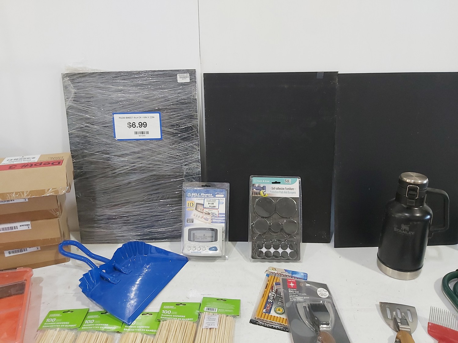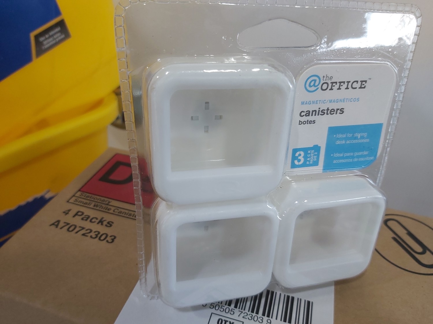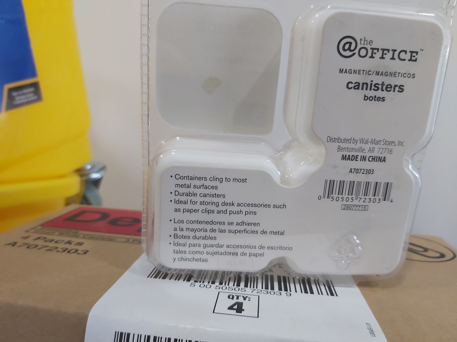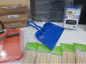(2) 24L utility buckets, (112) small magnetic canisters, office equipment, bamboo skewers, BBQ utensils
