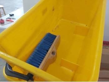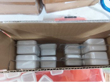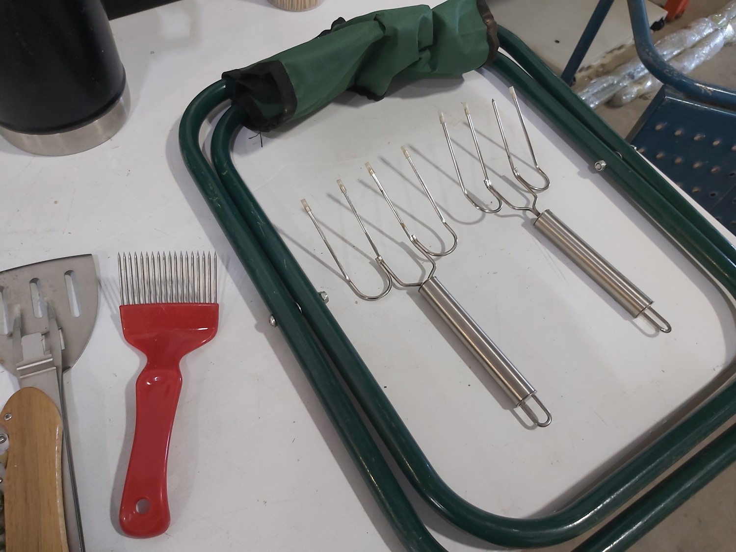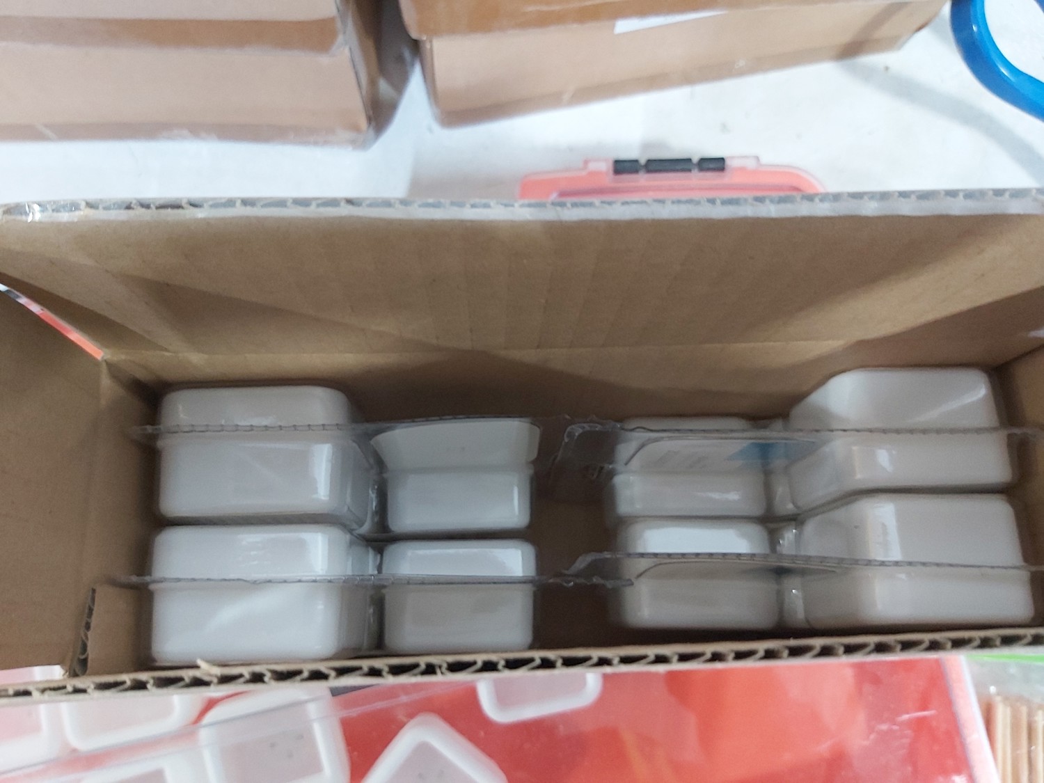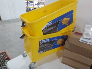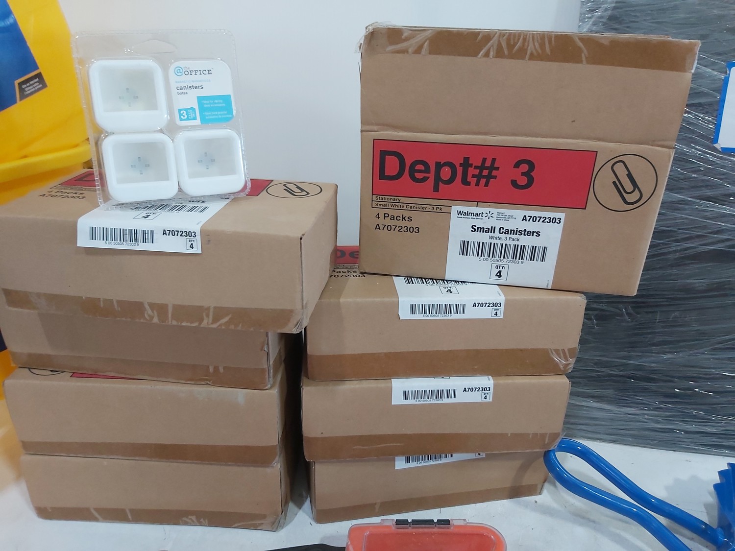 (2) 24L utility buckets, (112) small magnetic canisters, office equipment, bamboo skewers, BBQ utensils