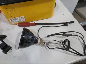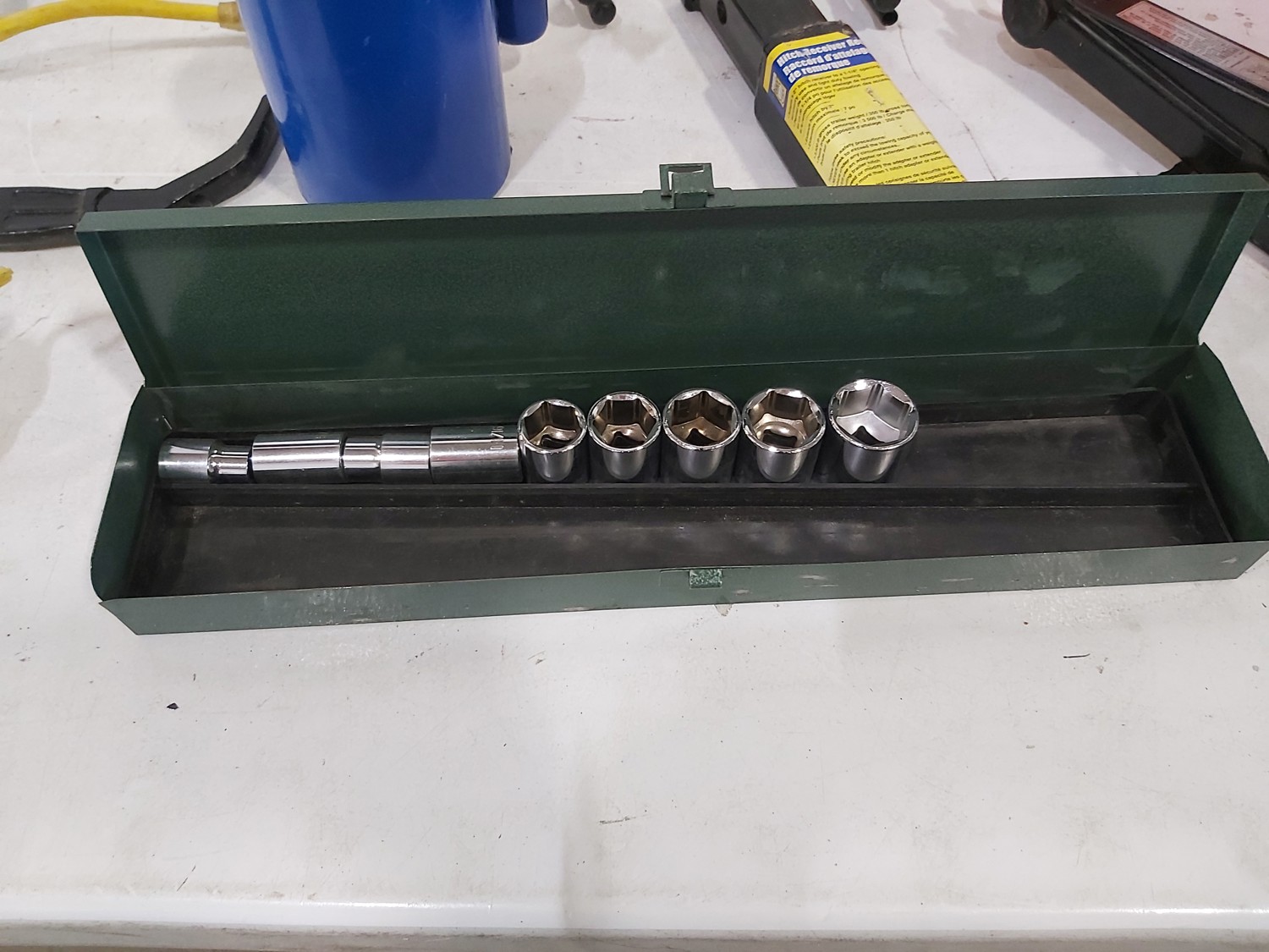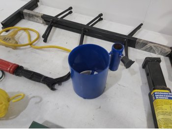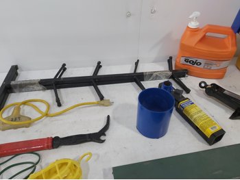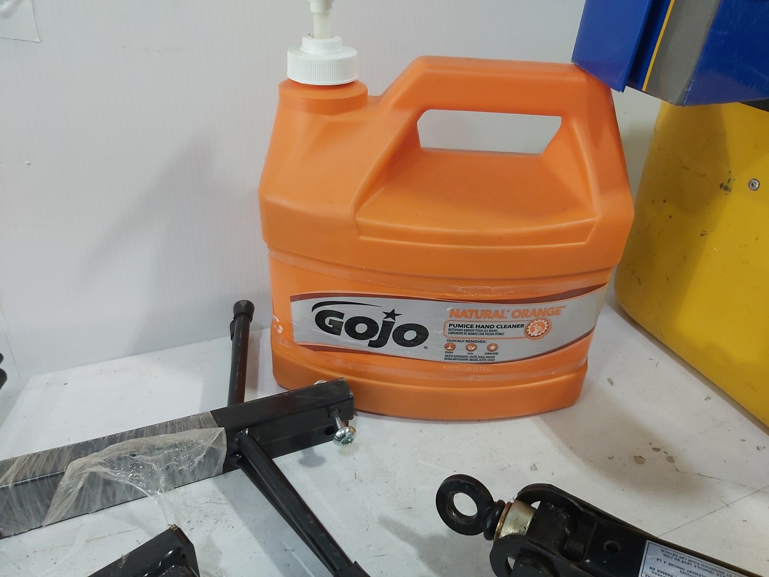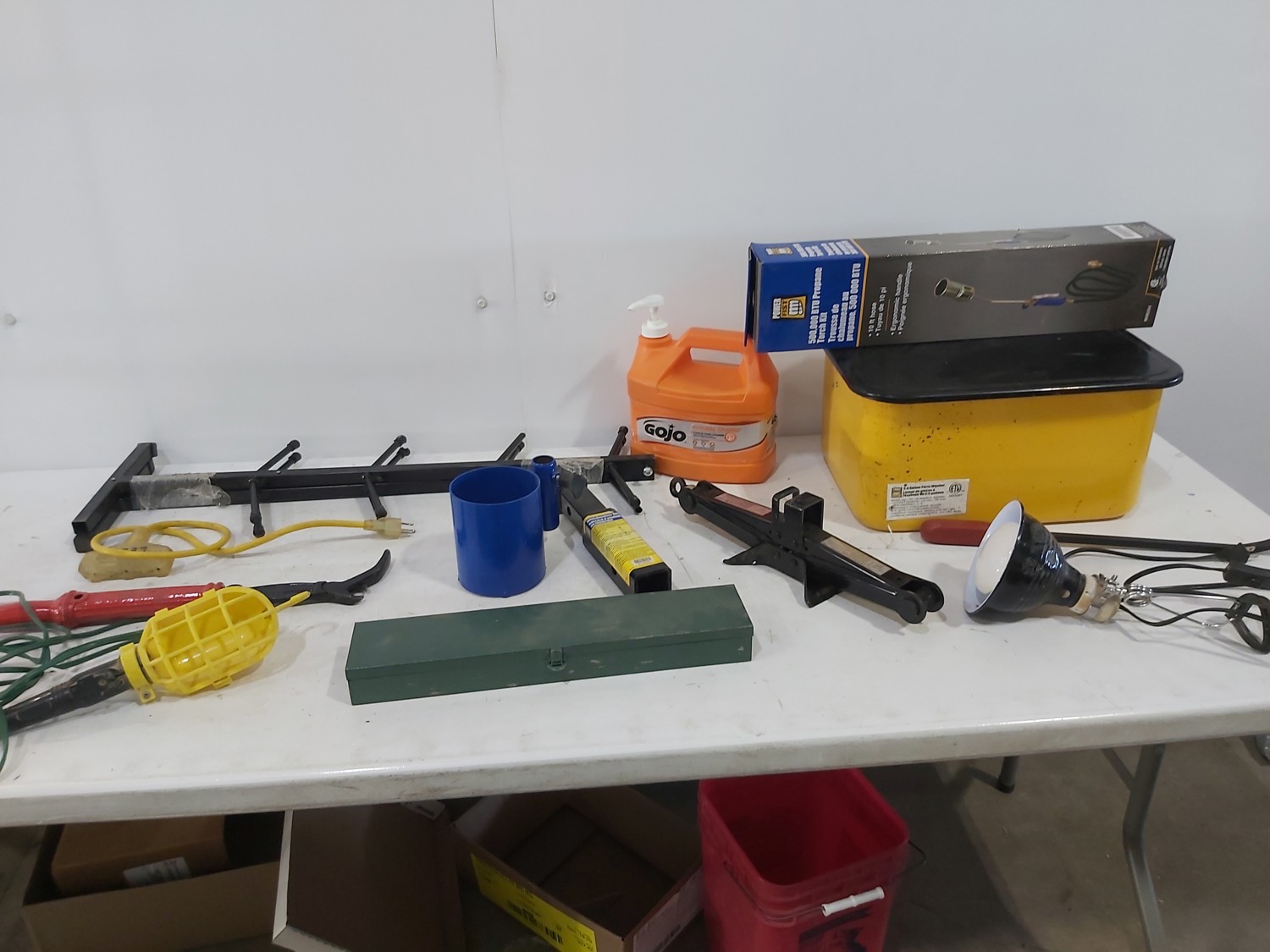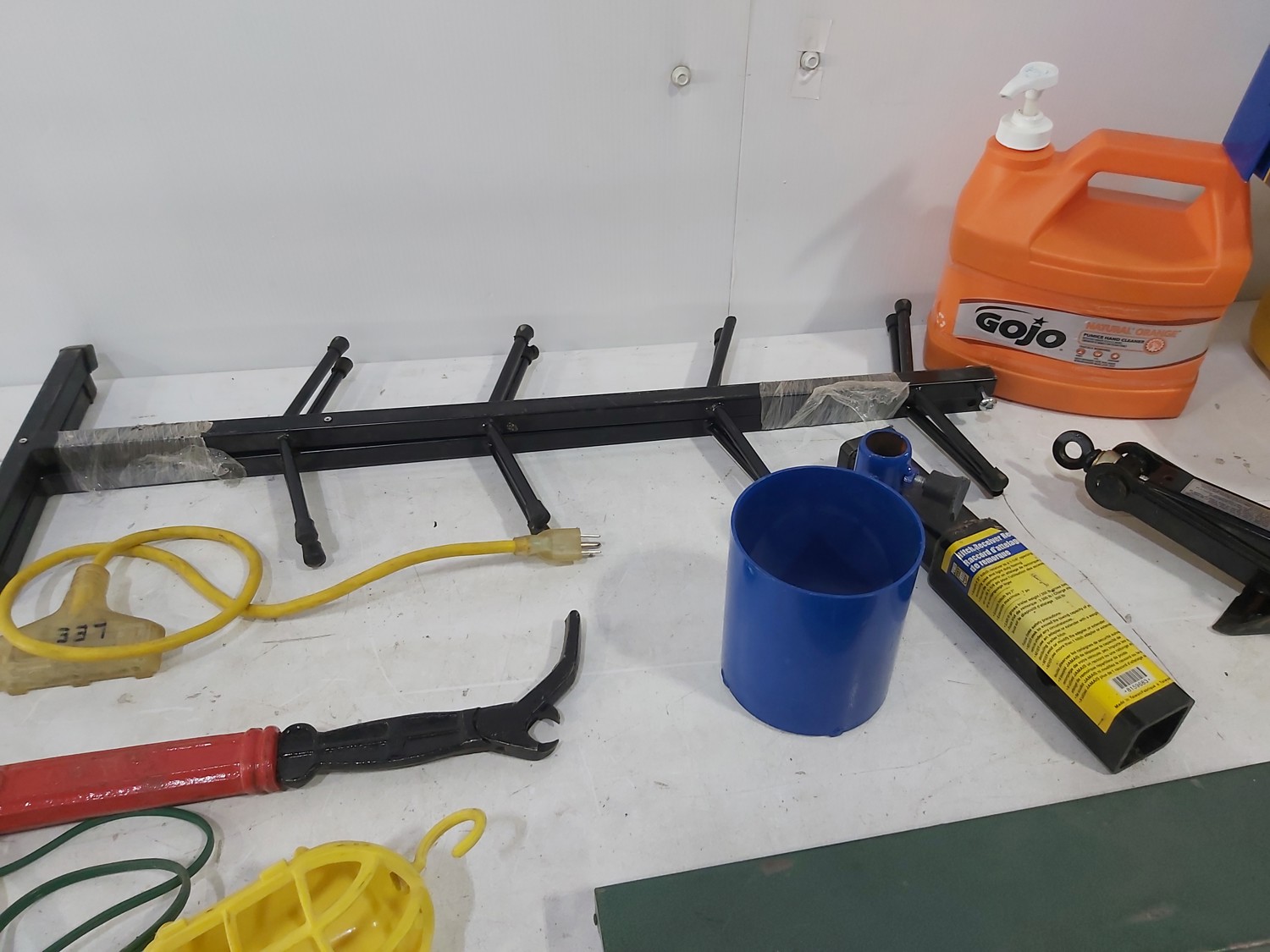 Powerfist 3-1/2 gallon parts washer, Powerfist 500,000 BTU propane torch, scissor jack, hitch receiver reducer, metal pole stand, (2) metal racks, slide hammer, pry bar, (2) inspection lamps, Gojo hand cleaner