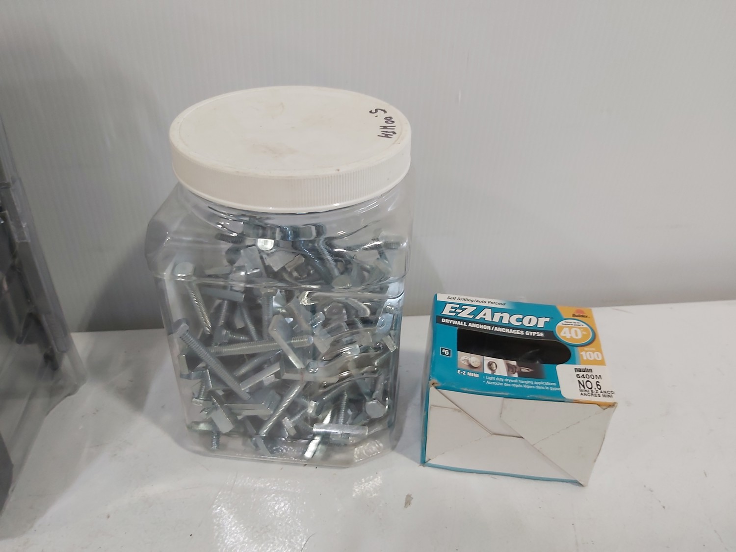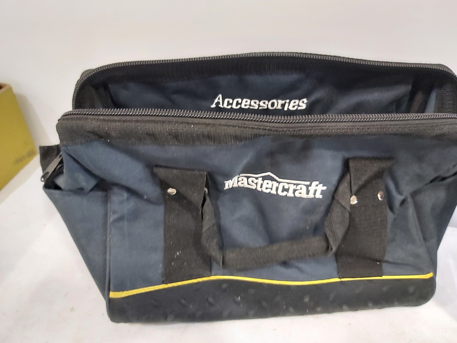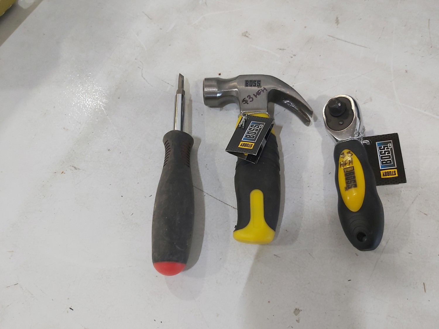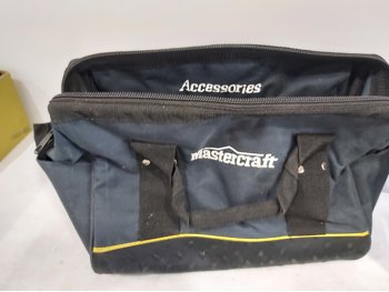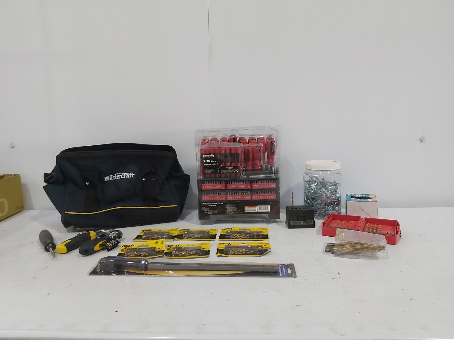 12 inch rasp, drill bits, wall anchors, Stanley mending plates, Mastercraft tool bag, mini claw hammer, mini ratchet, 100 piece Mr. Blacksmith screwdriver and bit set