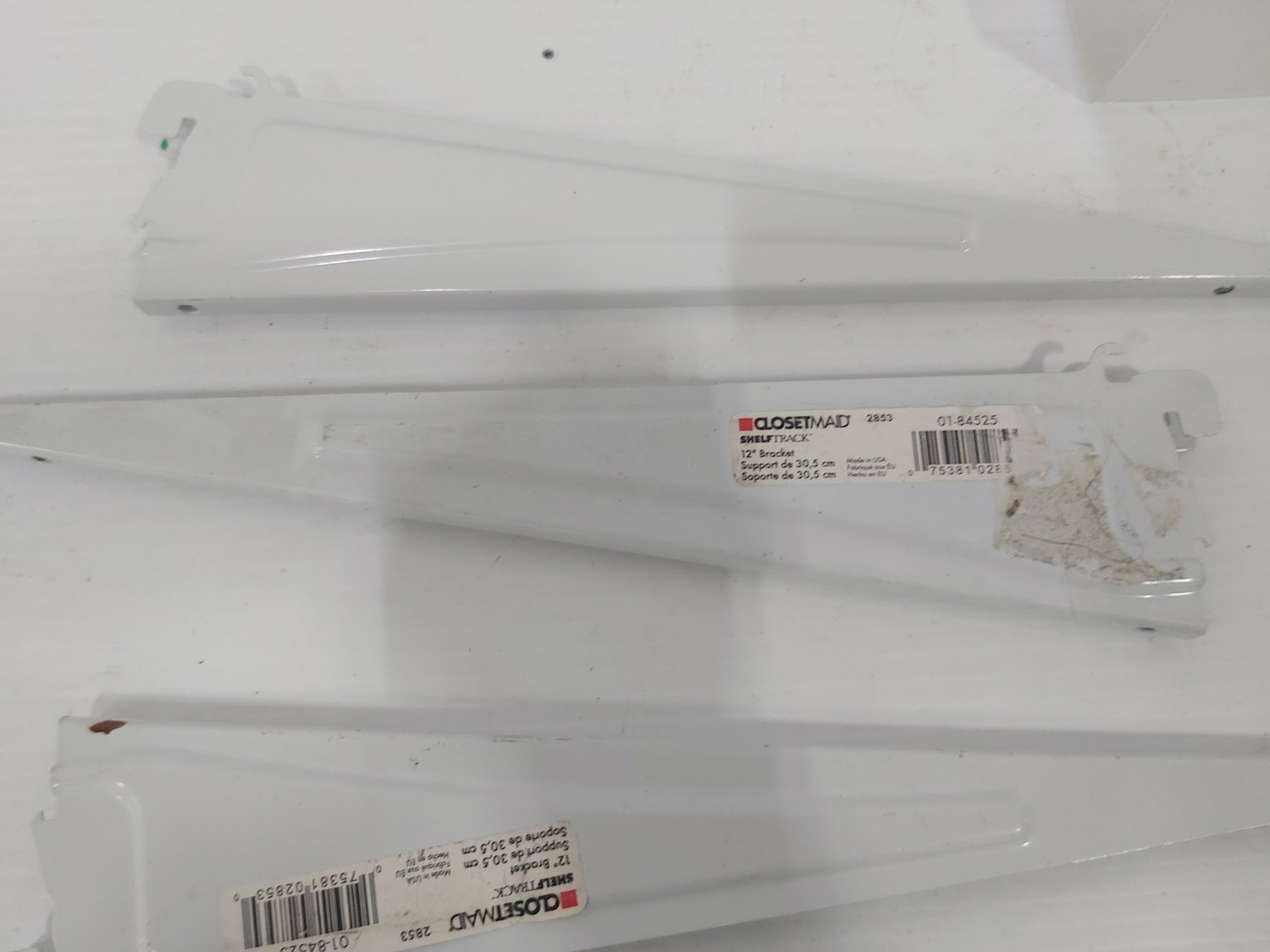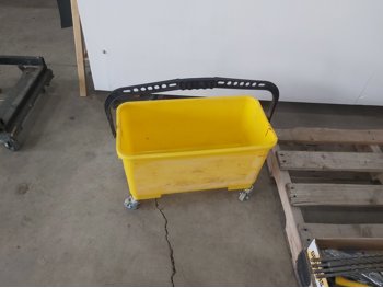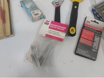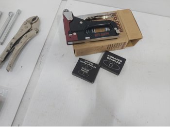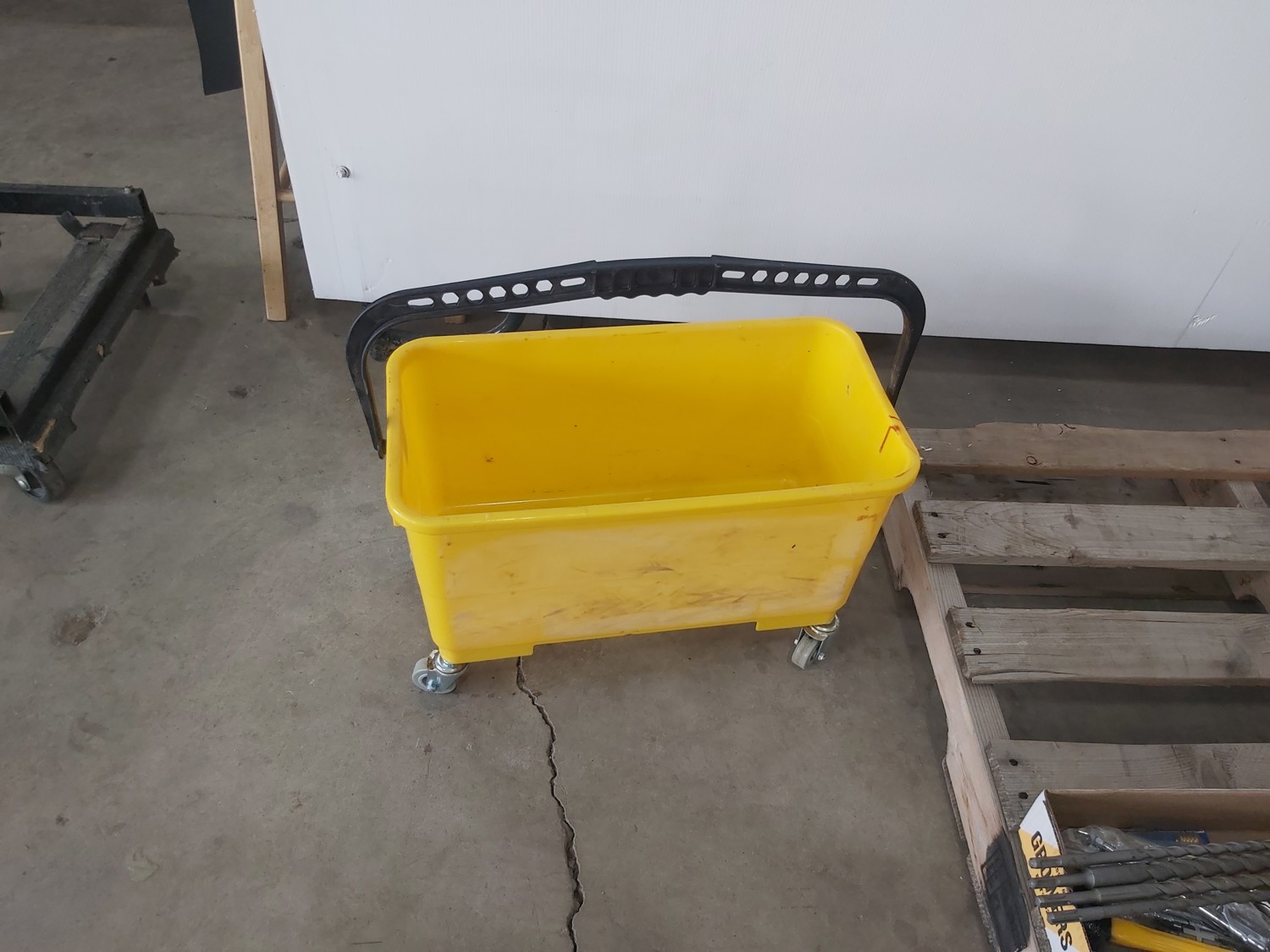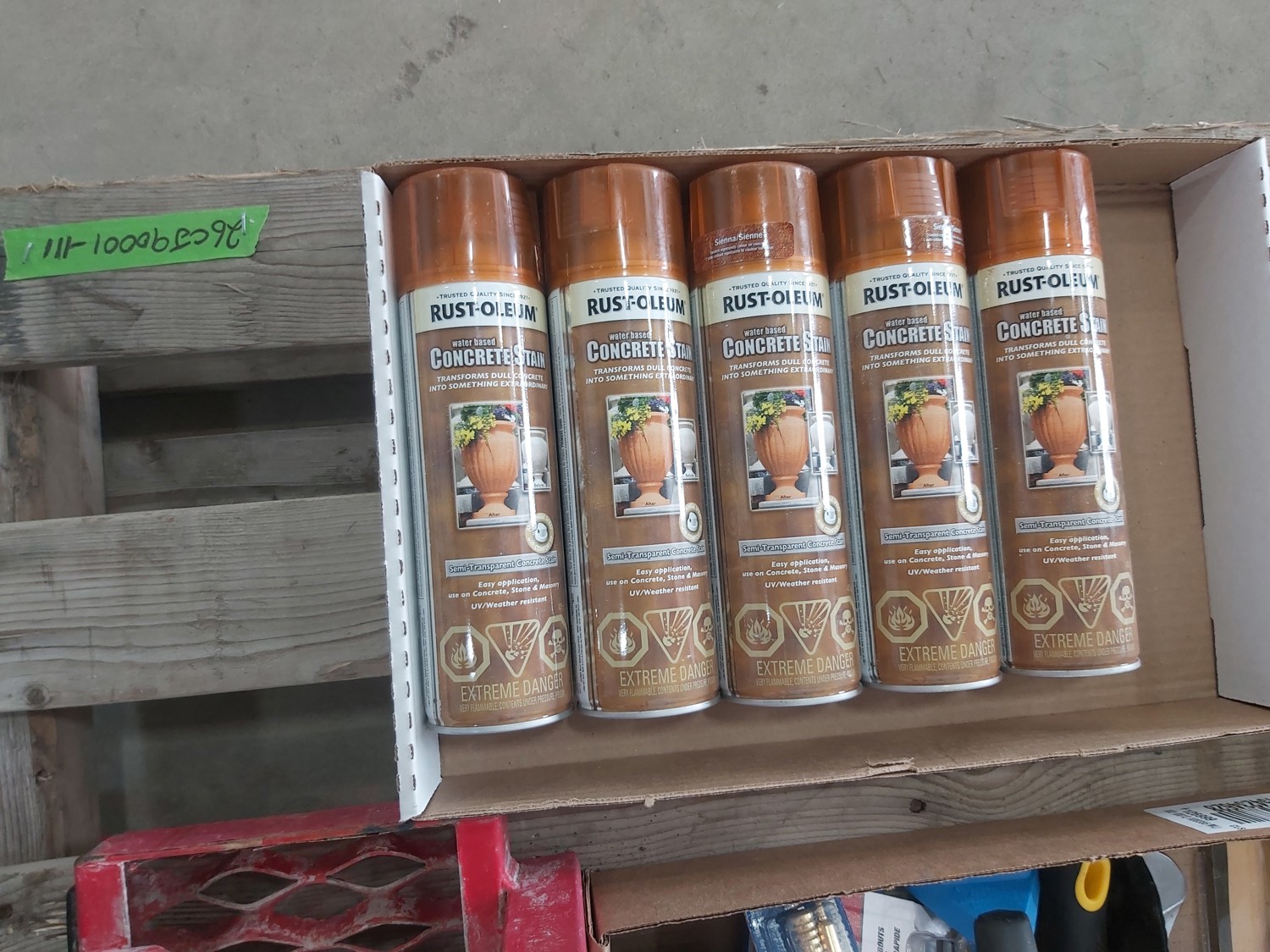 (5) Rust-Oleum concrete stain, dolly, wheeled bucket, 34 inch long metal step, Pro-point staple gun, (4) 18 inch quick attach concrete drill bits, hex set, (3) 12 inch brackets