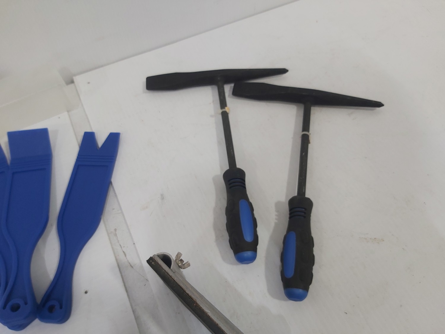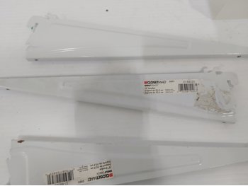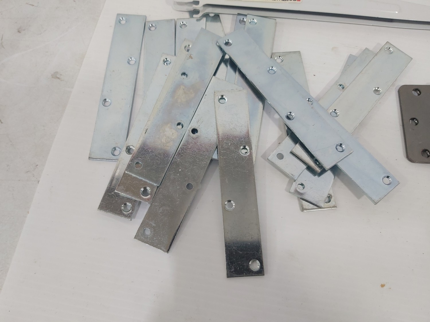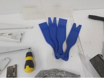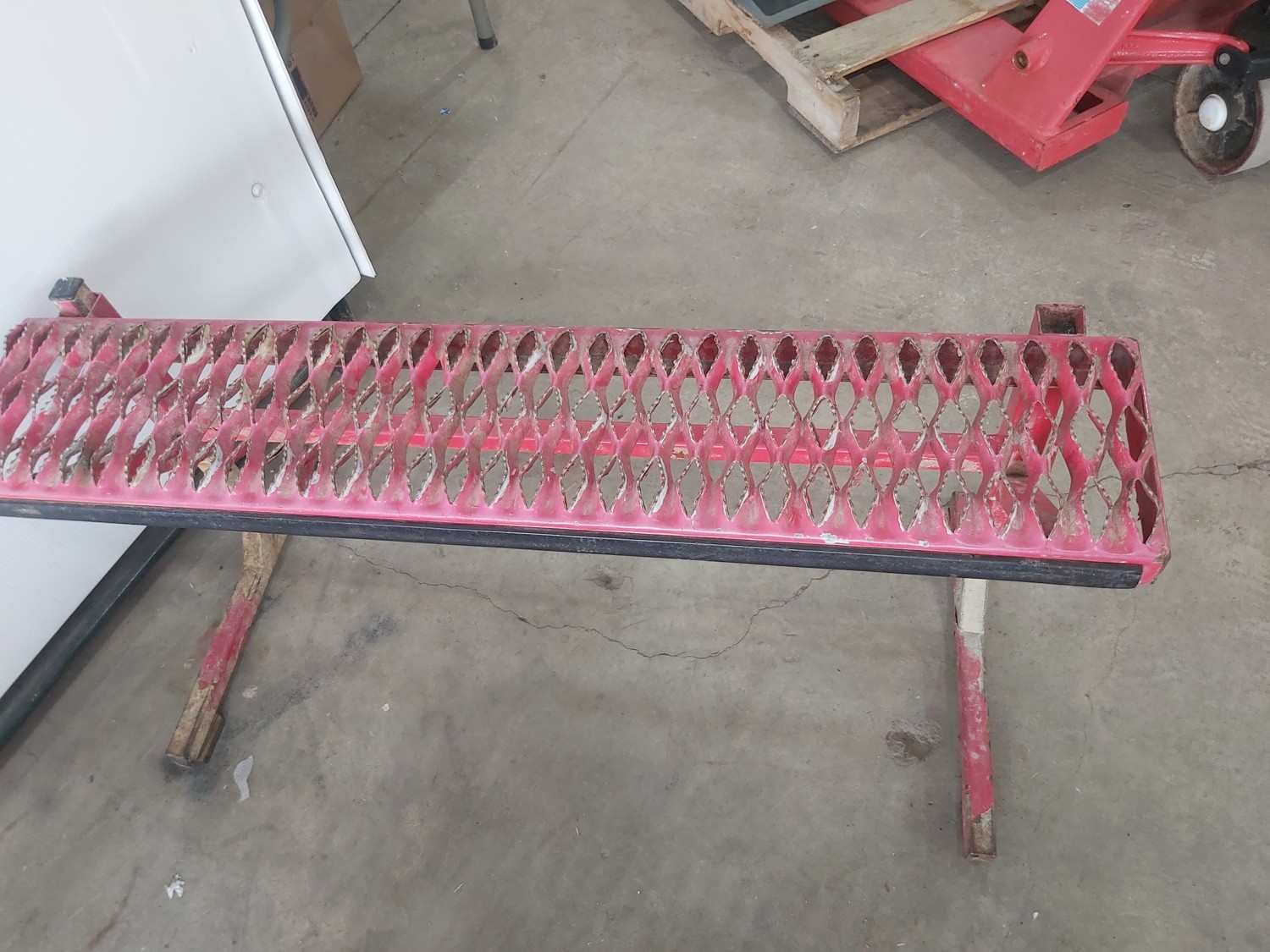 (5) Rust-Oleum concrete stain, dolly, wheeled bucket, 34 inch long metal step, Pro-point staple gun, (4) 18 inch quick attach concrete drill bits, hex set, (3) 12 inch brackets