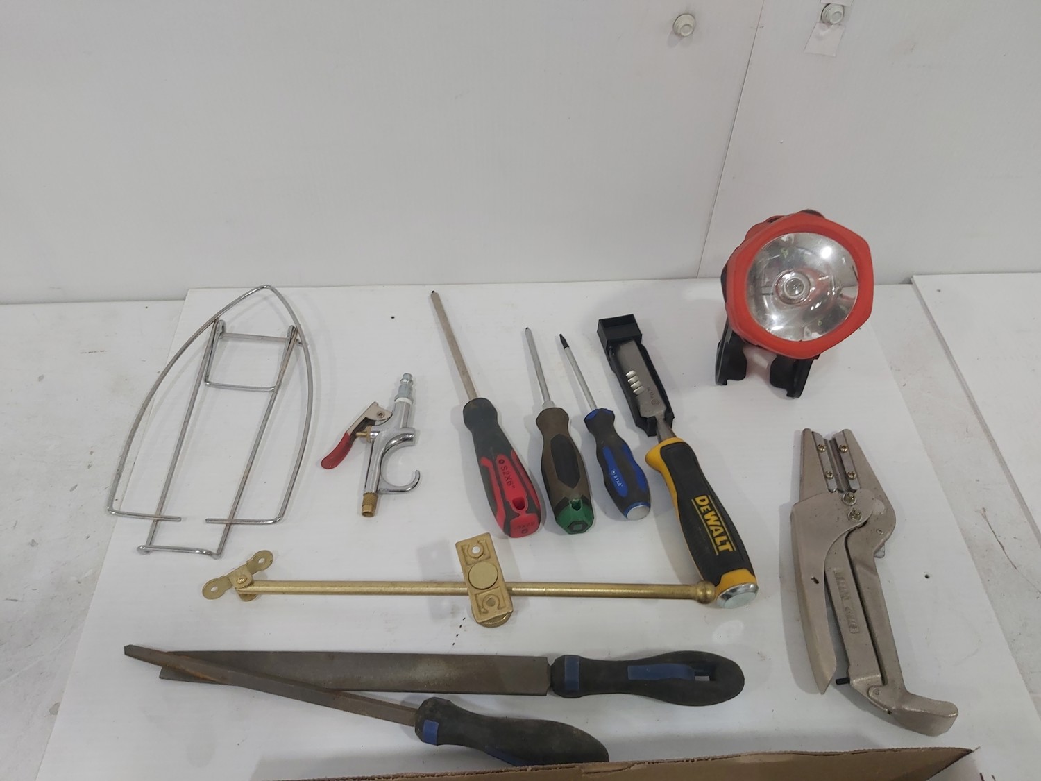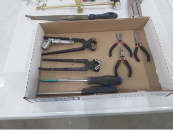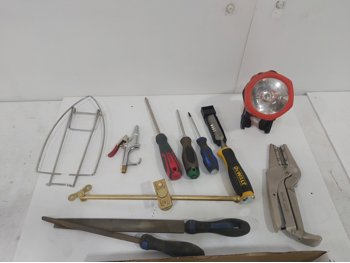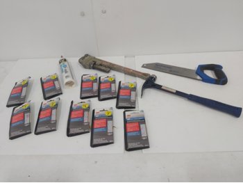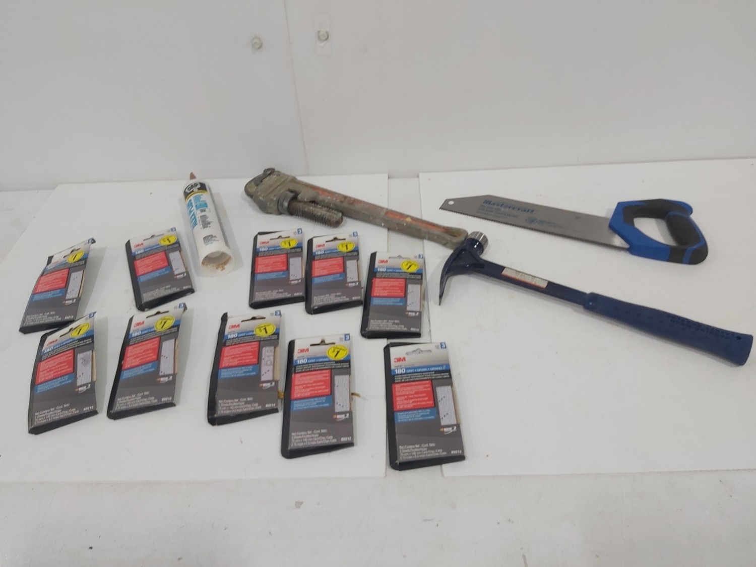 sand paper, 18 inch pipe wrench, PVC pipe saw, hammer, (4) 1 inch x 19-1/2 inch x 19-1/2 inch rubber mats, hand tools, (2) Toolmaster folding step stools, CargoMaster bike carrier