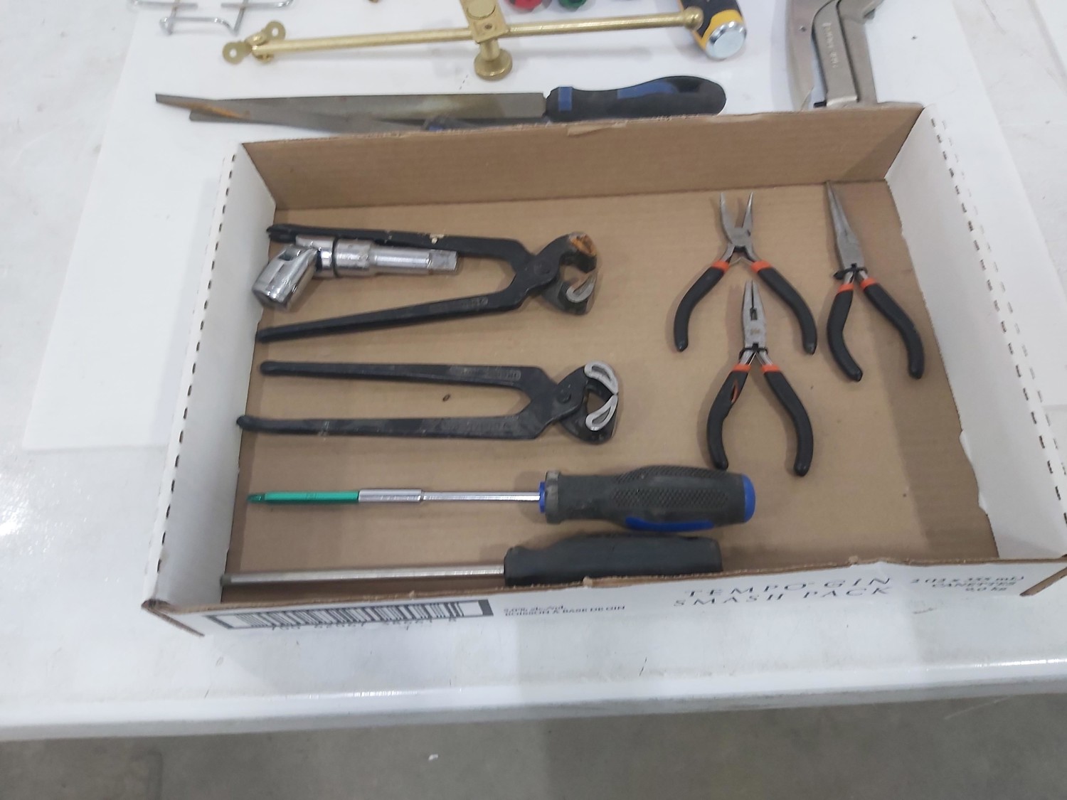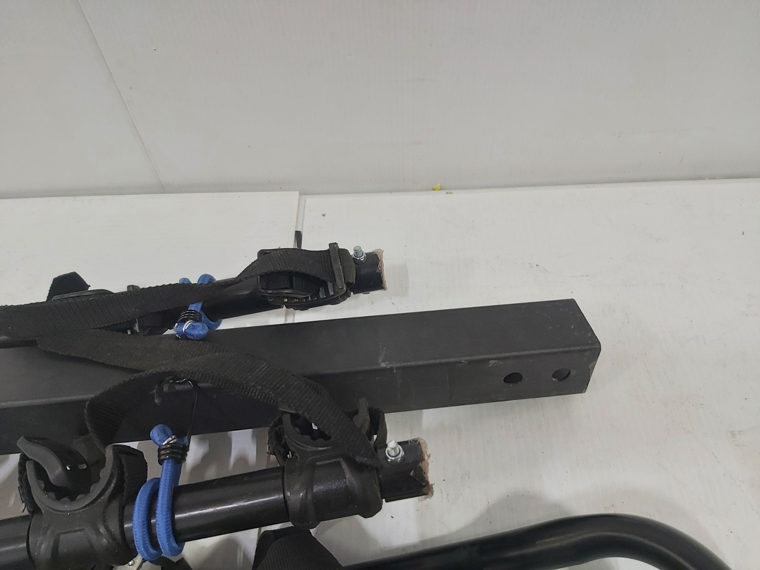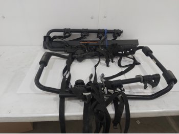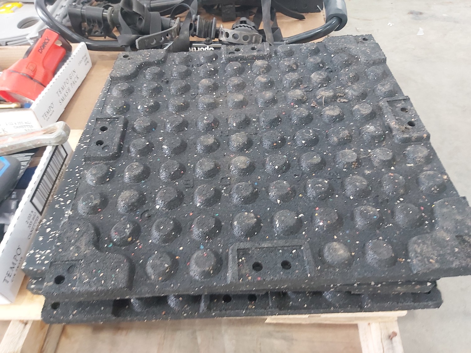sand paper, 18 inch pipe wrench, PVC pipe saw, hammer, (4) 1 inch x 19-1/2 inch x 19-1/2 inch rubber mats, hand tools, (2) Toolmaster folding step stools, CargoMaster bike carrier