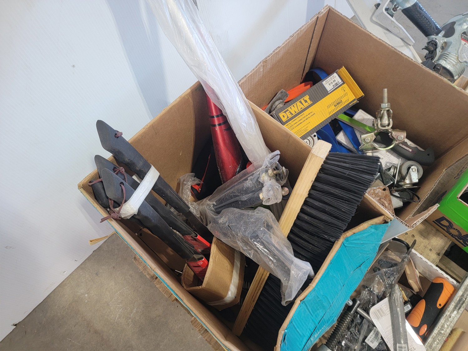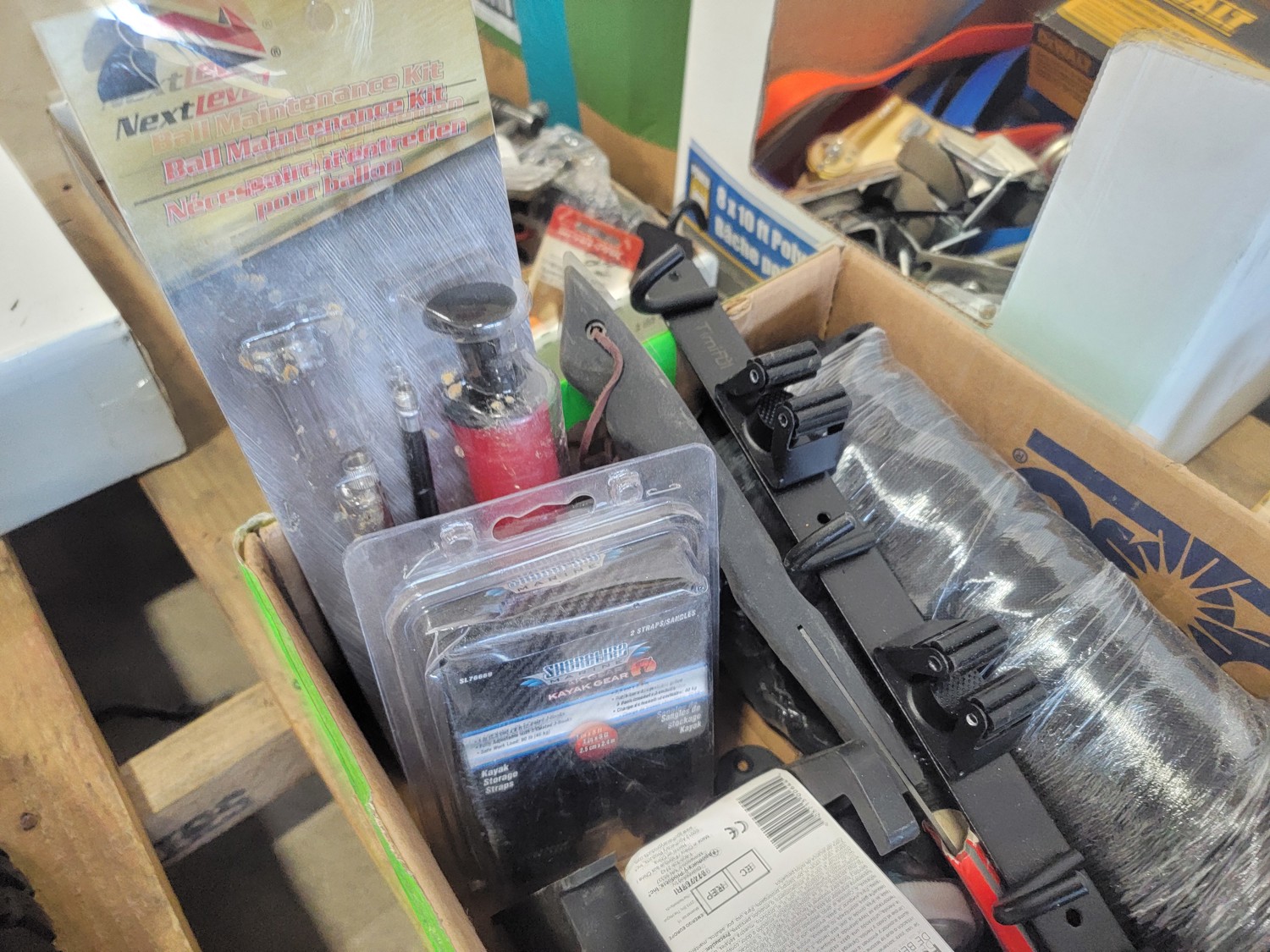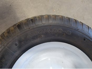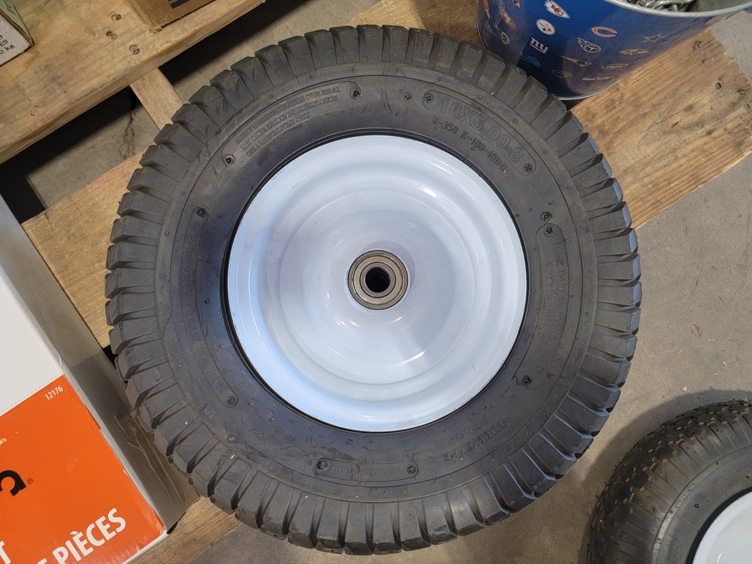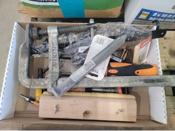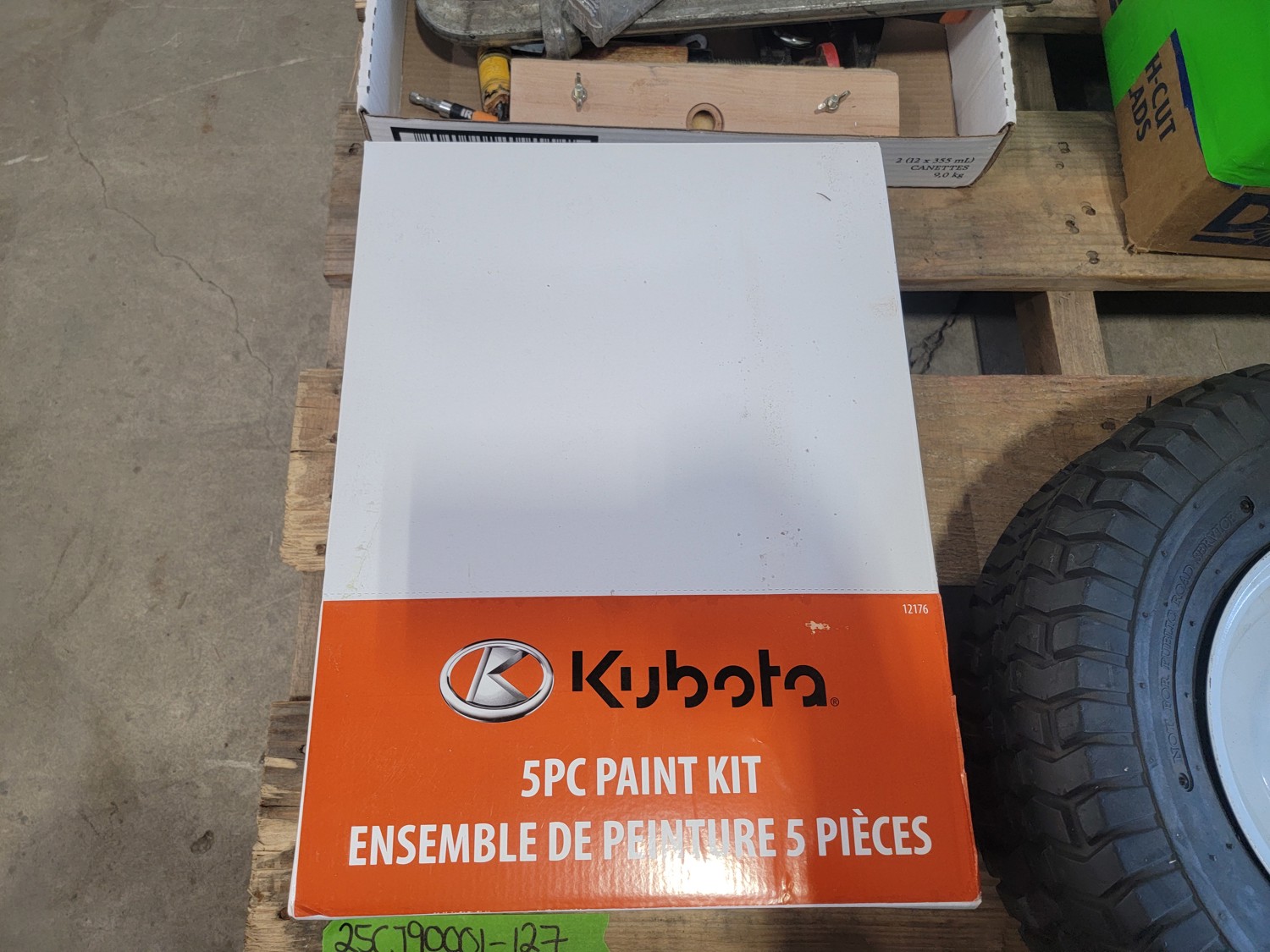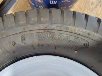 (1) 4.80/4.00-8 utility tire, (1) 16x5.00-8 utility tire, chains, Kubota 5 piece paint kit, air nailer, clamp, baseball bat, BBQ brushes, connector nails