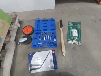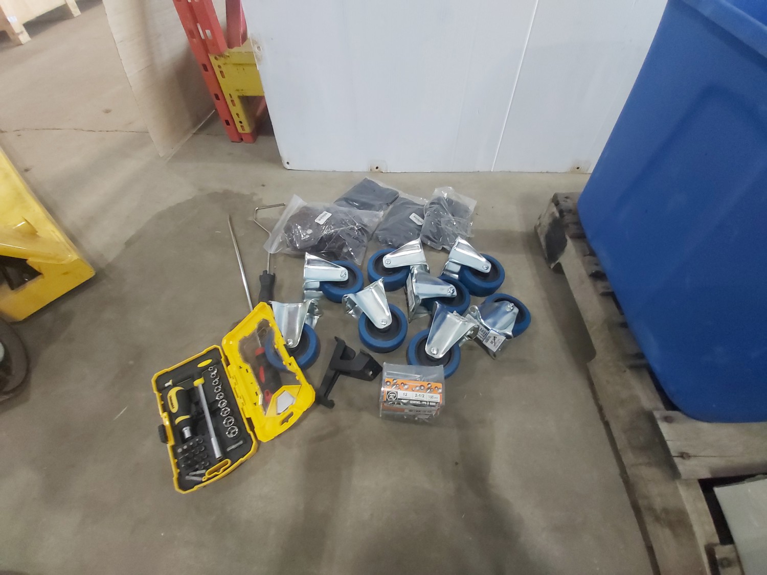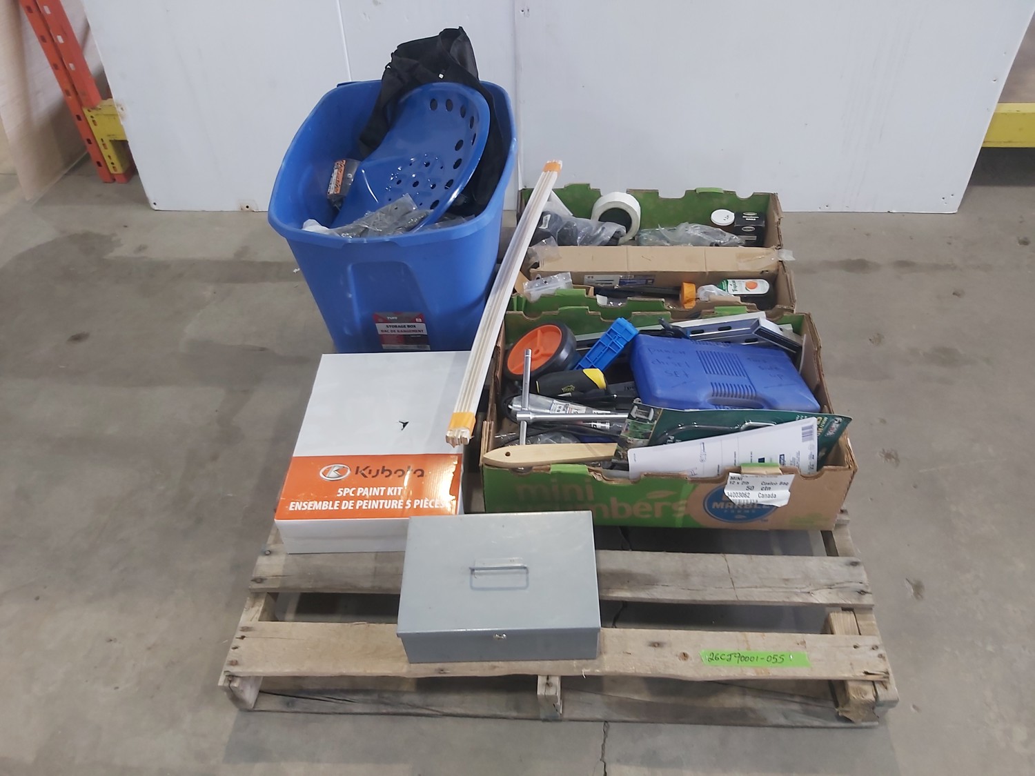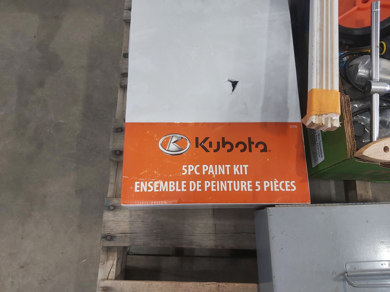 Kubota paint kit, dolly wheels, (2) driver kits, punch and chisel set, sliding drawer hardware, tools, hardware
