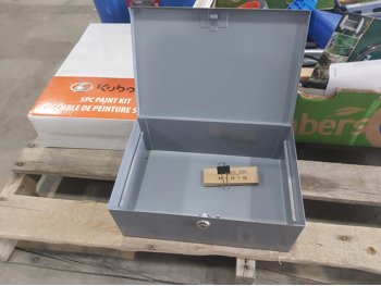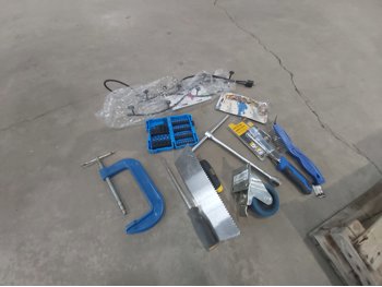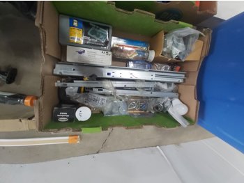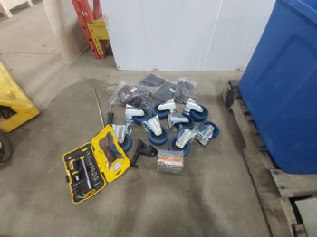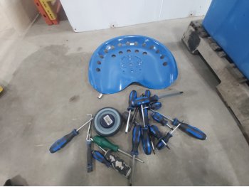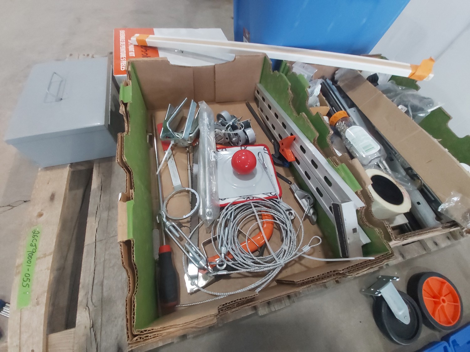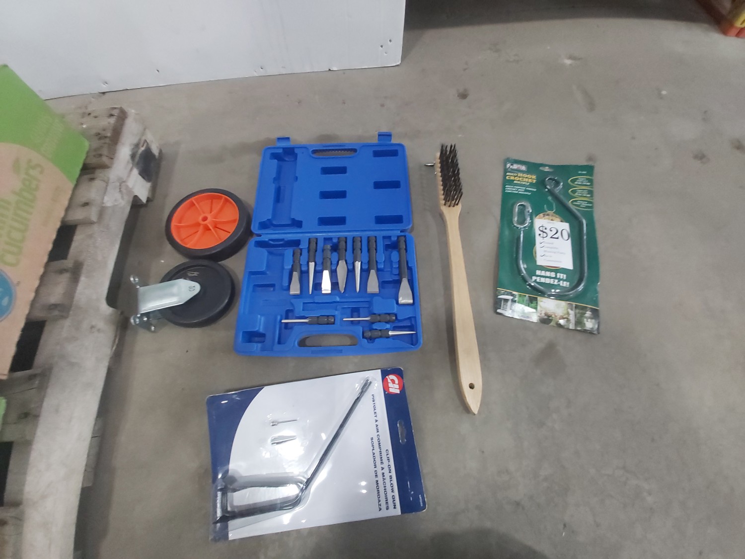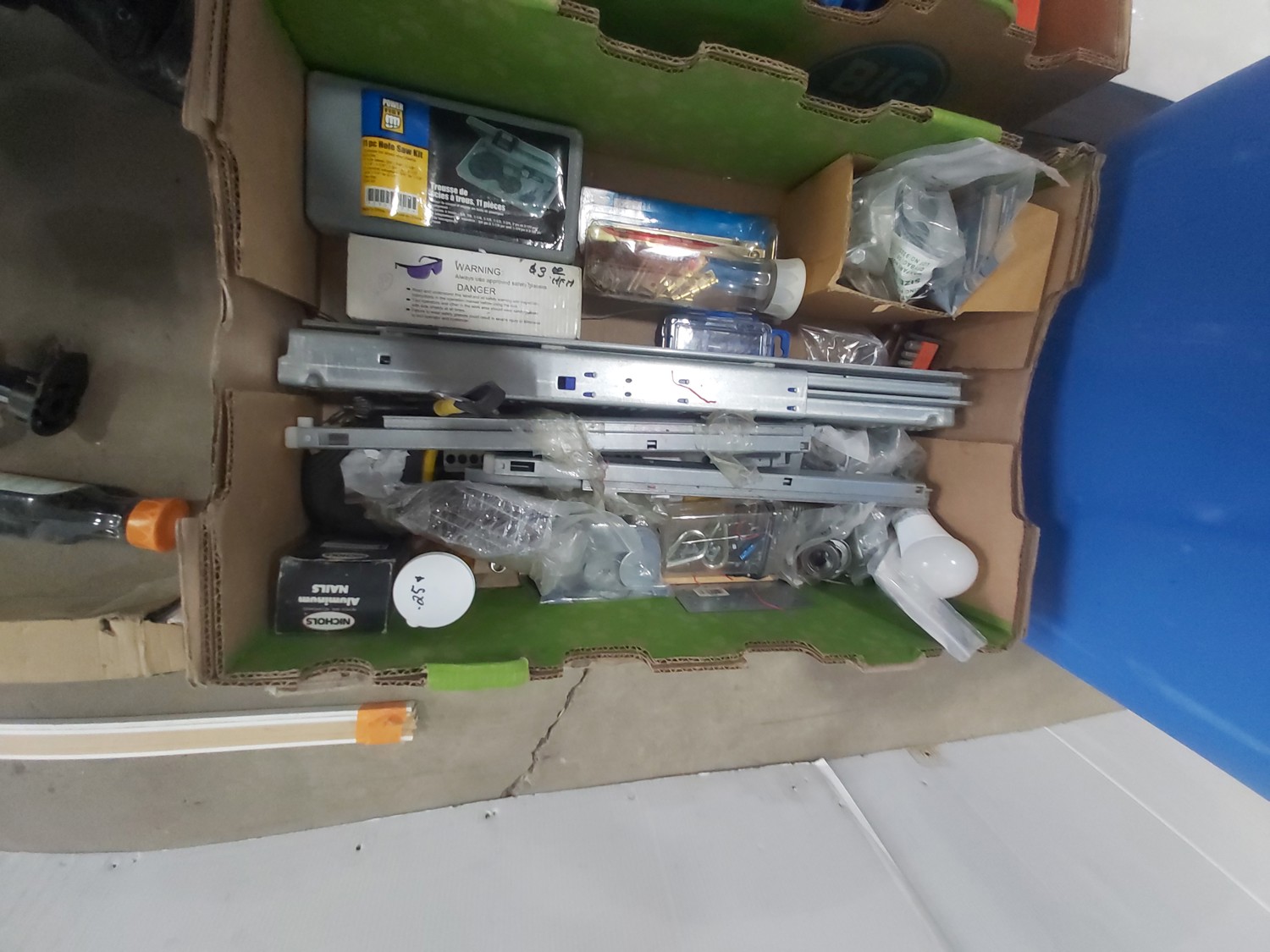 Kubota paint kit, dolly wheels, (2) driver kits, punch and chisel set, sliding drawer hardware, tools, hardware