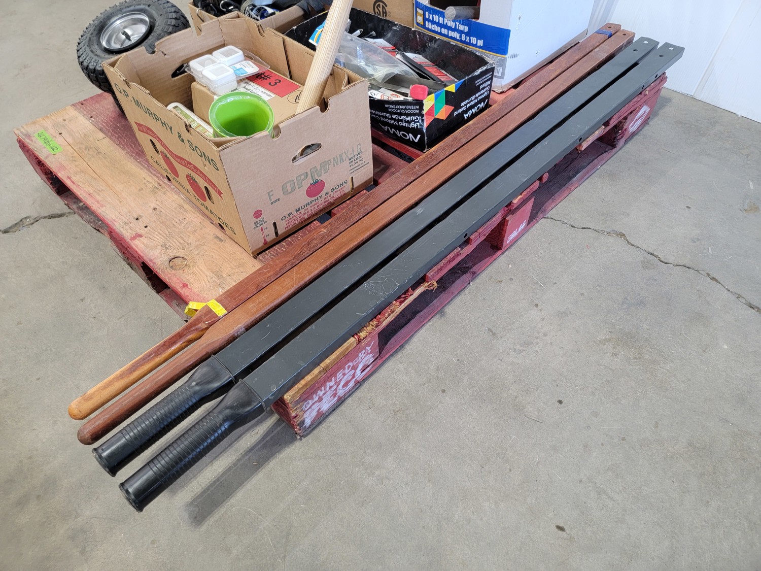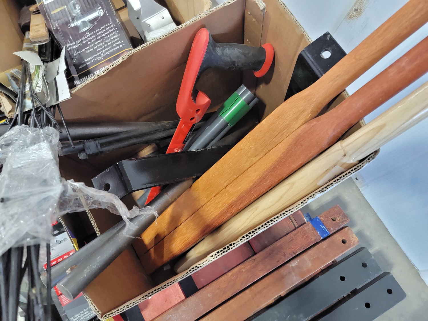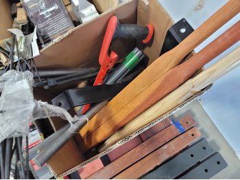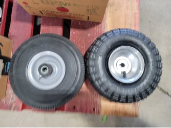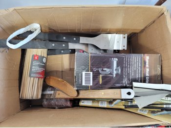 (2) 4.10/3.50-4 tires, bungee cords, bamboo skewers, BBQ brushes, manual meat grinder, sandpaper, small canisters, 59 inch wooden and metal handles