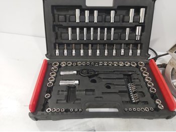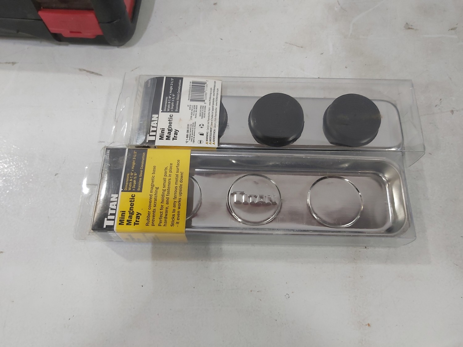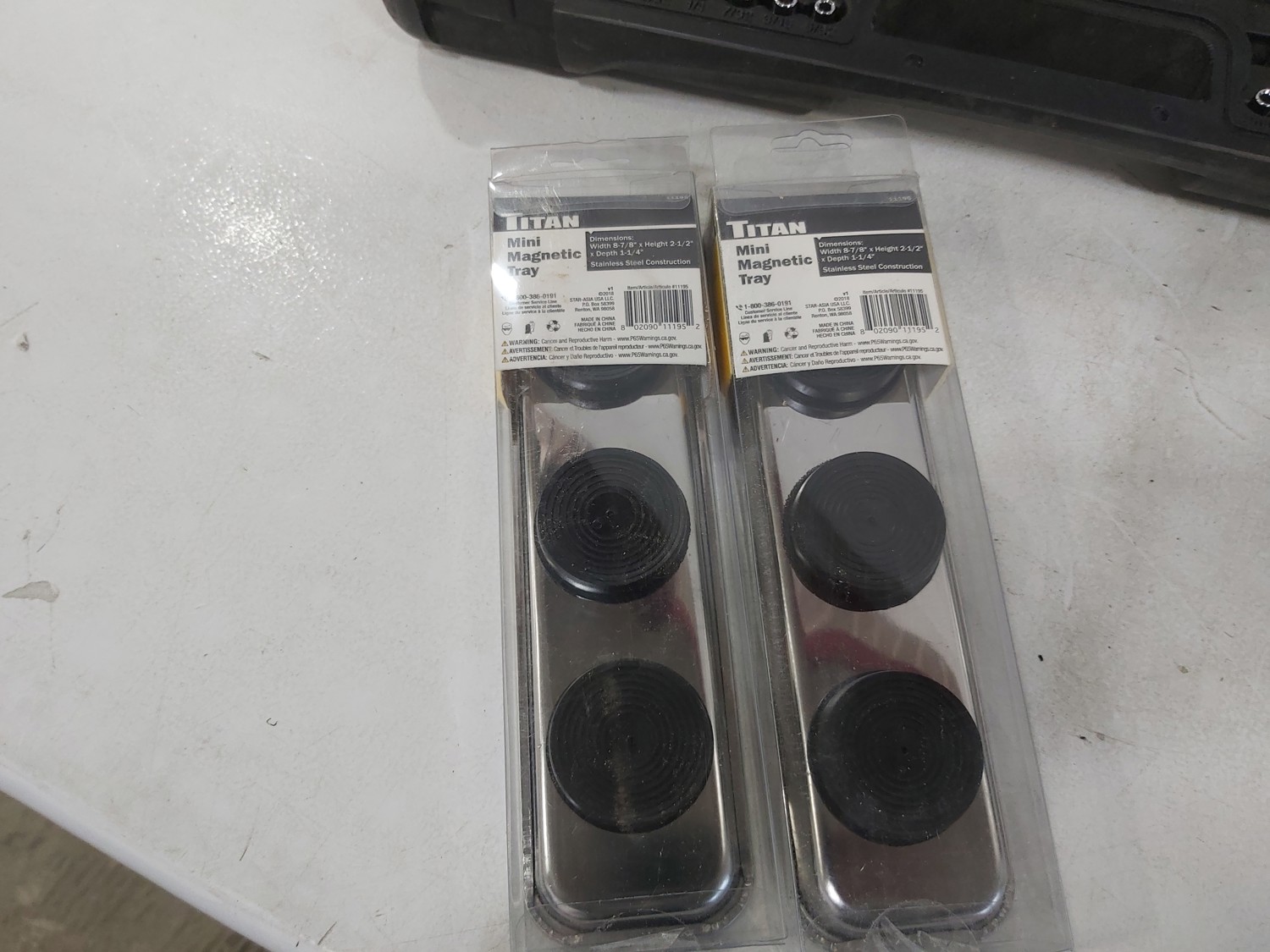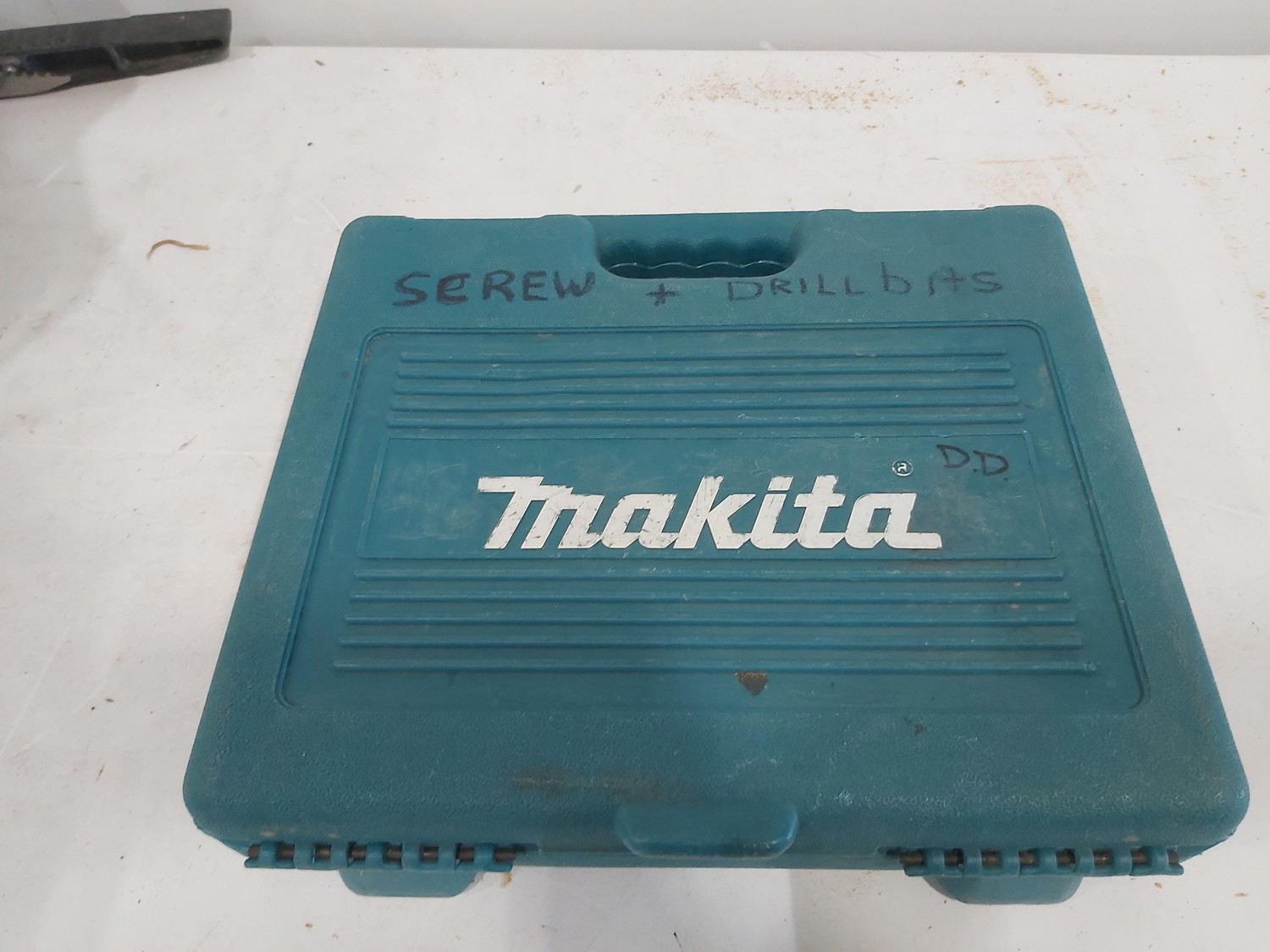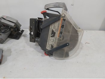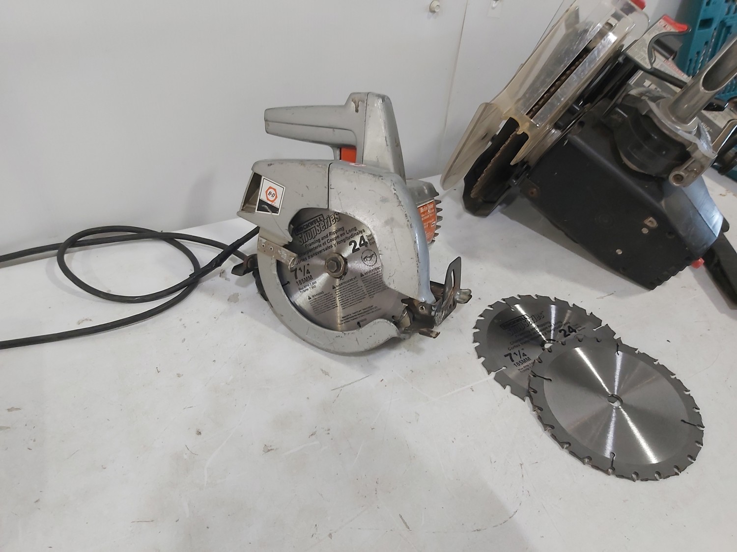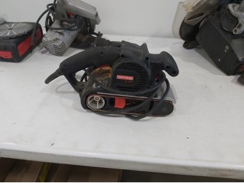 Husky socket set (parts missing), (2) Titan mini magnet trays, Black & Decker 7-1/4 inch circular saw with (2) extra blades, Craftsman 3 inch x 21 inch belt sander, 10 inch radial saw (parts only), Makita screwdriver and drill set (missing pieces)