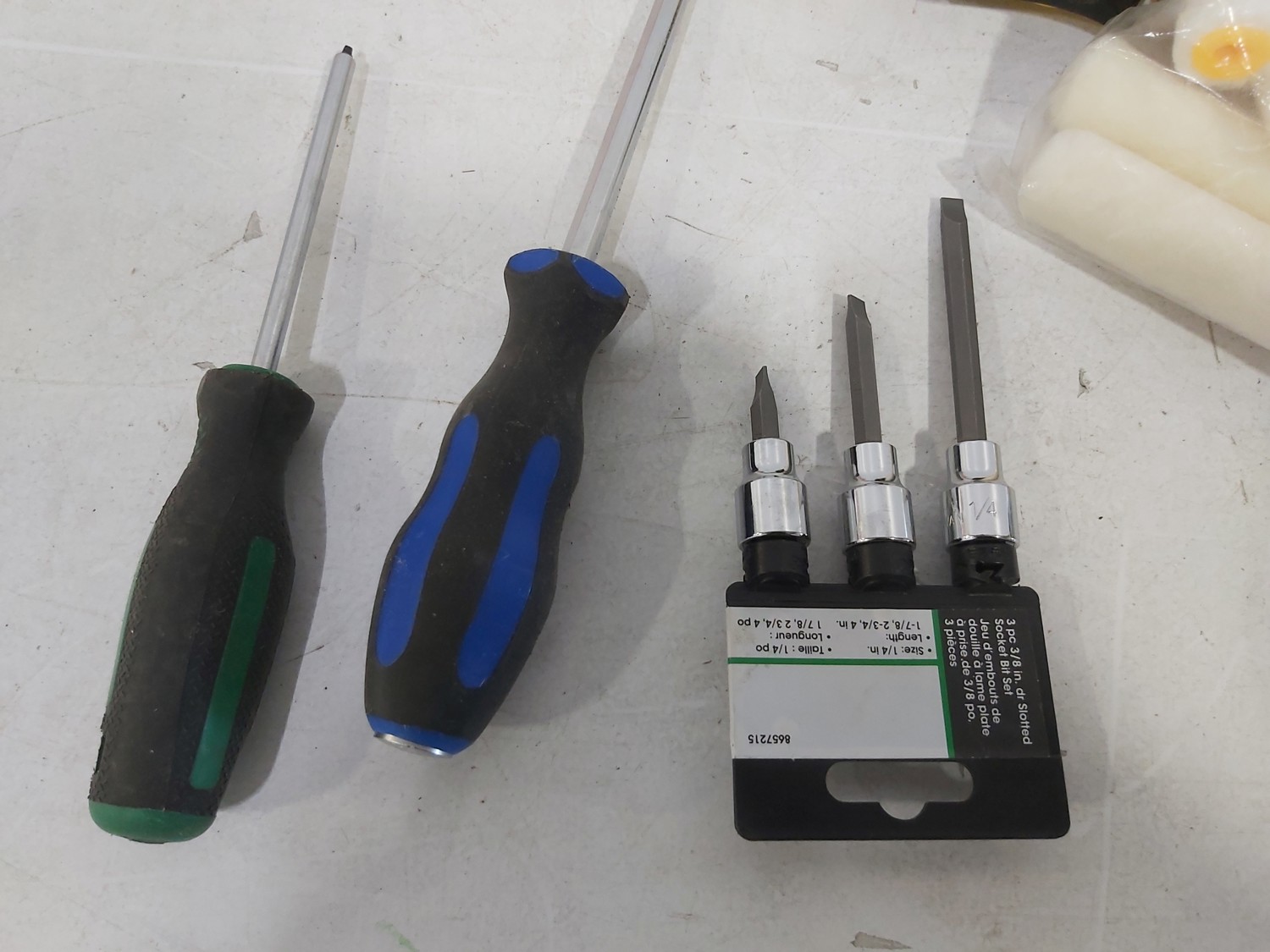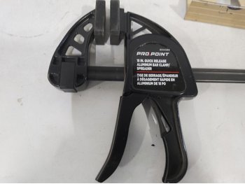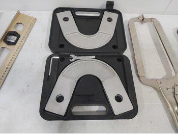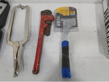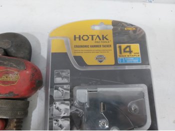 Skil 7-1/4 inch circular saw, Hotak ergonomic hammer tacker, 18 inch quick clamp, 24 inch level, 18 inch Ridgid pipe wrench, welding clamp