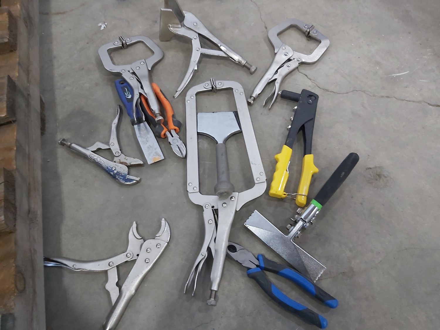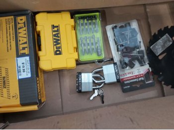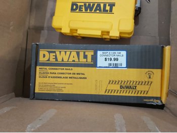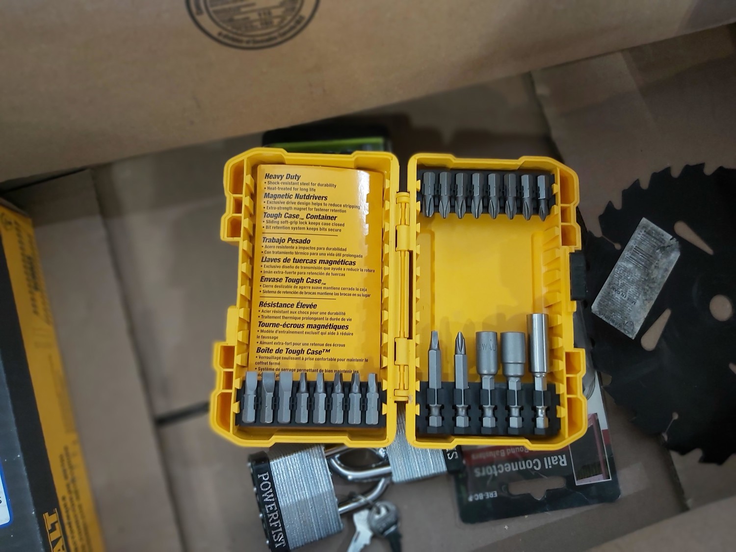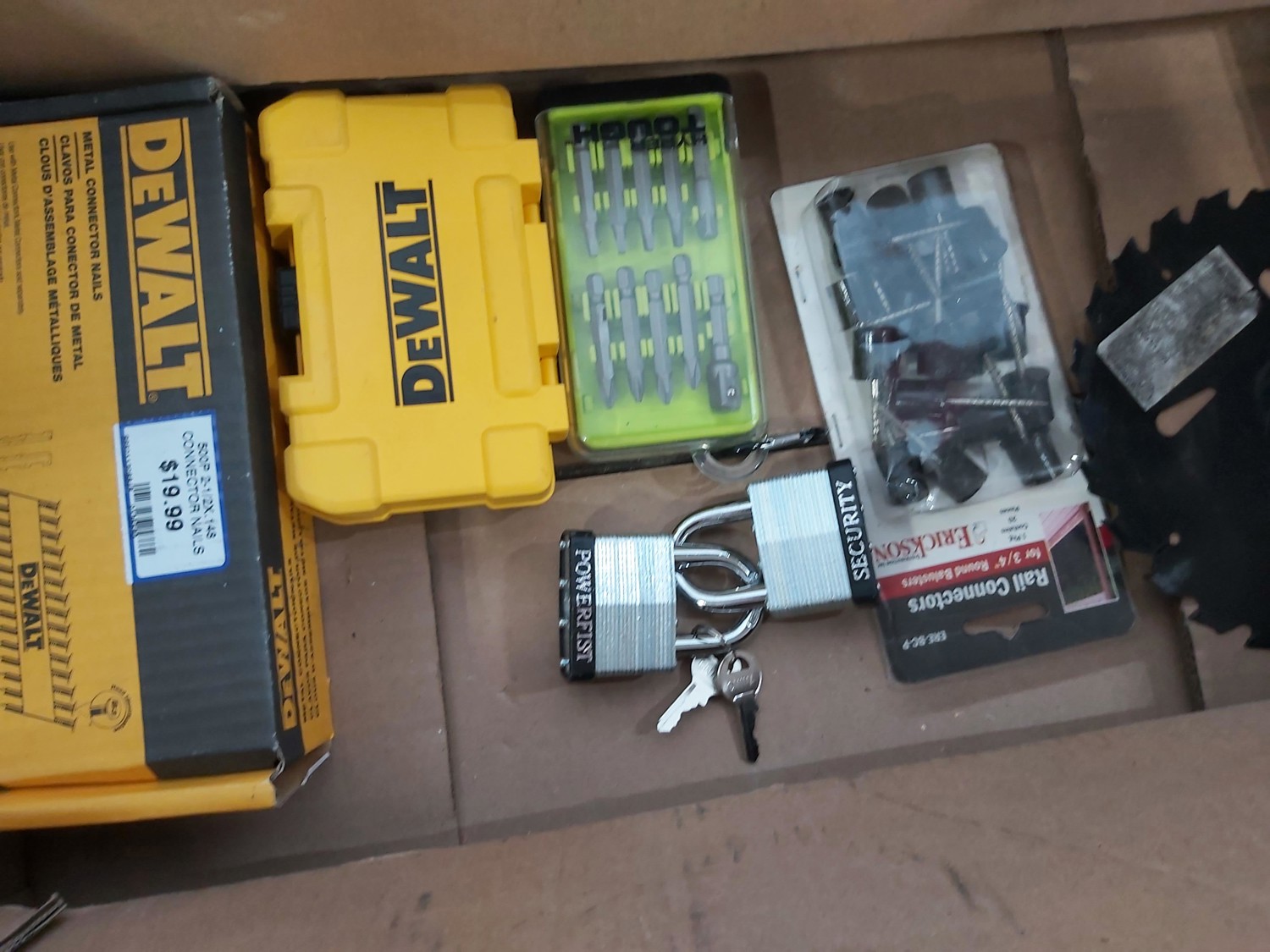 jack-all, 26 inch hand saw, chisel set, (3) 10 inch cut-off blades, 2-1/2 inch DeWalt connector nails, DeWalt driver set, air powered riveter