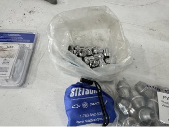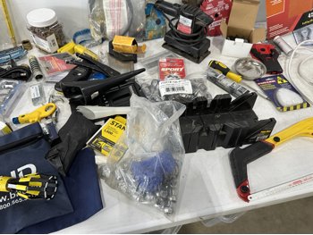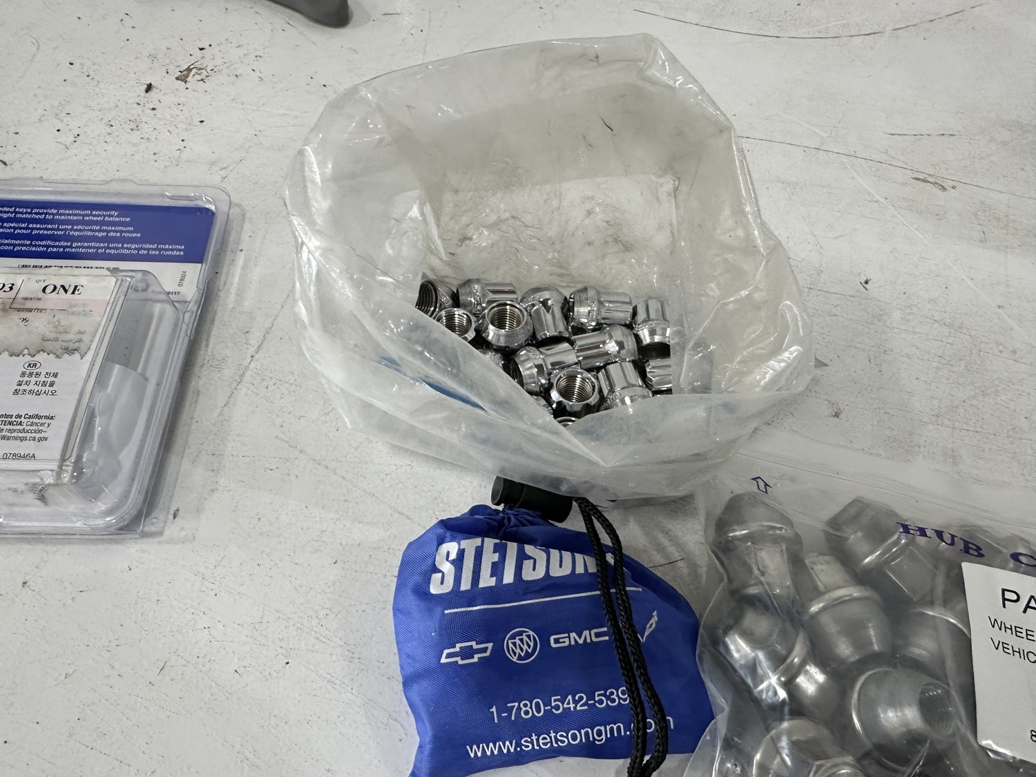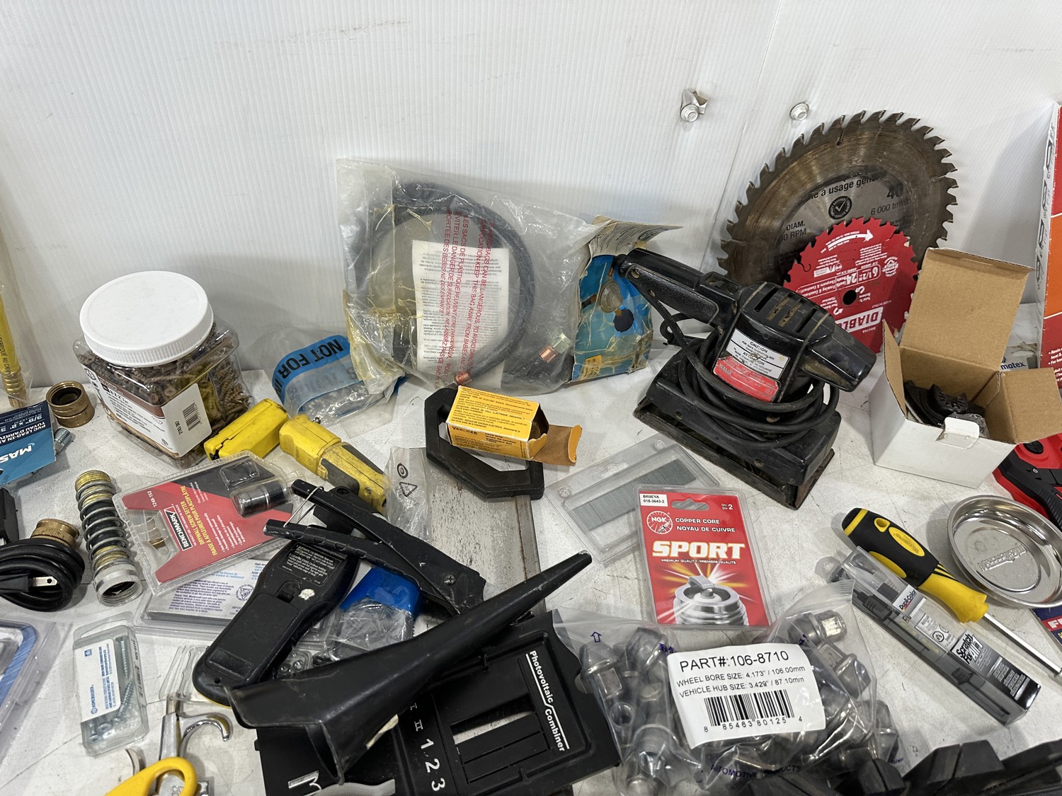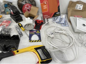 hand saw, tire inflation gun, marrettes, GM wheel locks, saw blades, sandpaper, snap hooks, deck screws