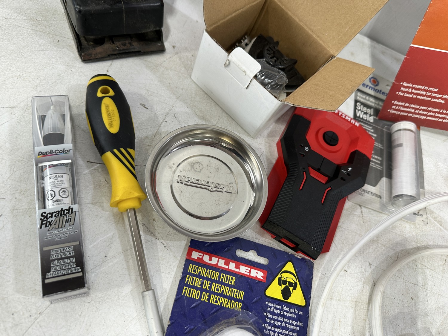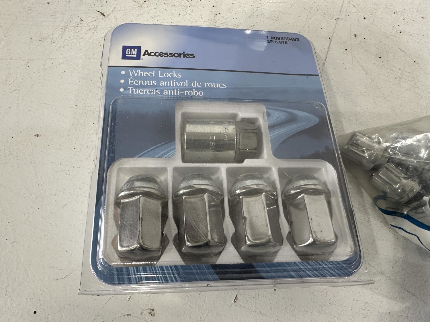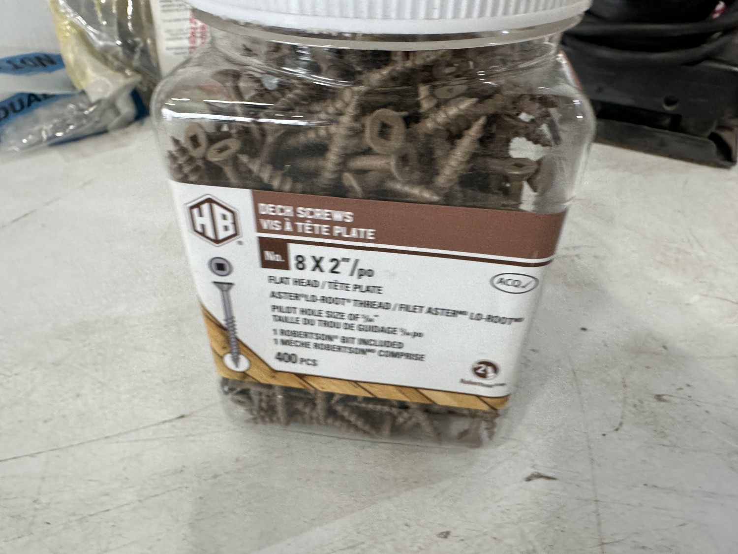 hand saw, tire inflation gun, marrettes, GM wheel locks, saw blades, sandpaper, snap hooks, deck screws