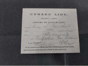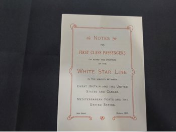 Titanic first class passenger ticket dated 10/4/1912. Titanic landing or custom ticket dated 10/4/1912. White Star Line first class passengers cruise notes