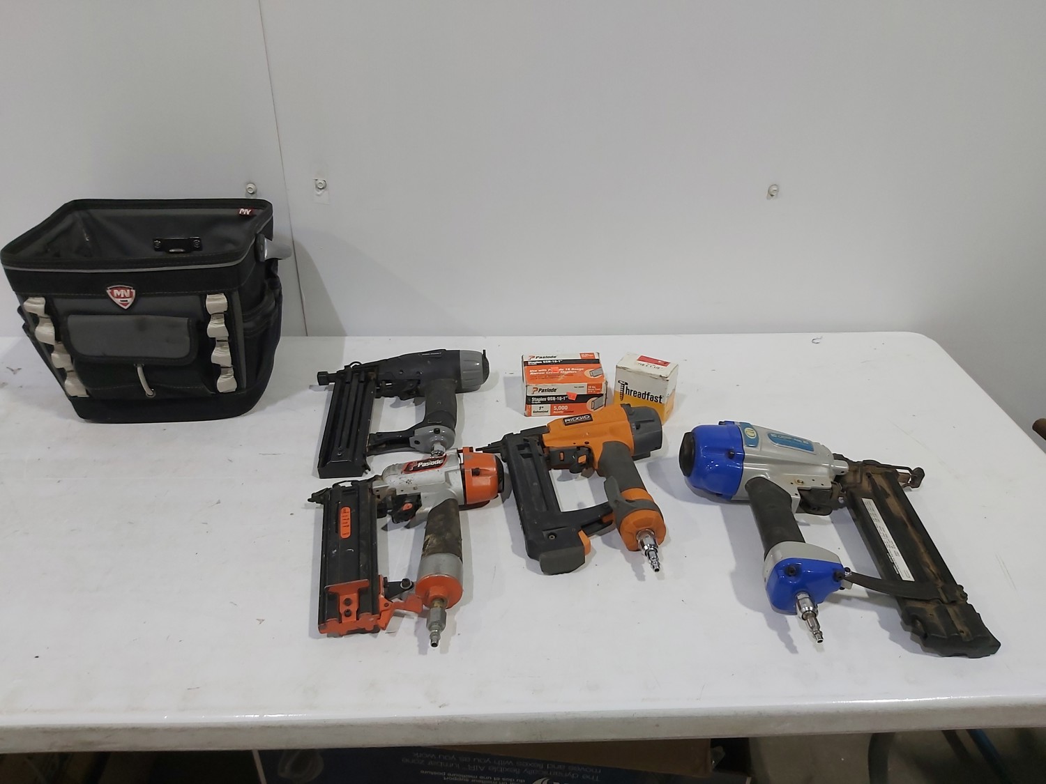 1164 Tool Bag and (4) Air Powered Staple and Nail Guns
