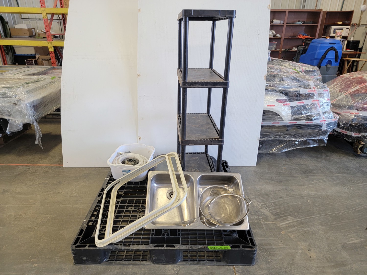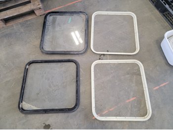 RV sink 25-3/8 inch x 15 inch d x 4 inch h, (2) RV windows 23-7/8 inch x 21-7/8 inch, poly shelf, 1/2 inch tubing