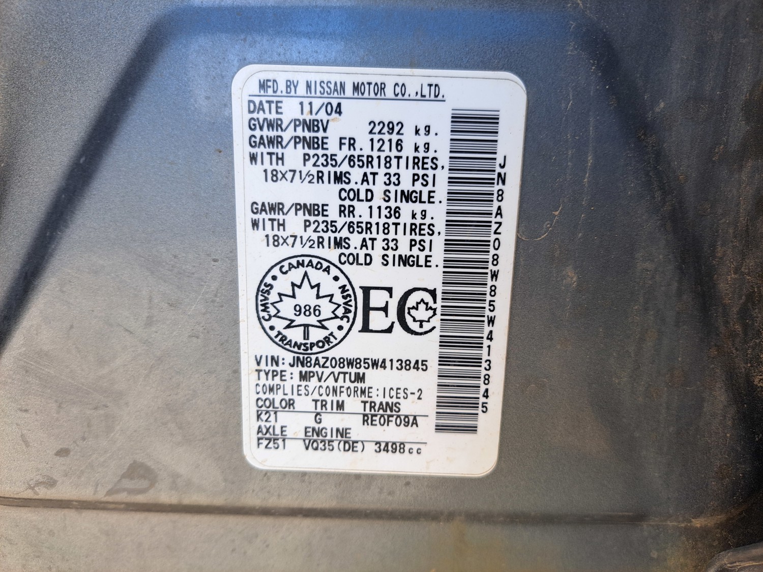 3.5 L, V6, gas, automatic transmission, leather, P/W, P/L, A/C, sunroof, heated seats, 235/65R18 tires