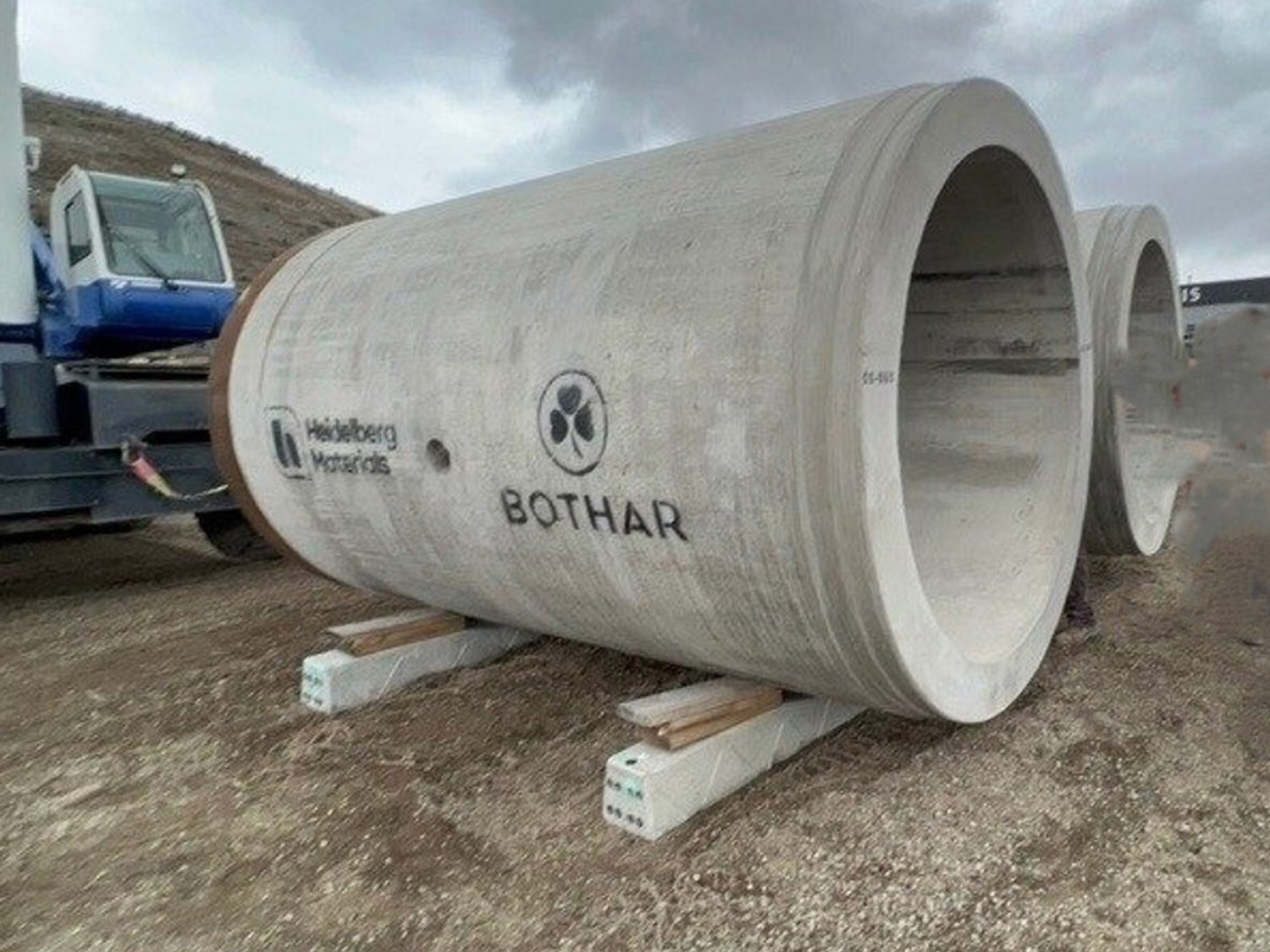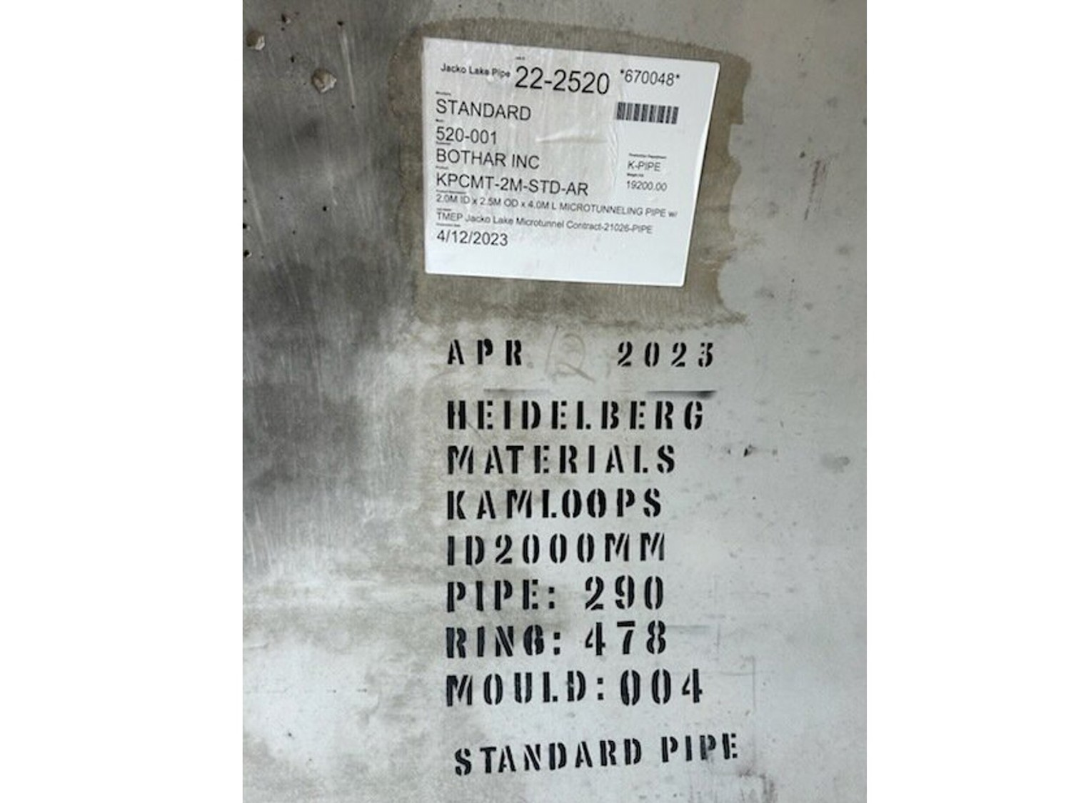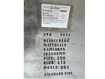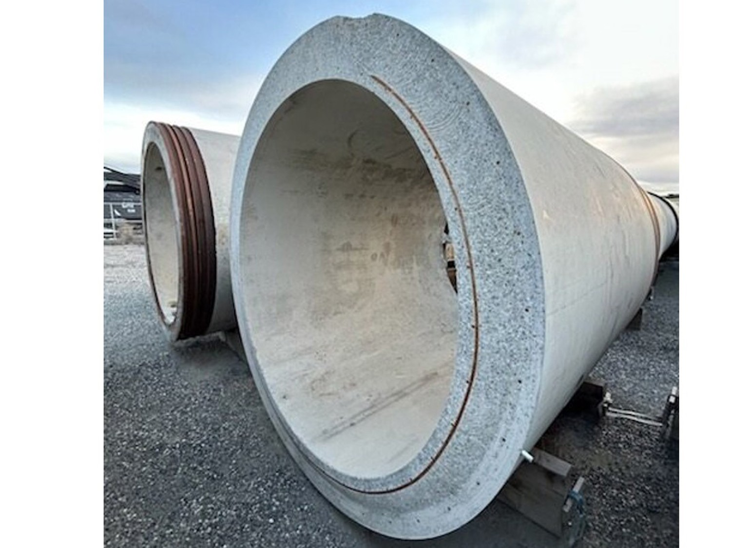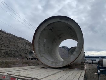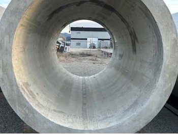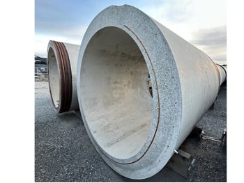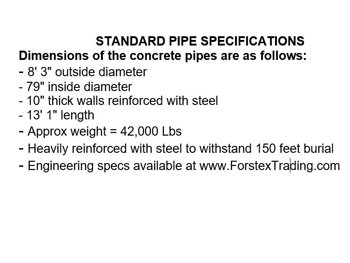 8 ft 3 inch outside diameter, 79 inch inside diameter, 10 inch thick walls reinforced with steel, 13 ft 1 inch length, approximately weight: 42,000 lb, heavily reinforced with steel to withstand 150 ft burial, engineering specs available at www. ForstexTrading. com, *Loading and Shipping is the responsibility of the buyer; Must ship in the month of April (unless seller agrees to other arrangements); Seller can assist with getting competitive rates on loading and transport; Wood bases included (or upgrade to concrete - see seller)