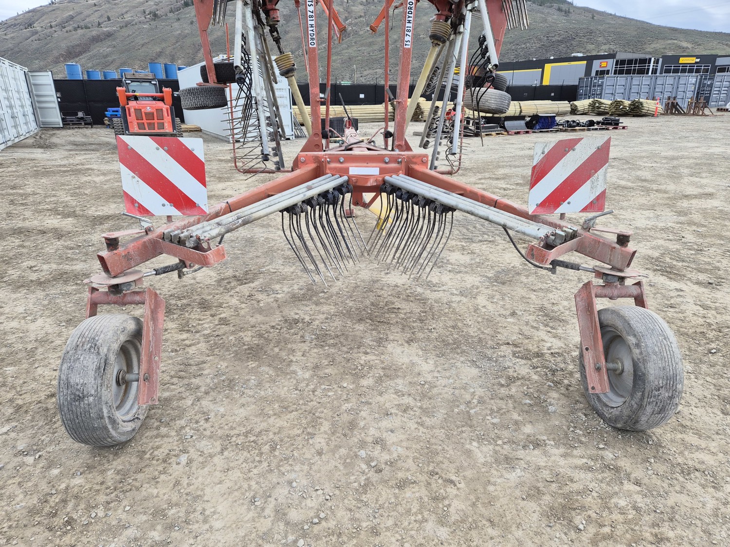 3-Point Hitch, 540 PTO, hydraulic drive, hydraulic fold, 12 tine arms per rotor, 4-double prong tines per arm, 215/65/15 tires