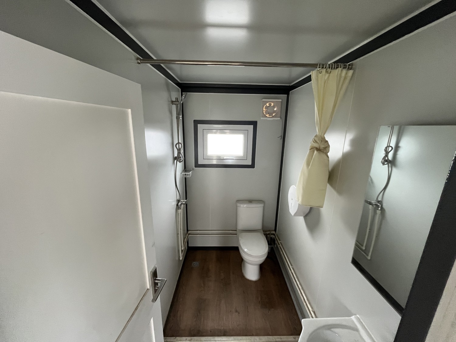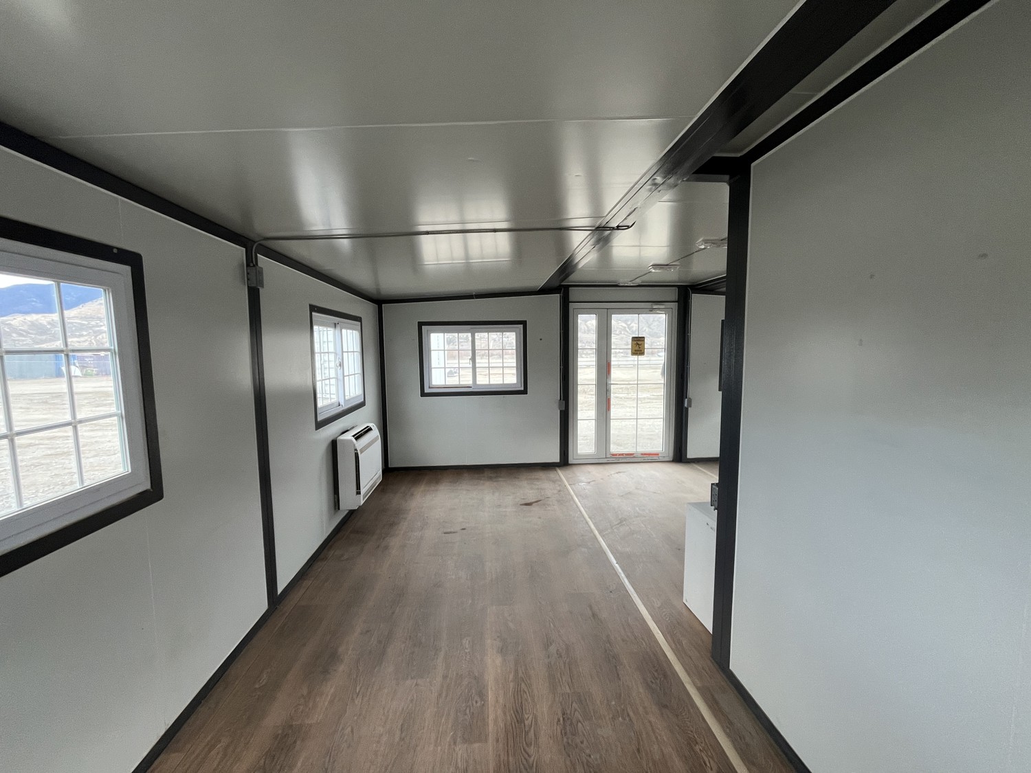 20 ft x 19 ft indoor area 349.7 sq ft, indoor height 7.45 ft, 7395 lb shipping weight, 18,000 BTU, 3 phase AC/heat unit included, bathroom/plumbing unused* additional wiring and LED lights included