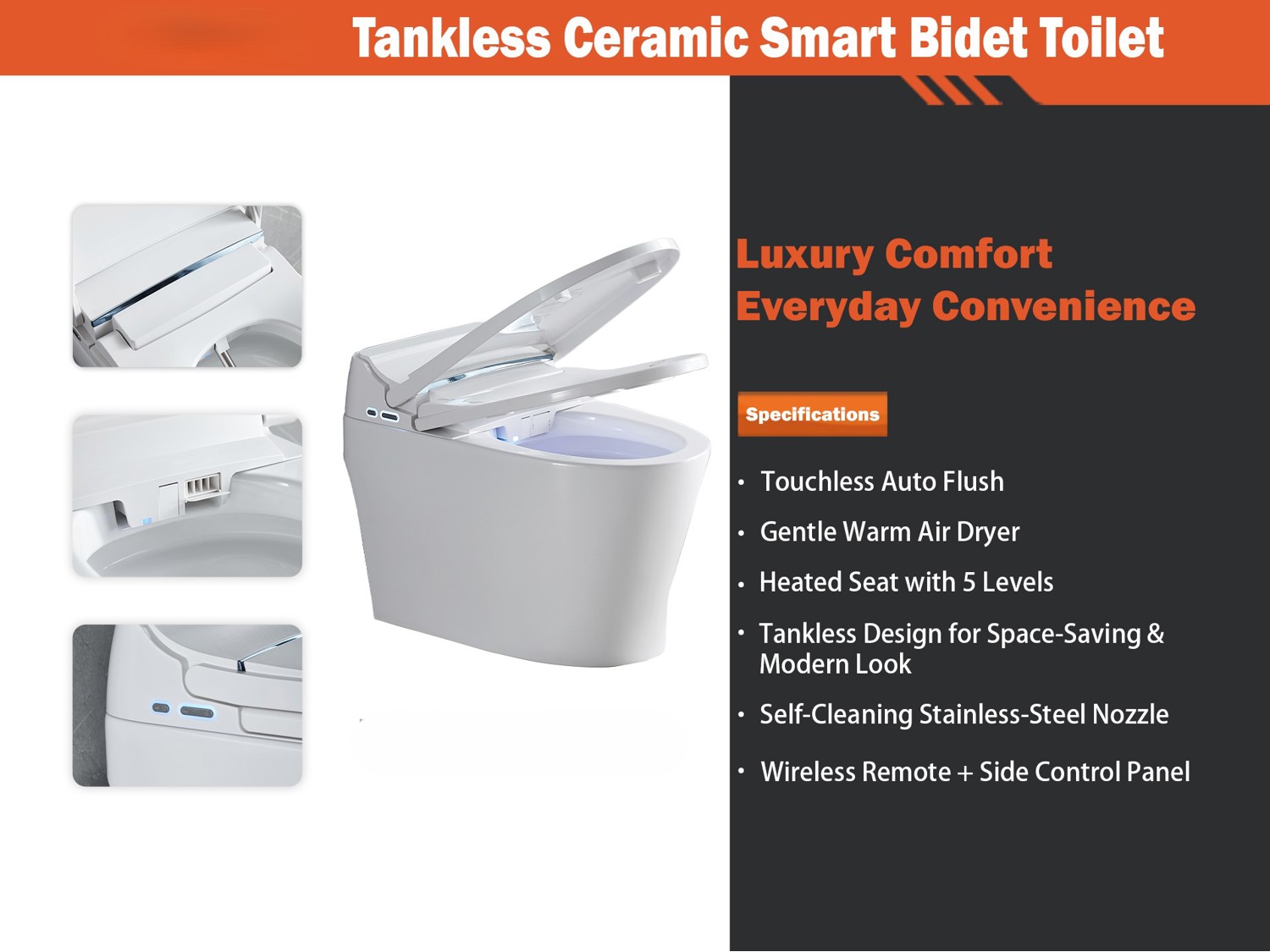 Tankless ceramic design, heated seat with 3 levels and warm air dryer. Self-cleaning stainless-steel nozzle, wireless remote, side panel, and auto flush. Power outlet needed*