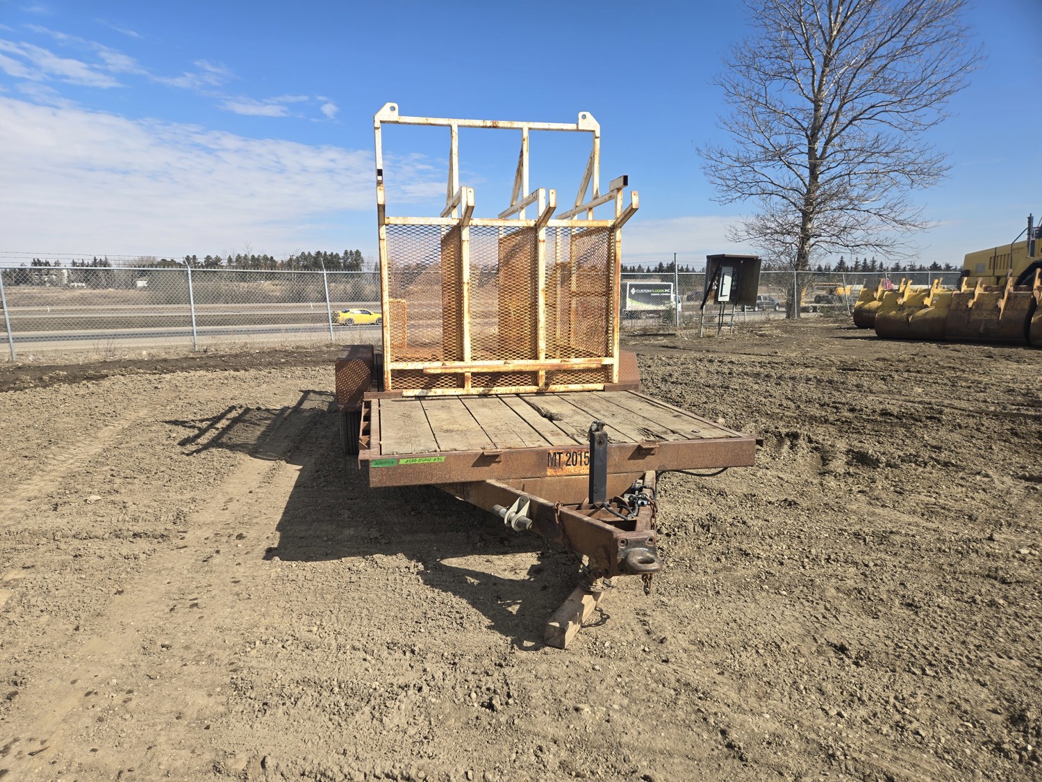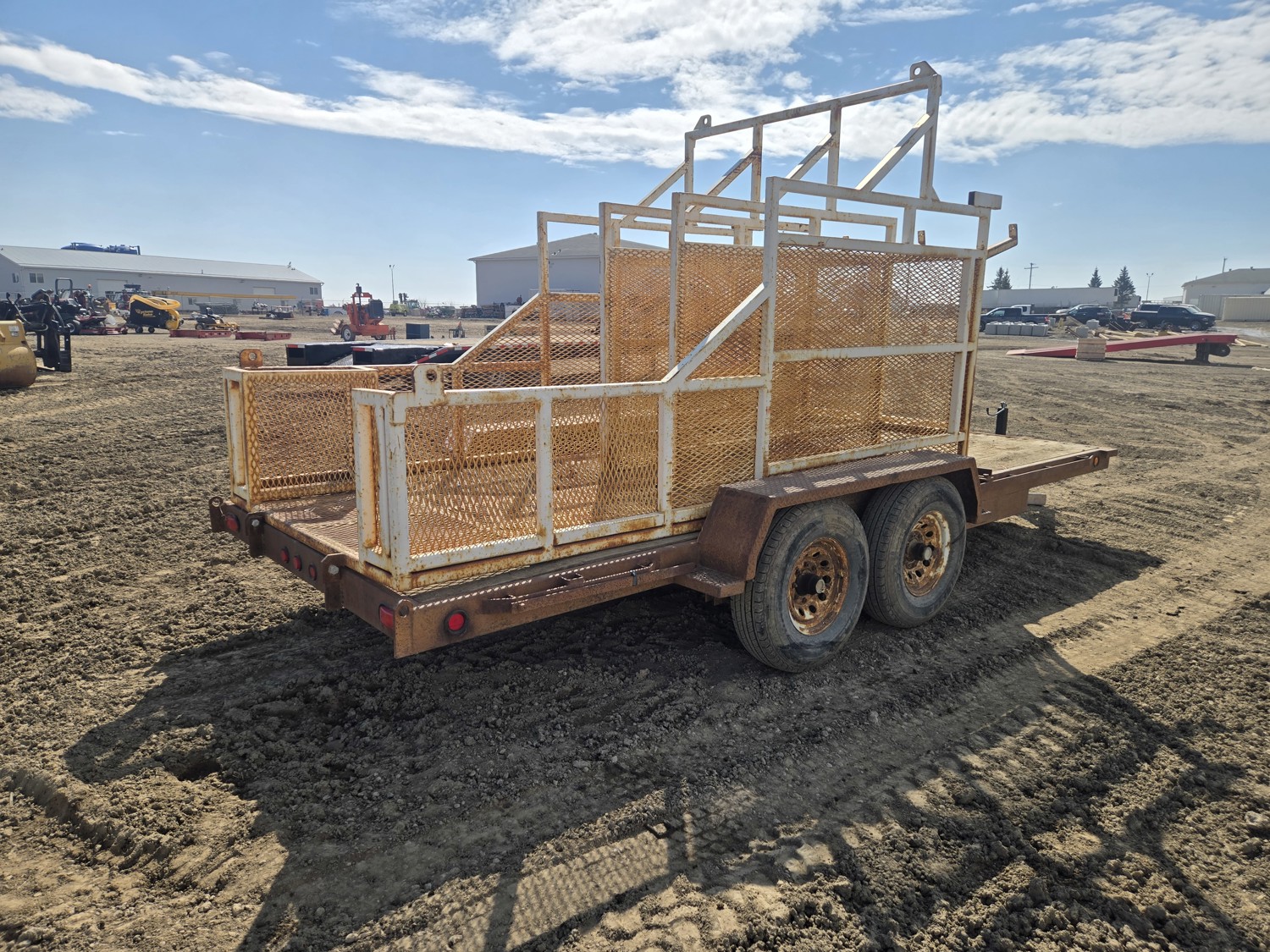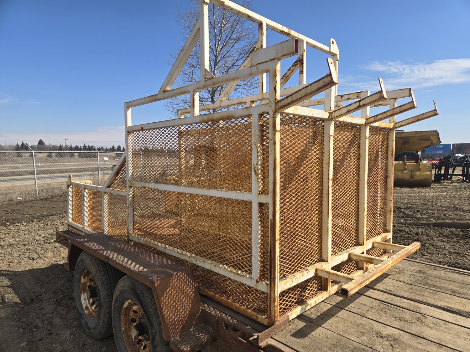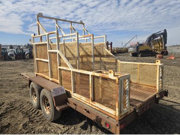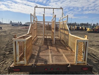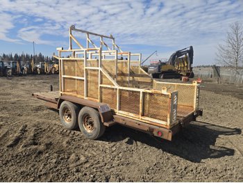 80 inch wide deck, wood deck, electric brakes, spring suspension, rub rails, stake pockets, pintle hitch, 6 ft wide X 12 ft long metal mesh rack, 7000 lb axles, 235/80R16 tires