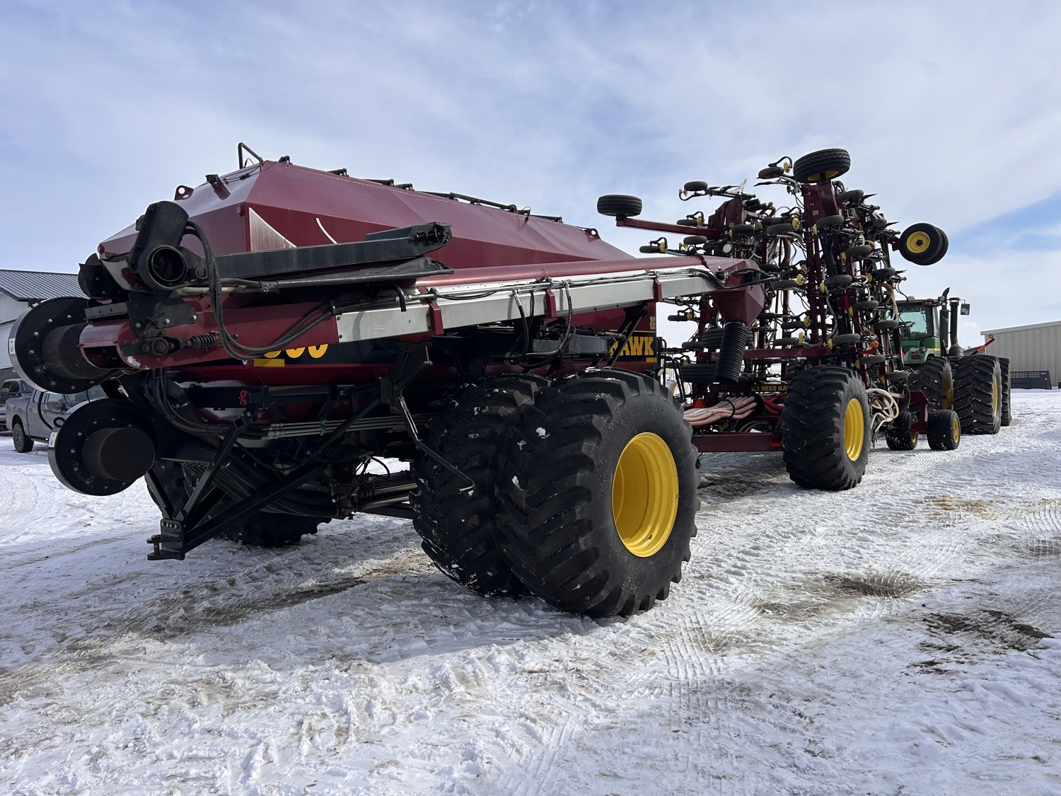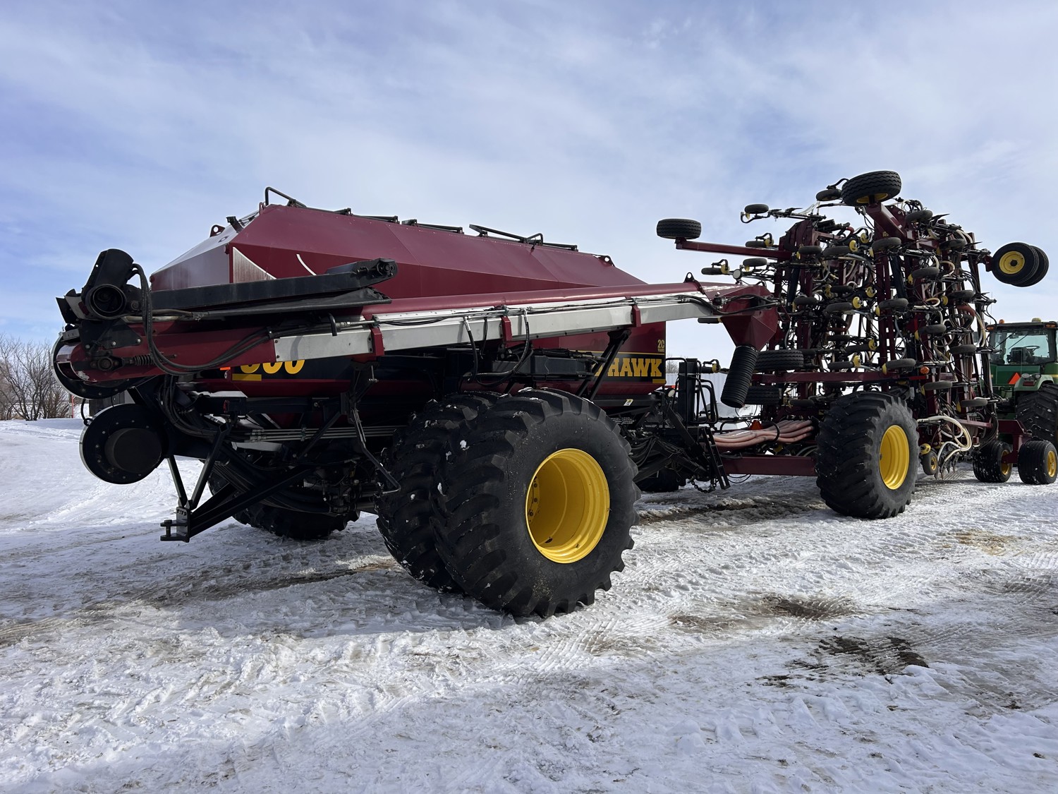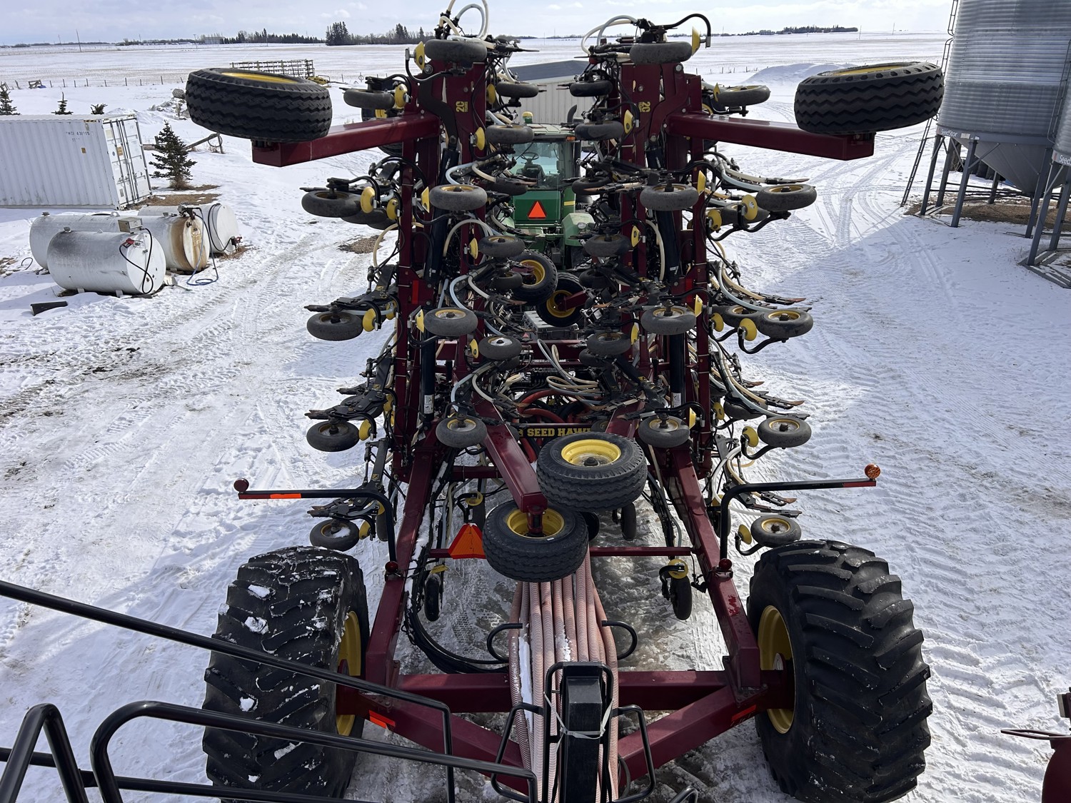 12 inch spacing, double shoot Seedhawk openers, 4 inch semi pneumatic packers, seed monitor, blockage sensors, rear hitch camera, Devloo mud scrapers All run Intelligent AG blockage system, new in 2022., Air Cart: 3 compartments, 15 inch loading conveyor, double fan, variable rate metering, sectional control, 4 tank cameras, New conveyor belt 2026., Accumulator kit to accommodate tractors with smaller hydraulic pumps! , dual 30.5L-R23 rear tires