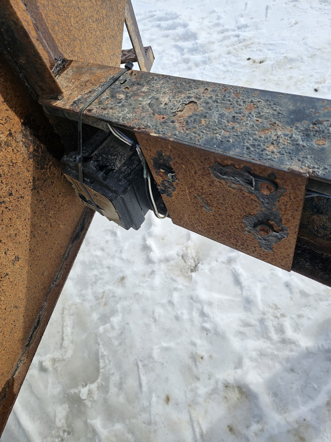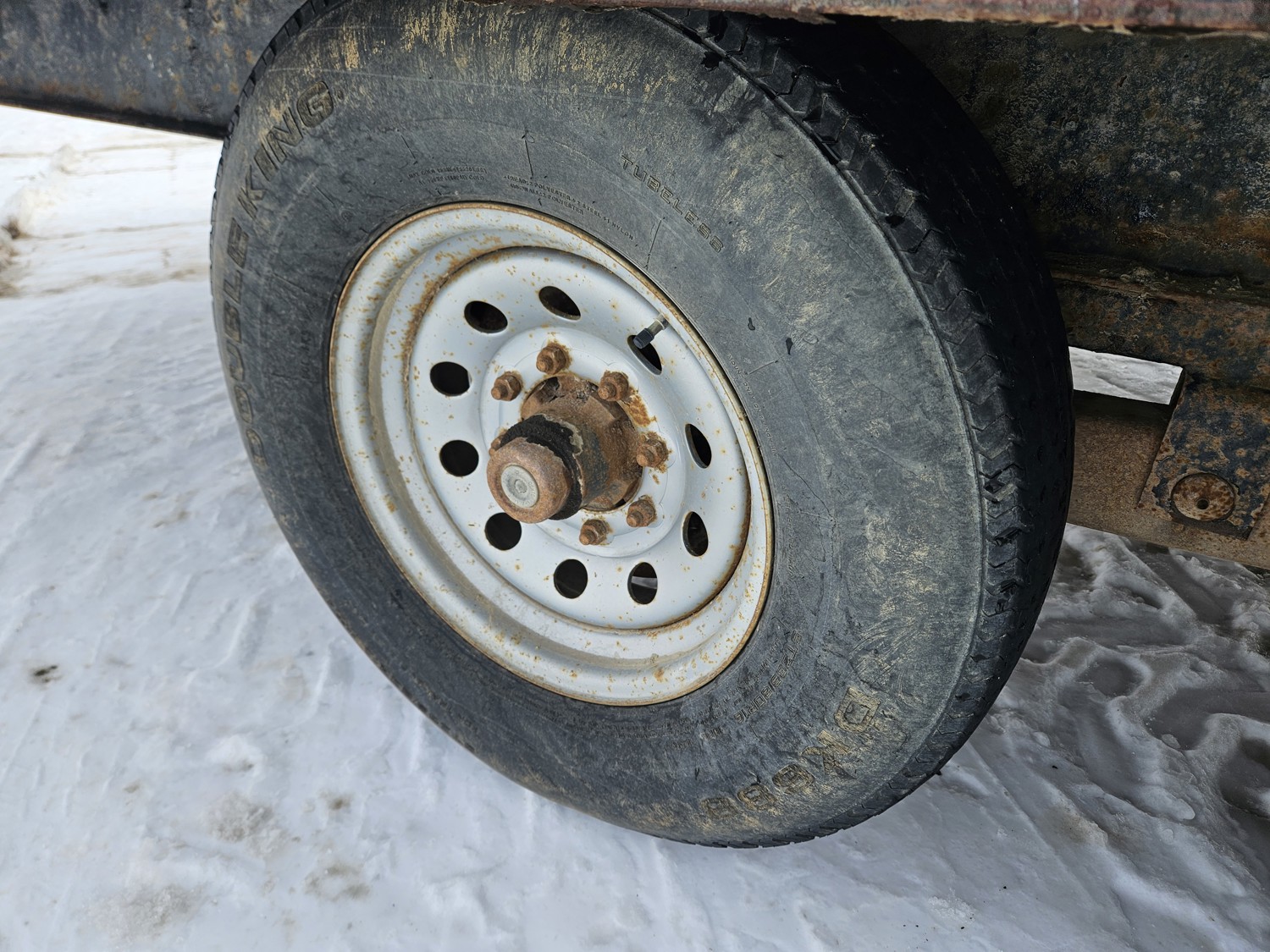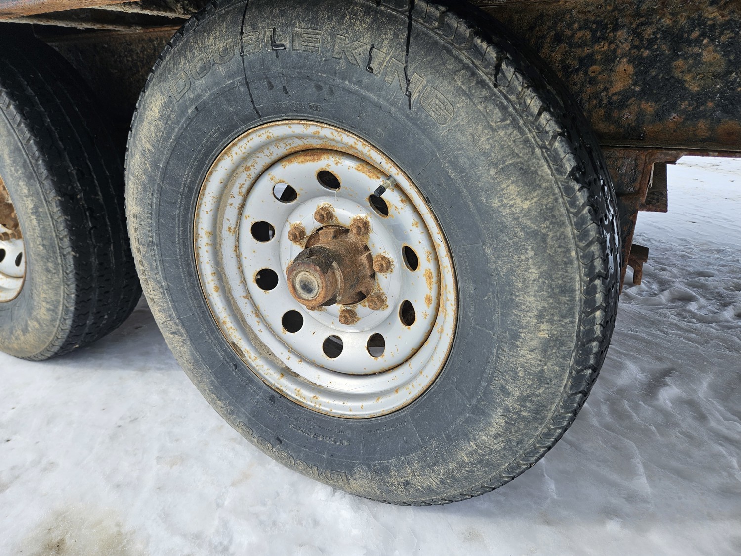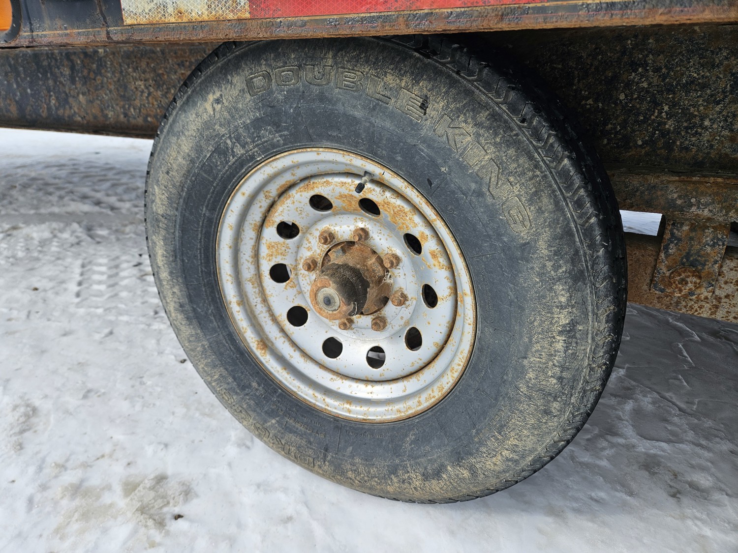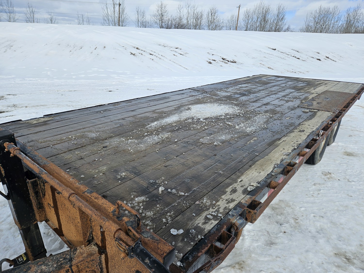 95 inch wide deck, wood deck, slide in ramps, spring suspension, ball hitch, tool / storage box, rub rails, stake pockets, 235/80R16 tires