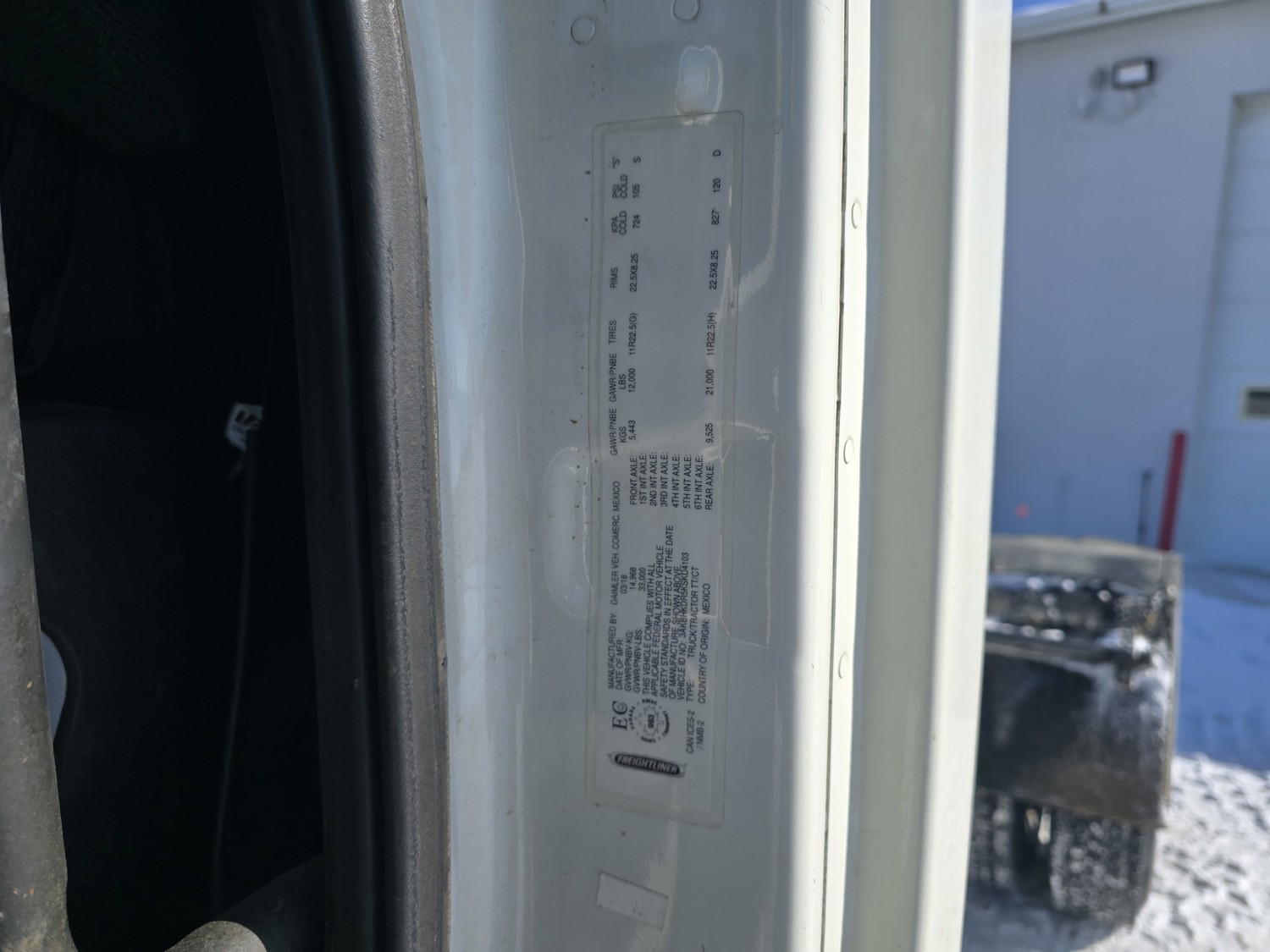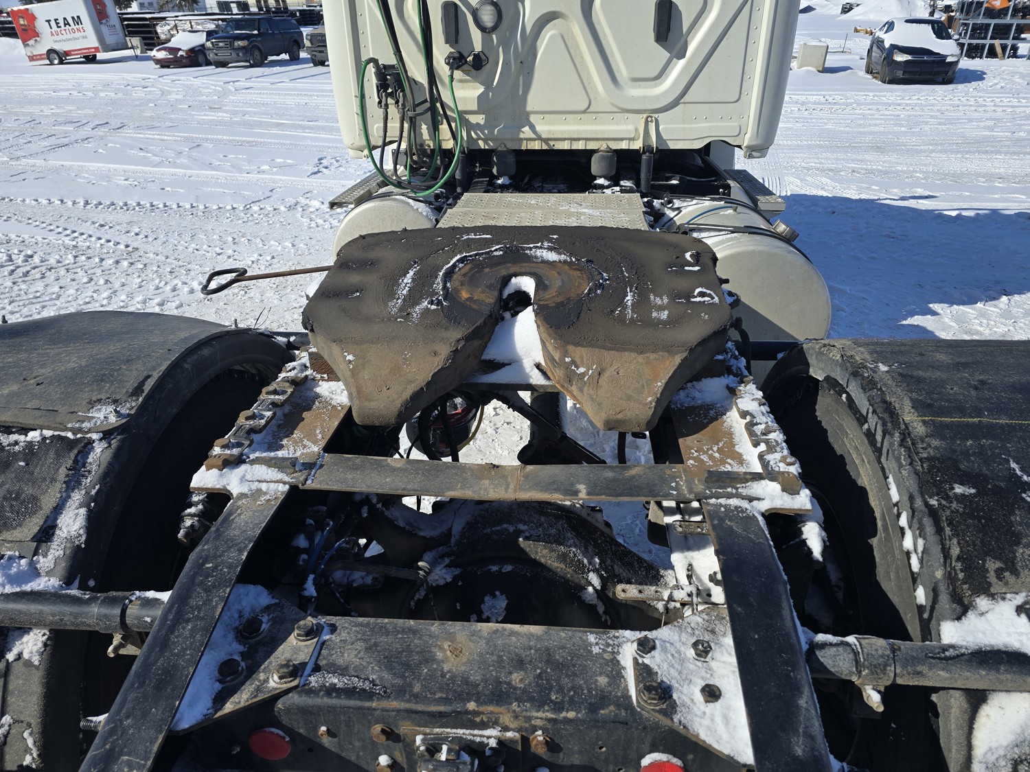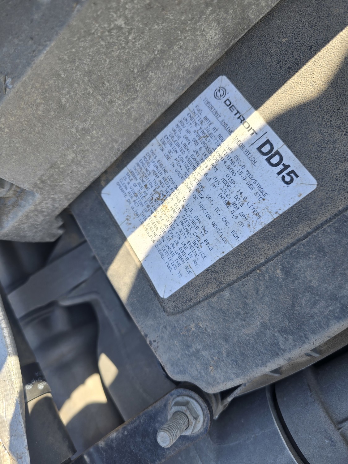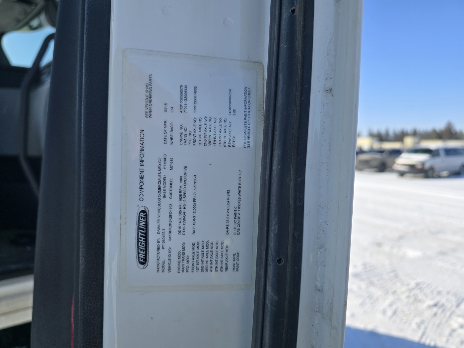 Detroit DD15 14.8 L 6 cylinder 505 HP diesel engine, DEF required, engine block heater, DT15-1550 12 speed automatic transmission, A/C, cruise control, air ride driver seat, stereo, Bendix blind spot detection, Airliner air ride suspension, 12,000 lb front axle, 21,000 lb rear axles, diff lock, 3.08 ratio, 174 inch WB, all aluminum wheels, 11R22.5 front tires
