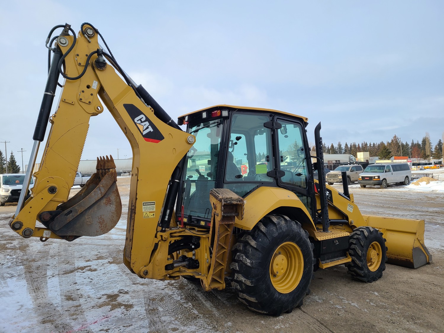 Enclosed cab, A/C, air ride seat, DEF required, 4 speed powershift transmission, engine heater, electric circulating block heater, 96 inch smooth loader bucket, 24 inch dig backhoe bucket, hydraulic Q/C coupler, outriggers, 12.5/80-18IMP front tires, 21L-24 rear tires