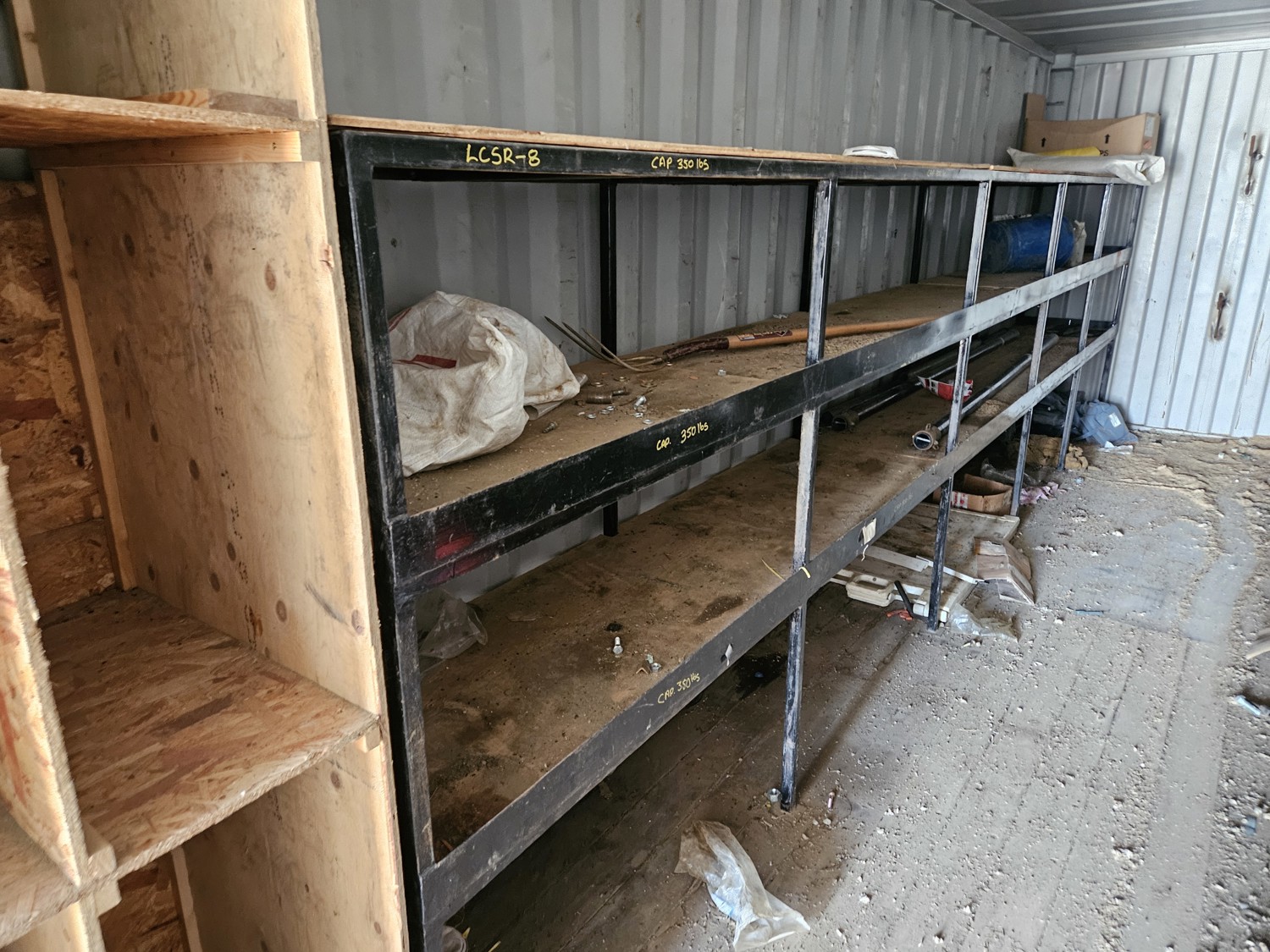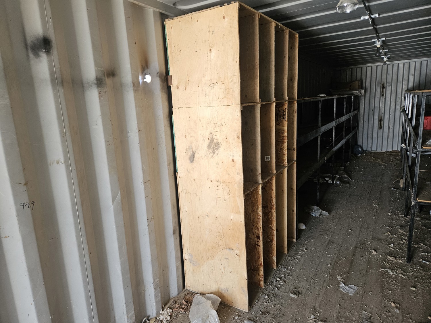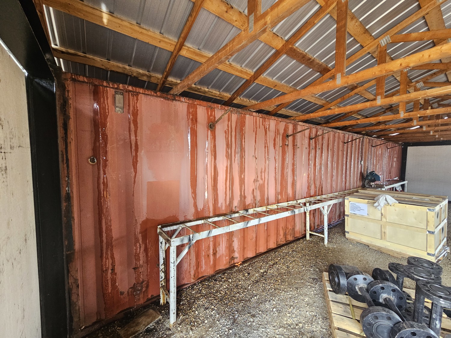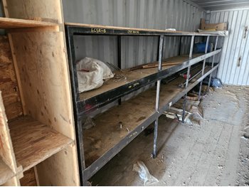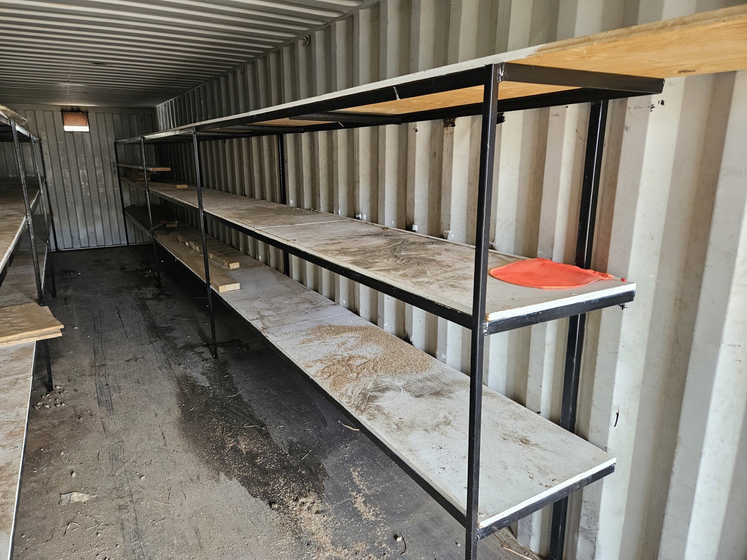 (2) 40 ft shipping containers standard height, 28 ft x 40 ft roof, wooden truss, tin roof, double rolling barn doors, (4) metal shelves, Makita chop saw (untested), 20 ft x 40 ft interior dimensions, 6 inch i beam end walls, Buyer is responsible for all disassembly and removal. There will not be equipment on site
