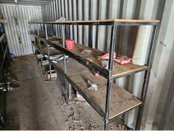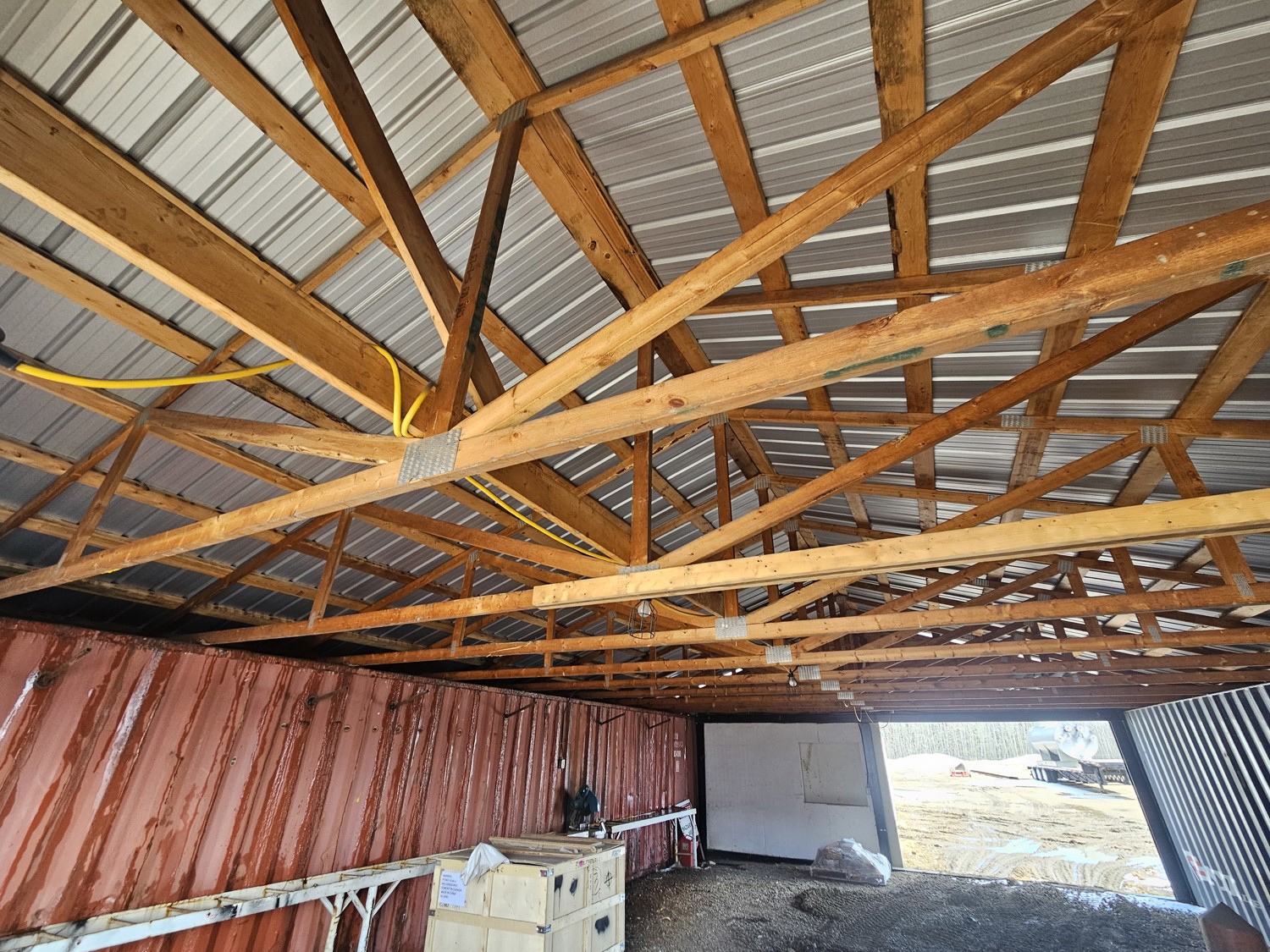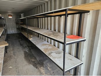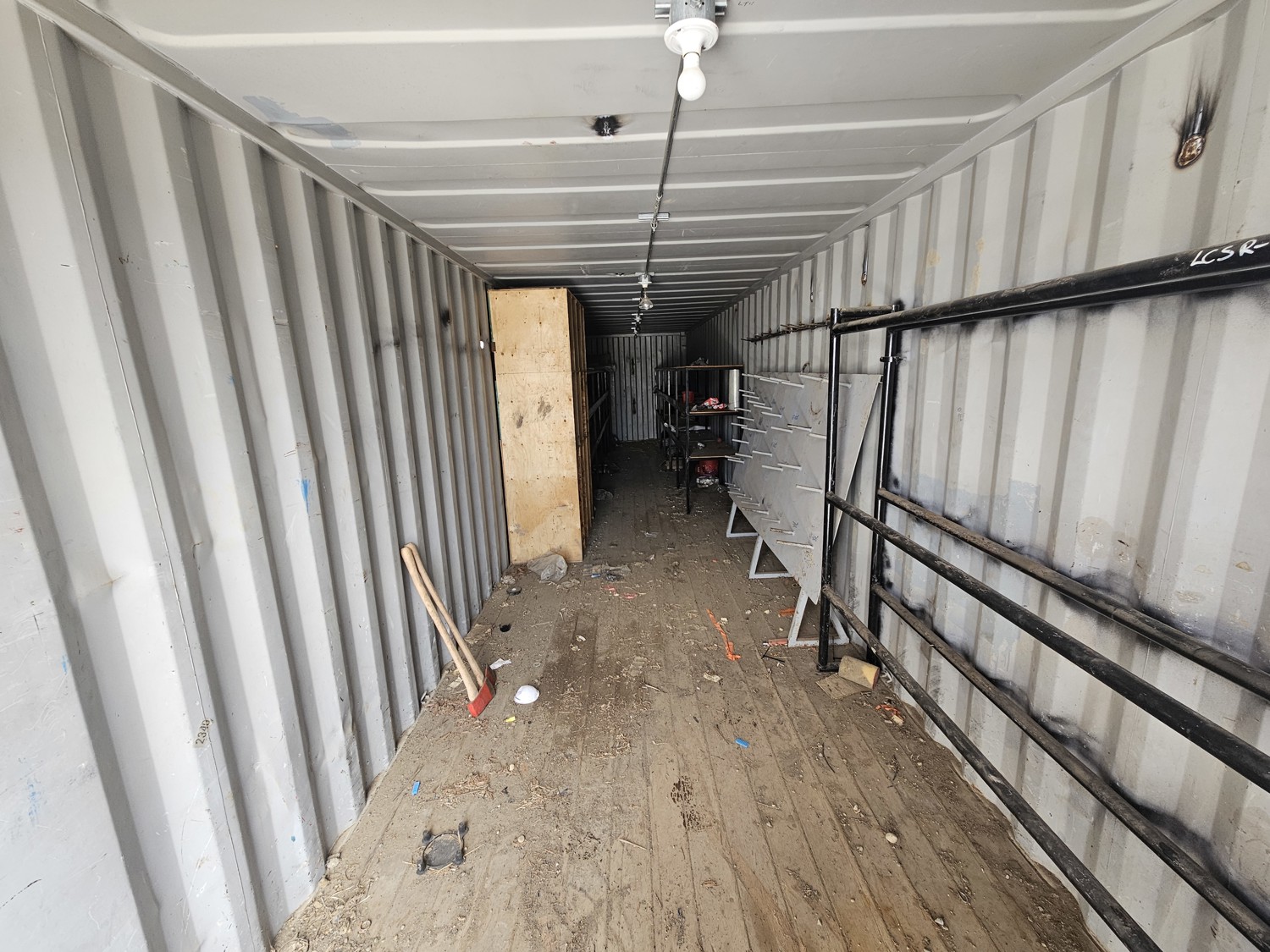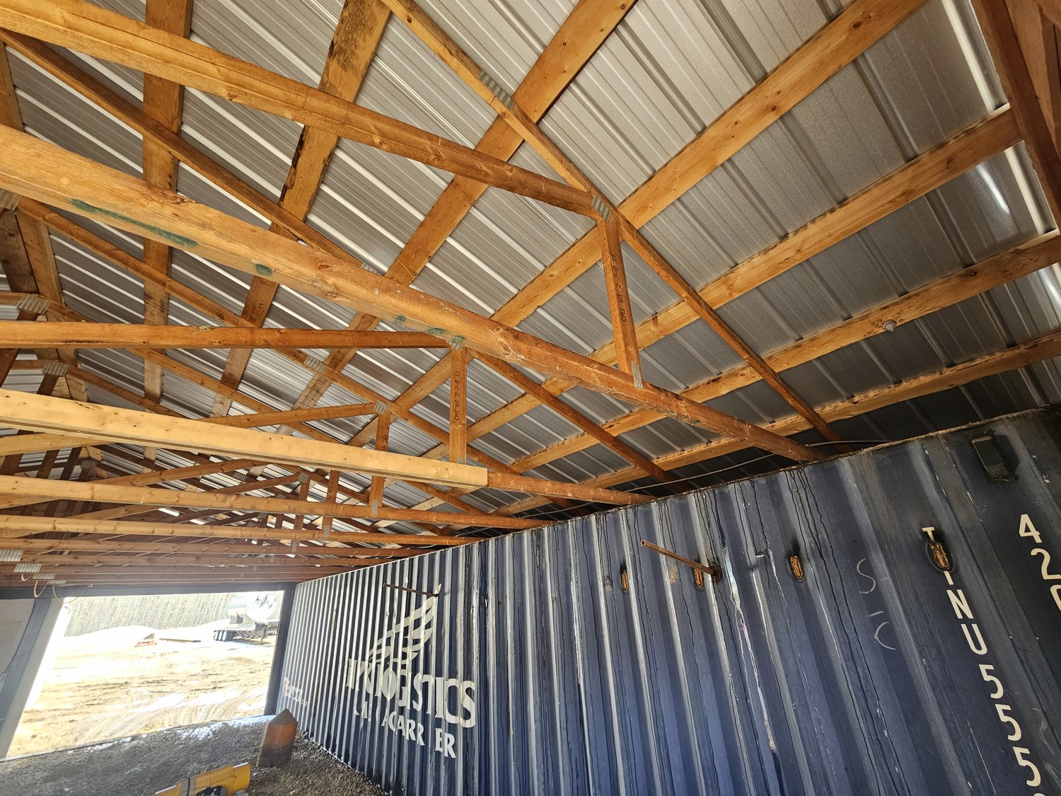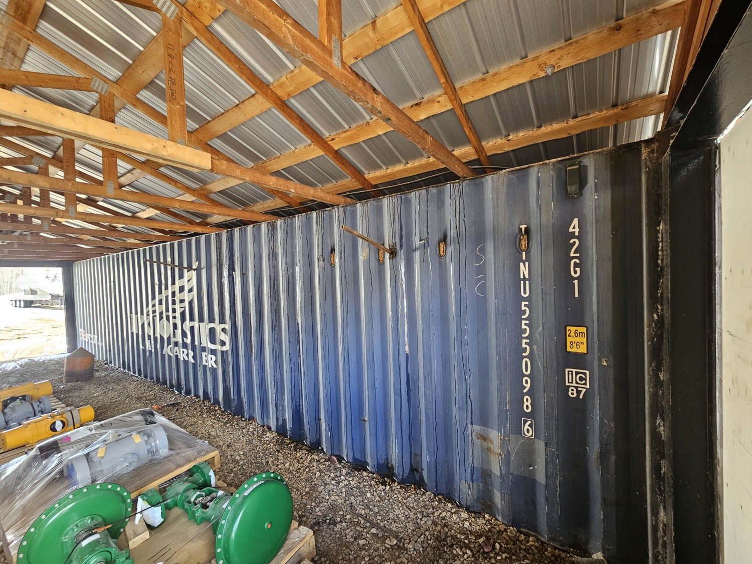 (2) 40 ft shipping containers standard height, 28 ft x 40 ft roof, wooden truss, tin roof, double rolling barn doors, (4) metal shelves, Makita chop saw (untested), 20 ft x 40 ft interior dimensions, 6 inch i beam end walls, Buyer is responsible for all disassembly and removal. There will not be equipment on site