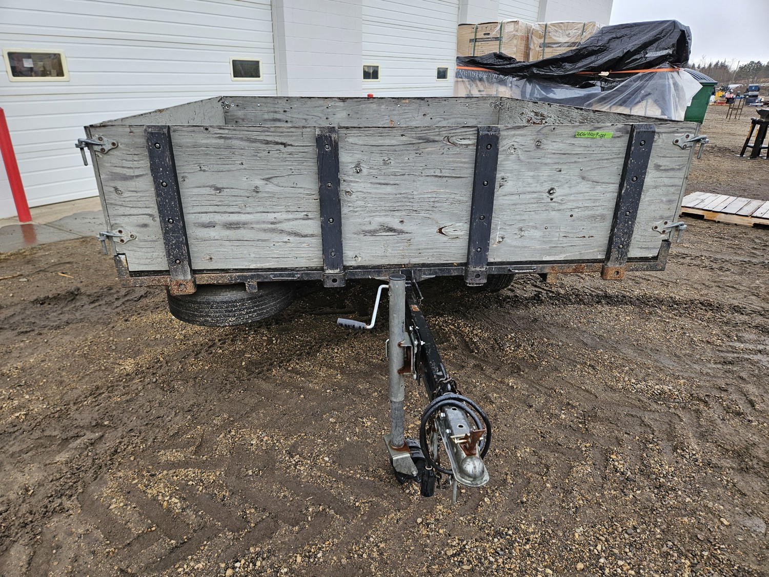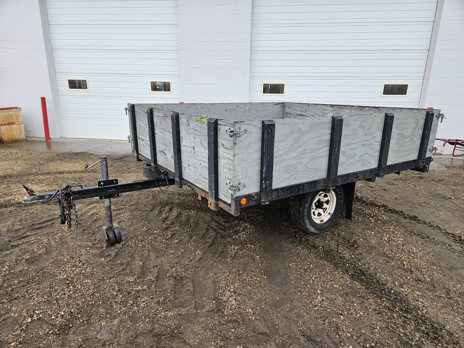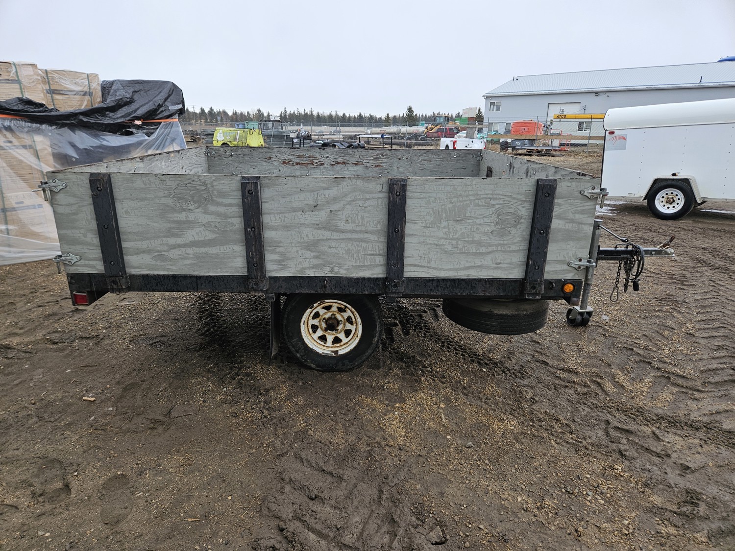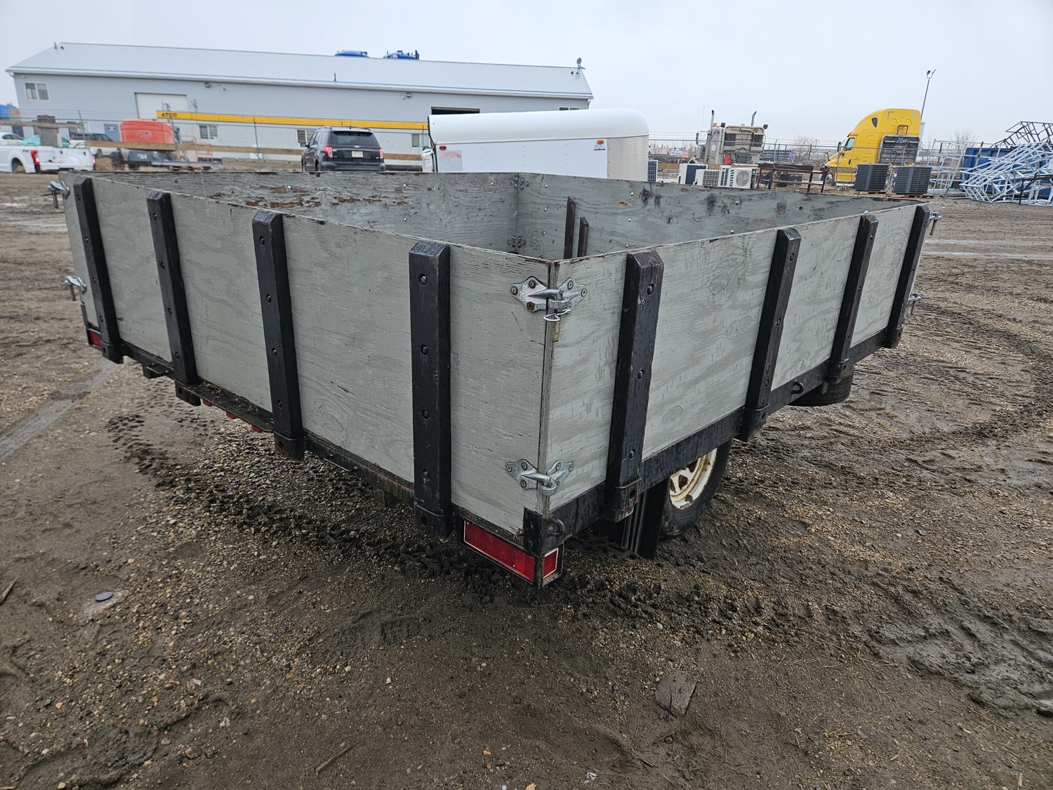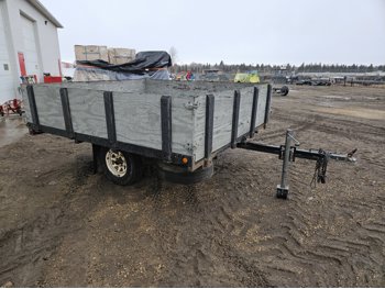 101 inch wide deck, 9 ft tilt deck, wood deck, spring suspension, ball hitch, stake pockets, 21" wooded box sides, 205/75R14 tires