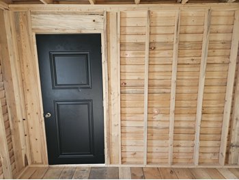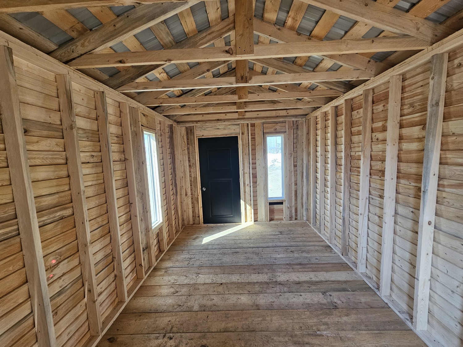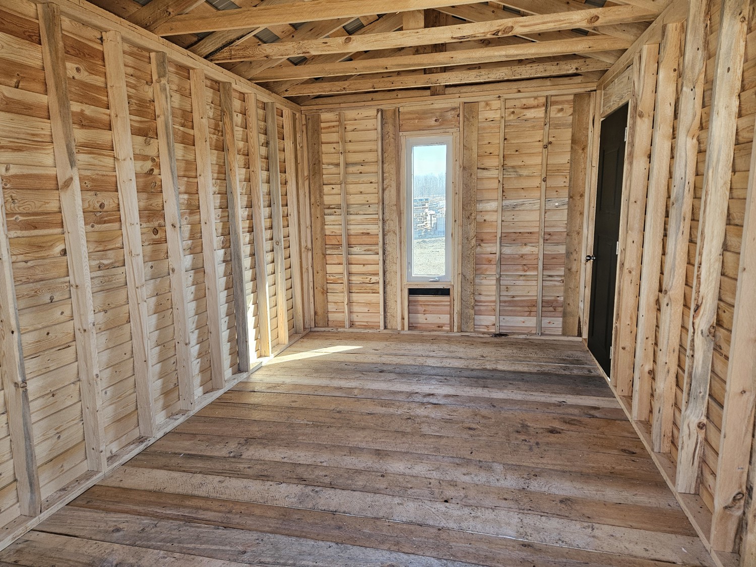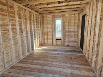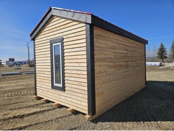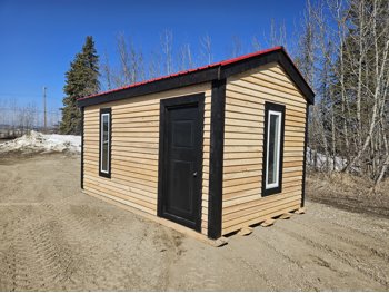 123 inch wide x 209 inch long, (2) man doors, (3) windows, tin roof, wood frame, on skids, 1x6 wood siding