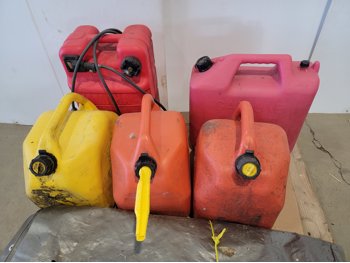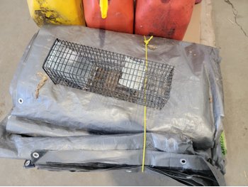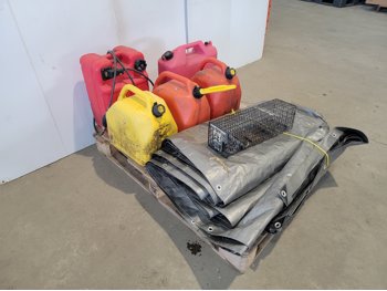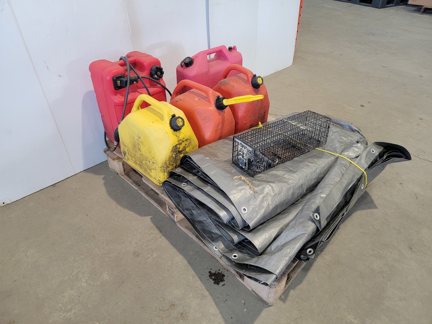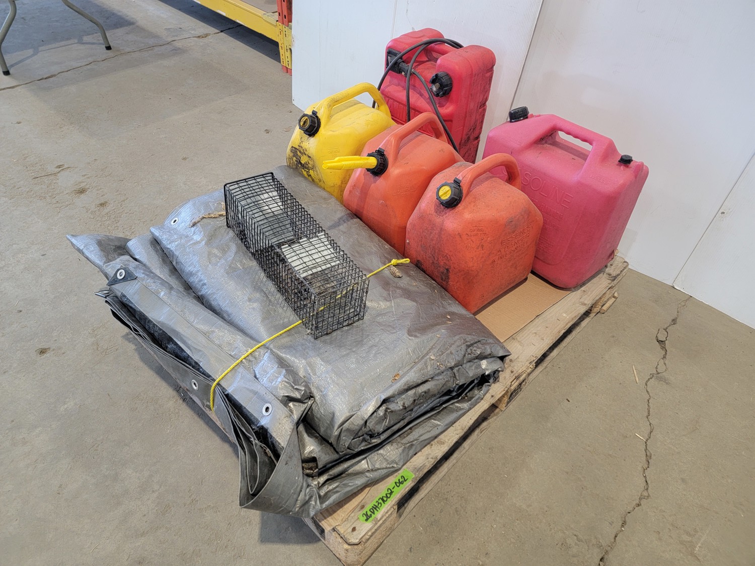 (4) Jerry Cans, Yamaha Fuel Tank, Tarp and Small Animal Trap