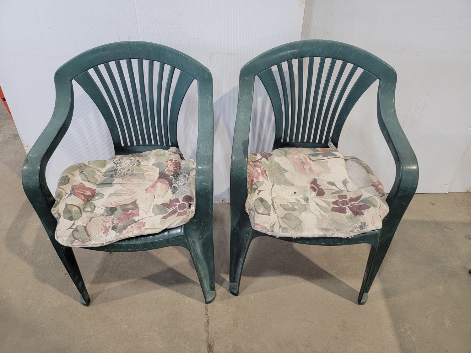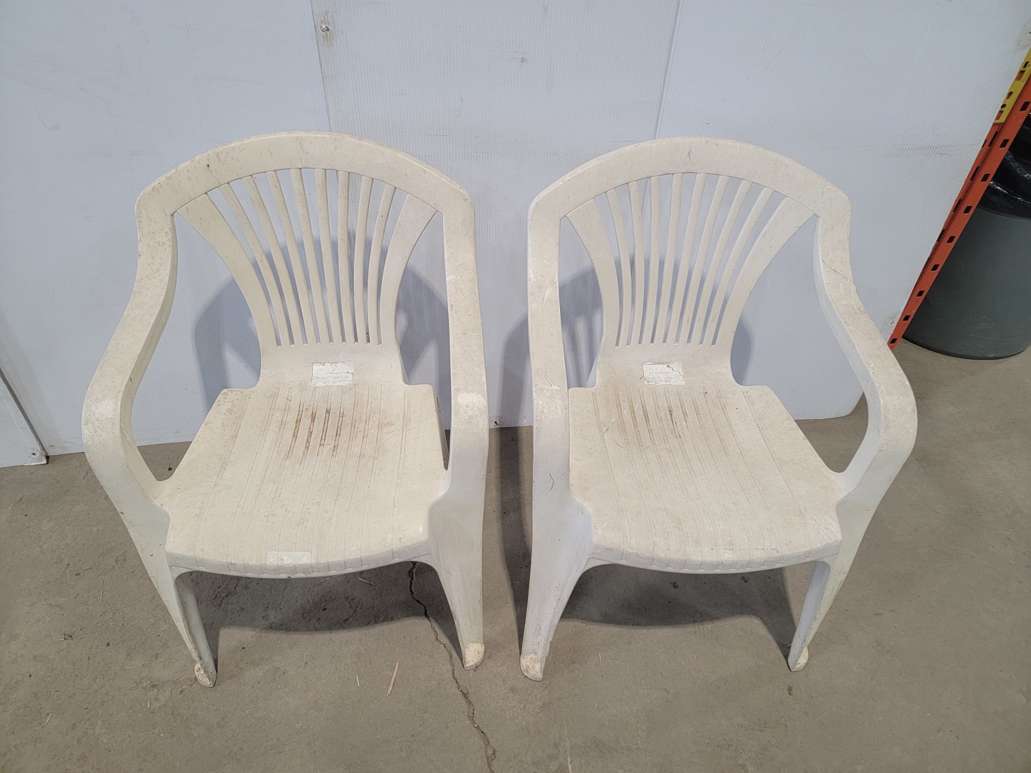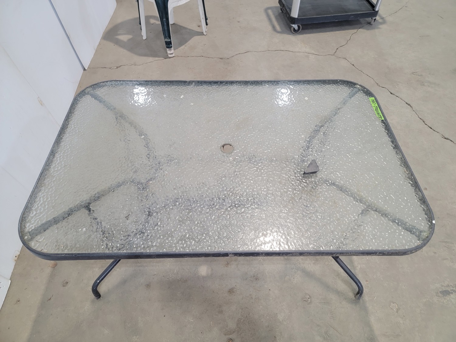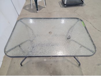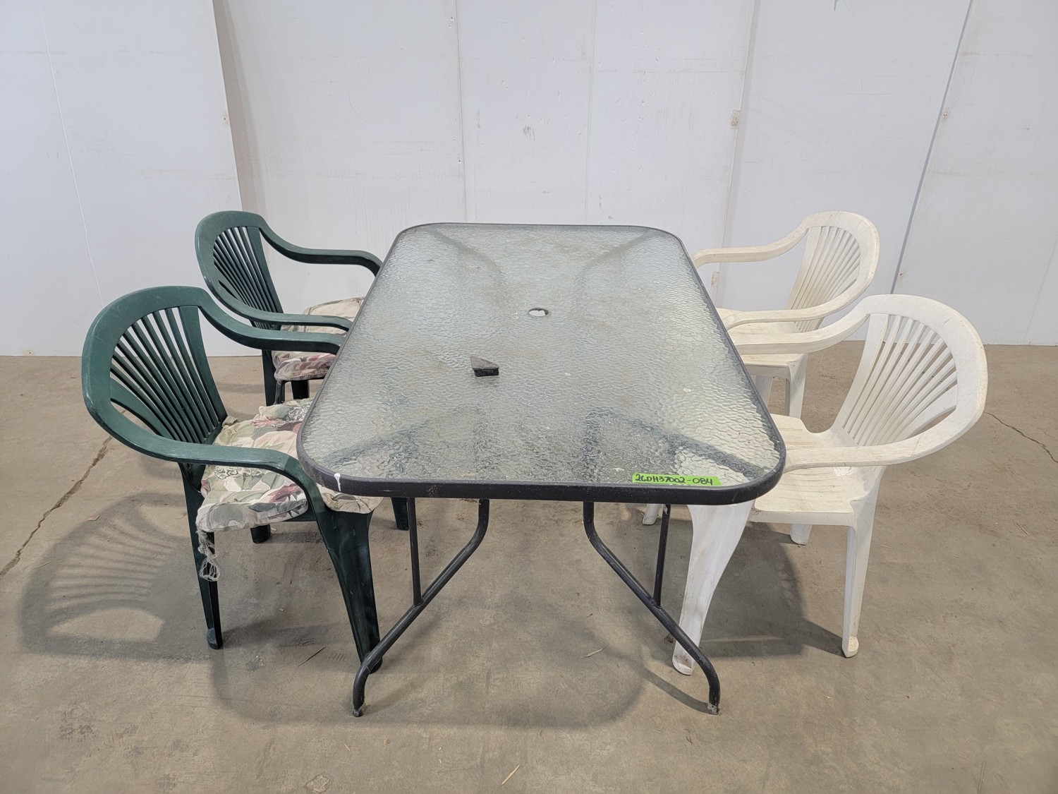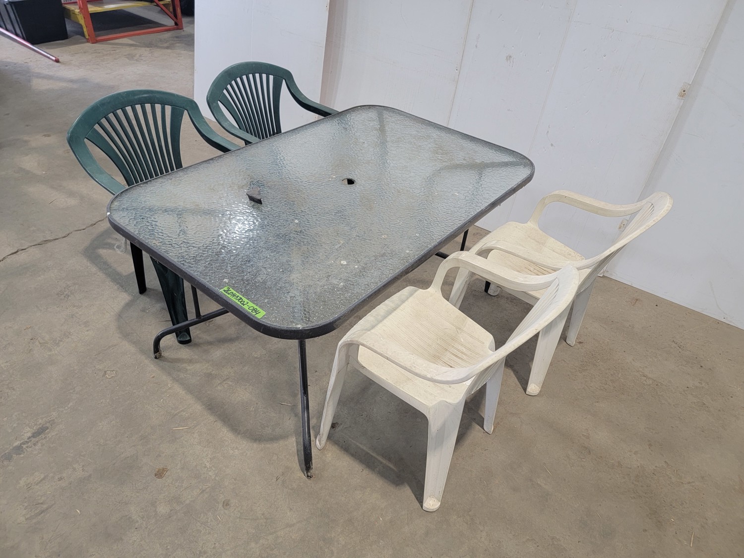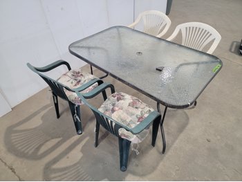 Glass Patio Table and (4) Plastic Lawn Chairs