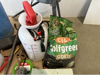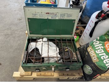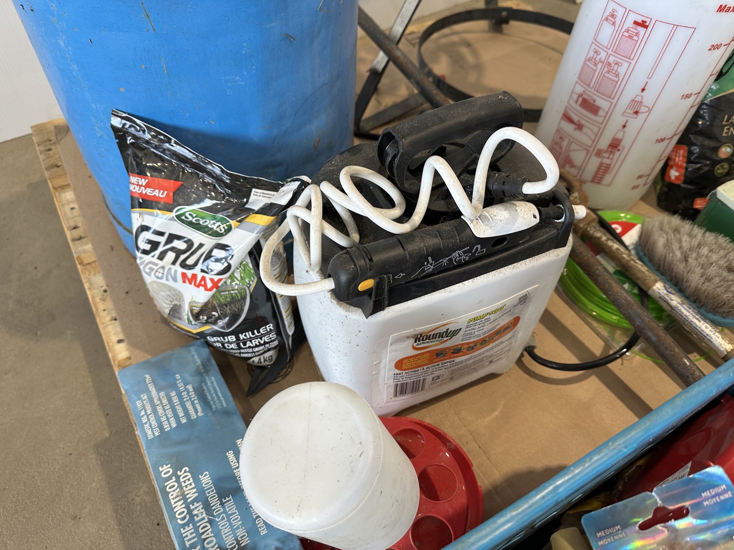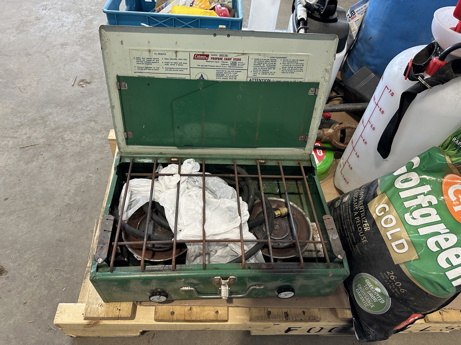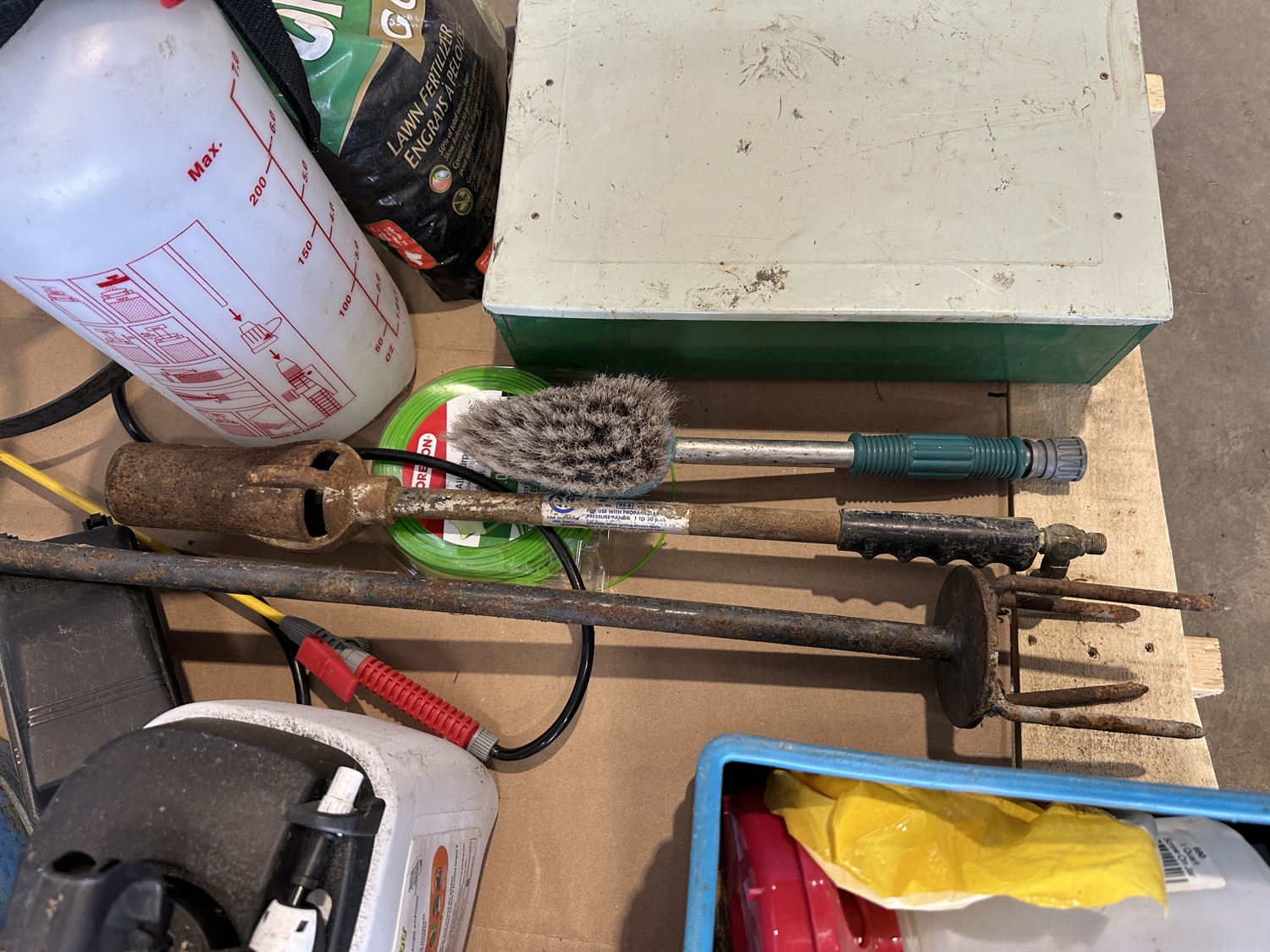 propane burner, lawn fertilizer, Roundup, Weedex dandelion bar, Coleman camp stove, sprayer