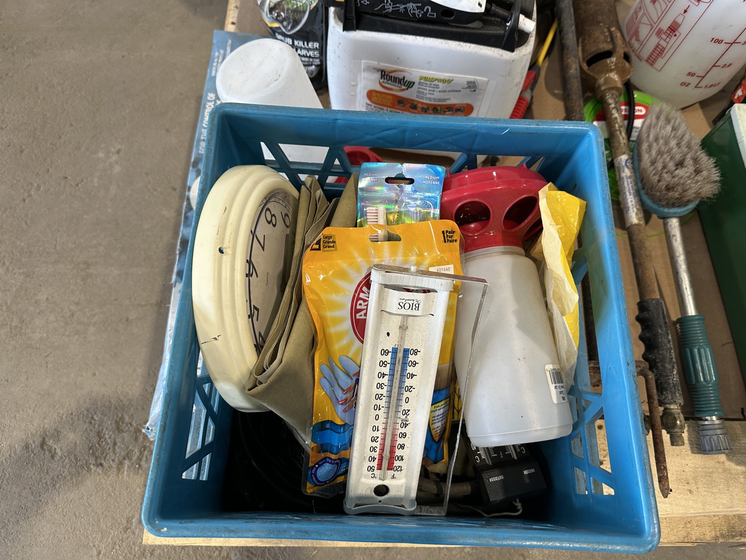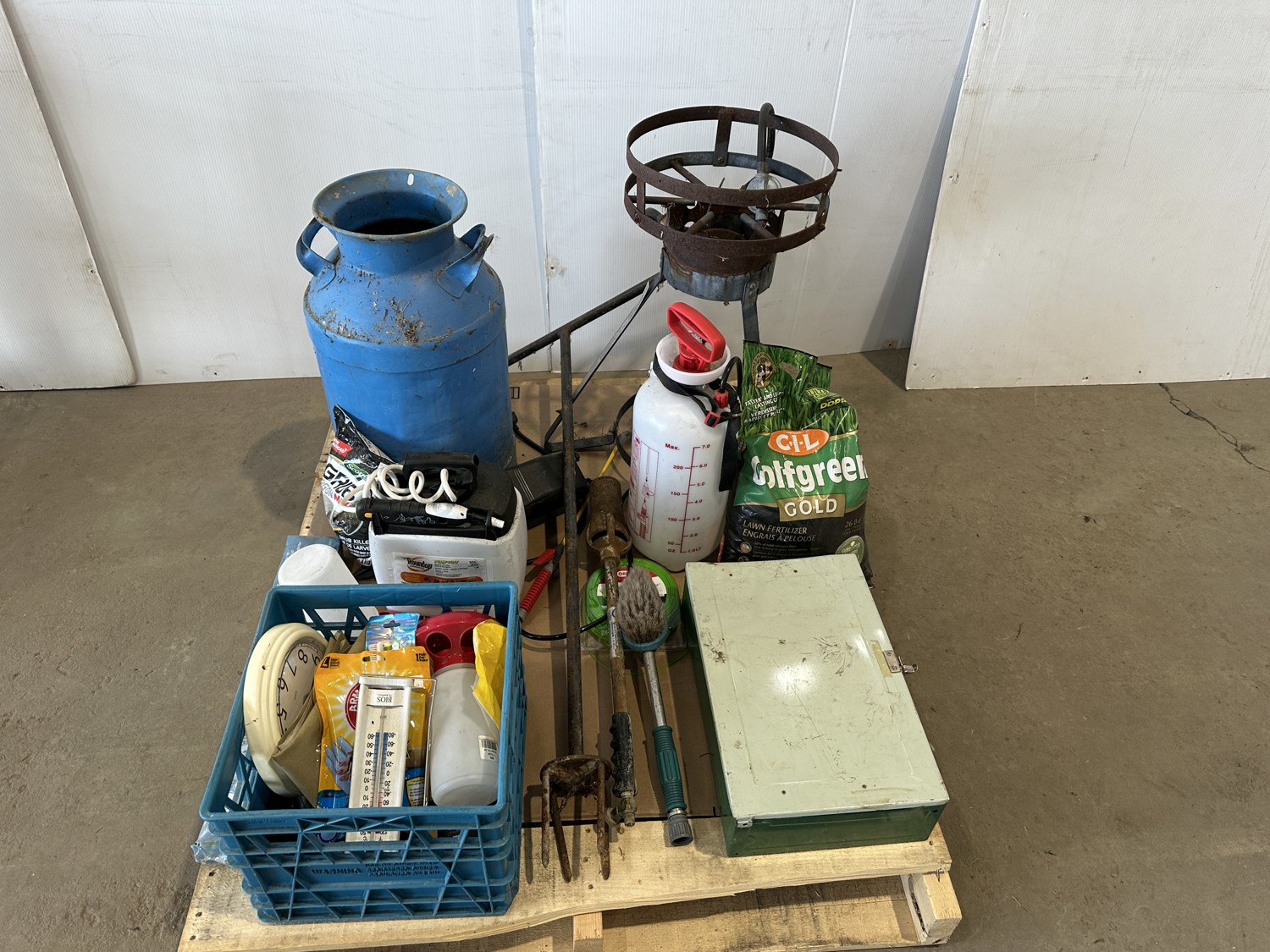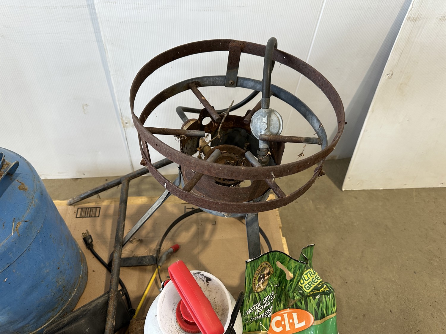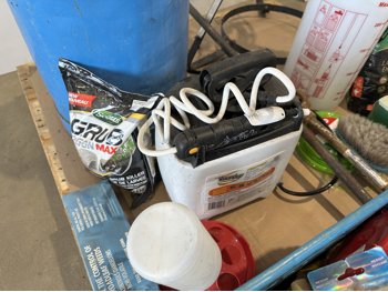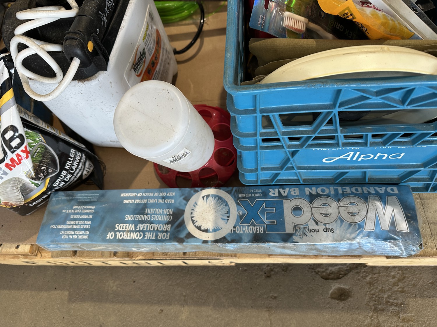 propane burner, lawn fertilizer, Roundup, Weedex dandelion bar, Coleman camp stove, sprayer