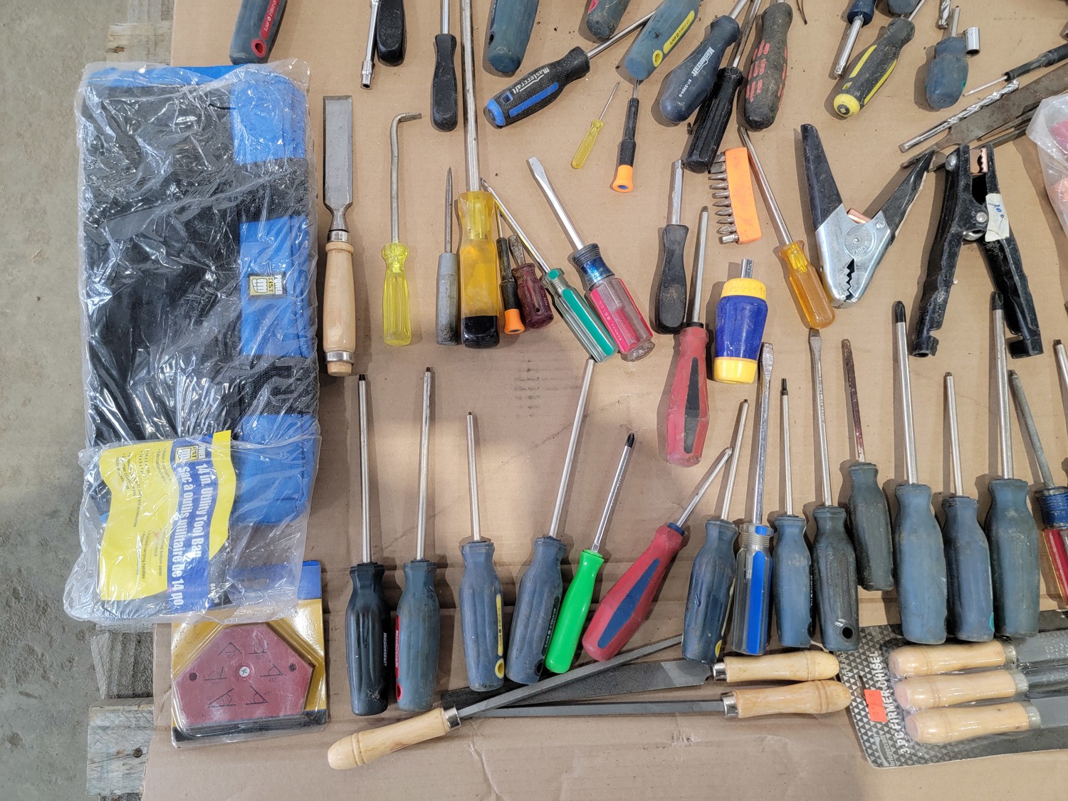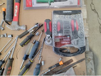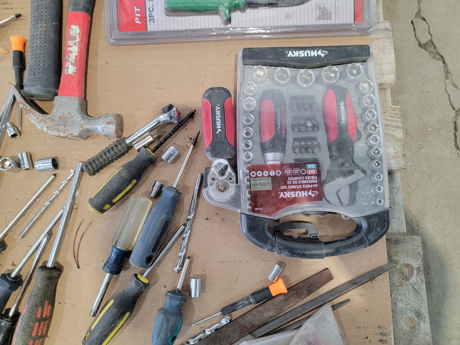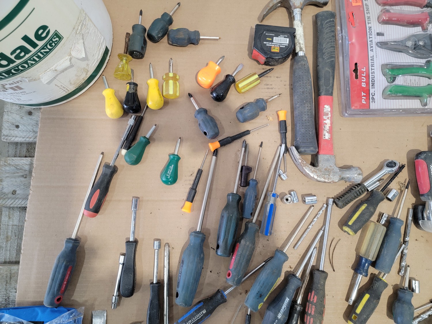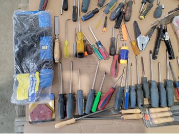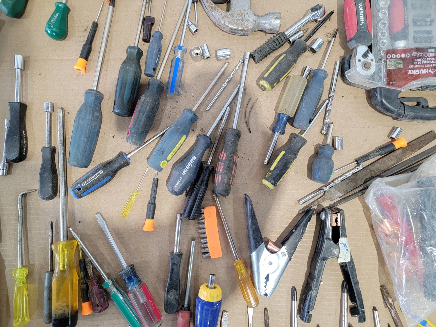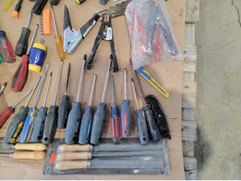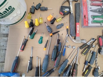screwdrivers, tin snips, Husky stubby set, files, hammers, measuring tape