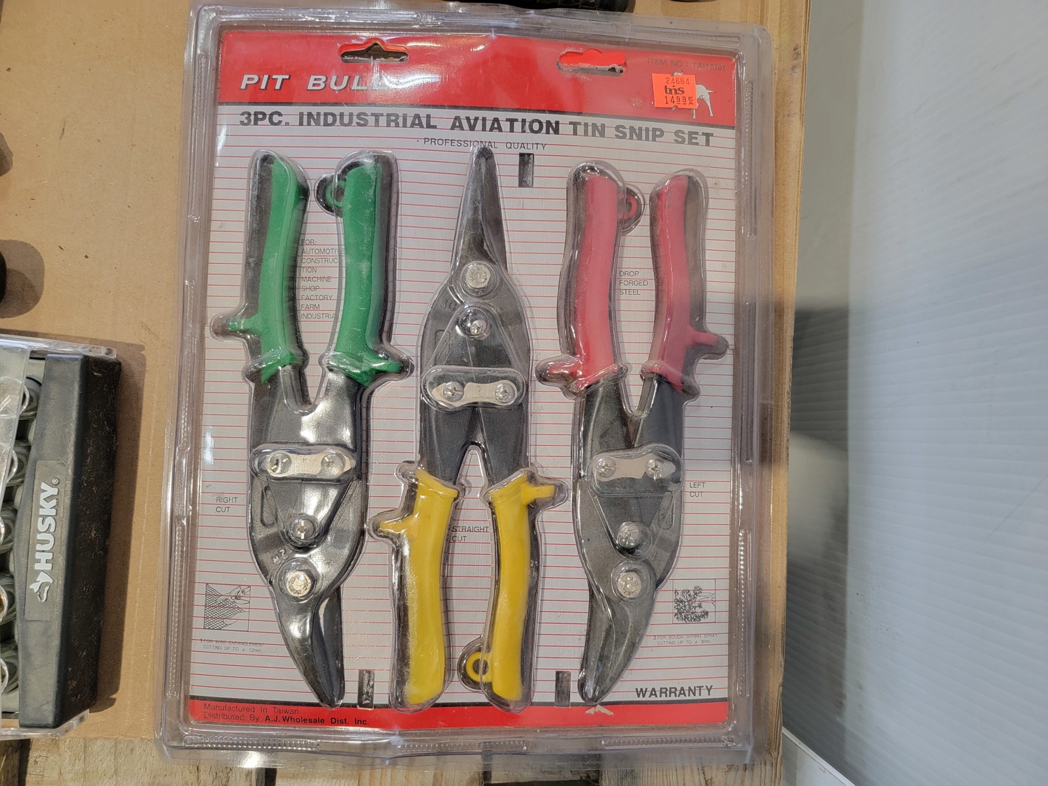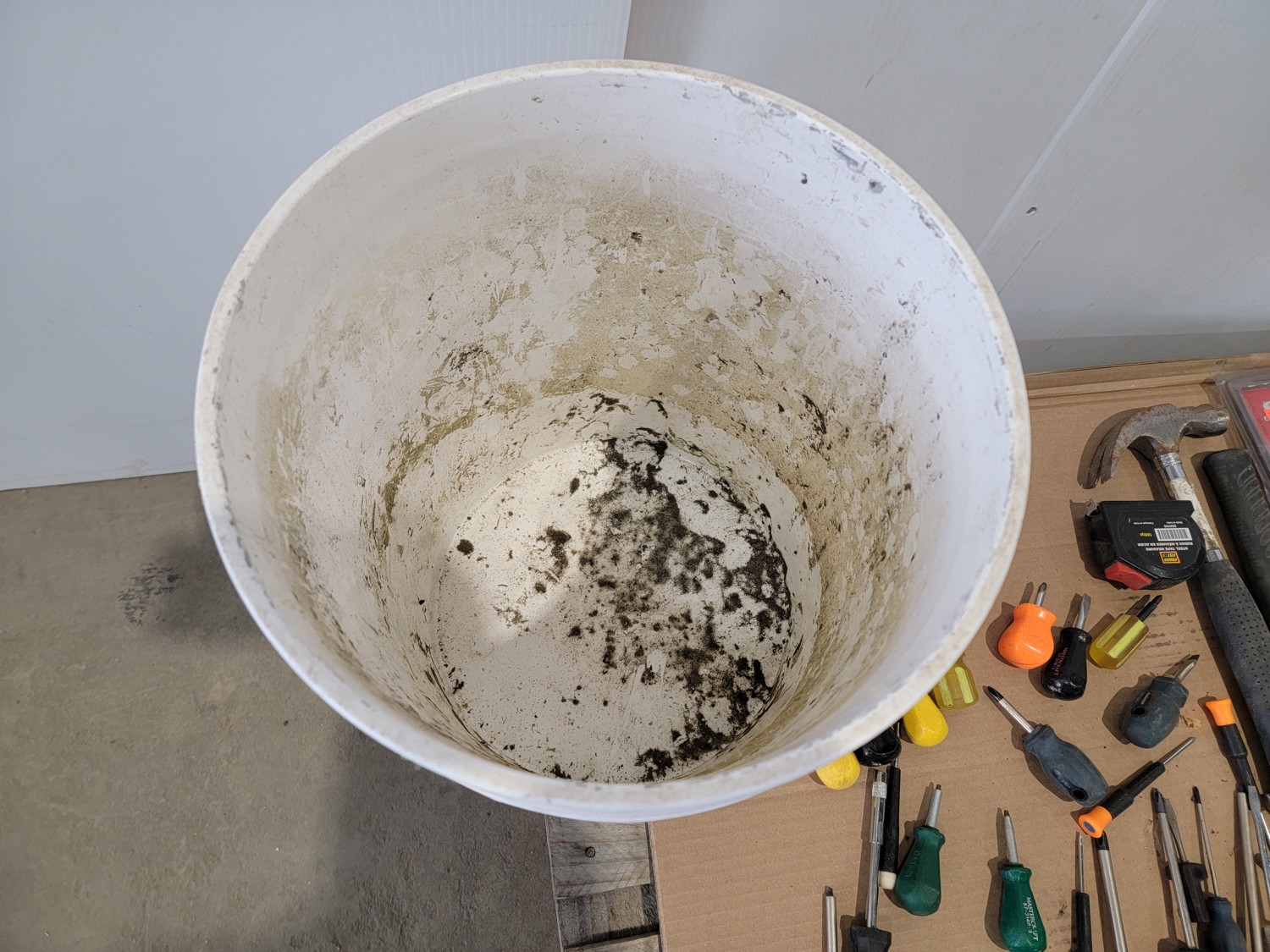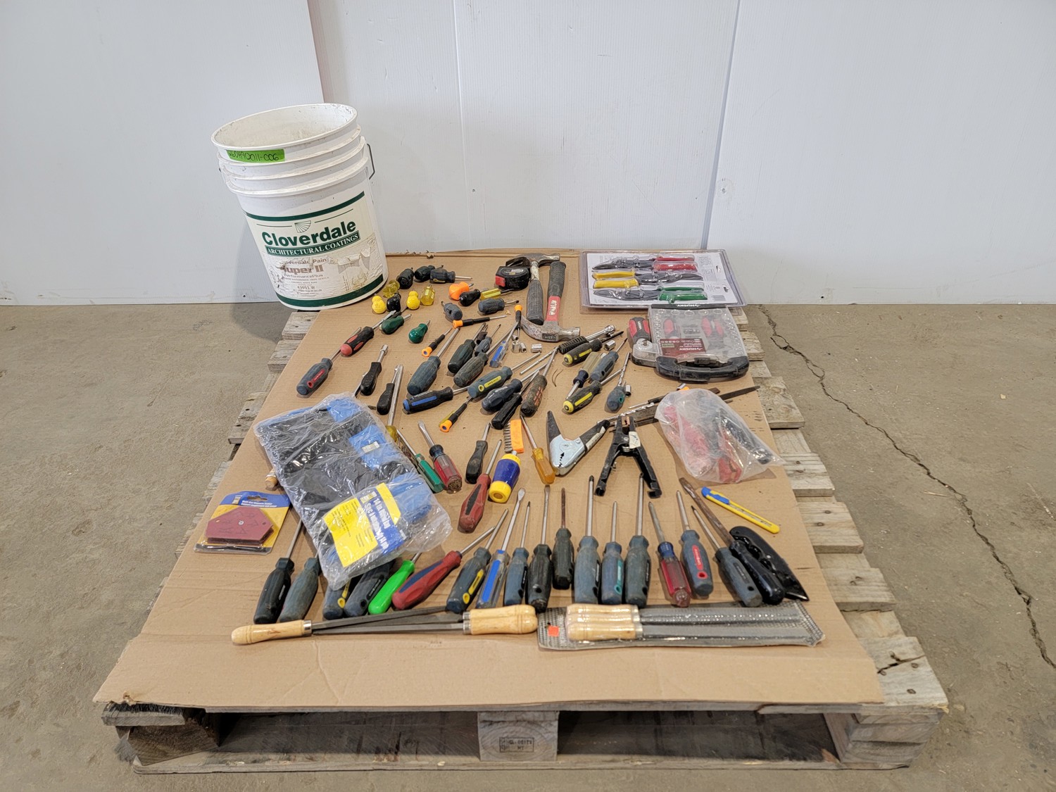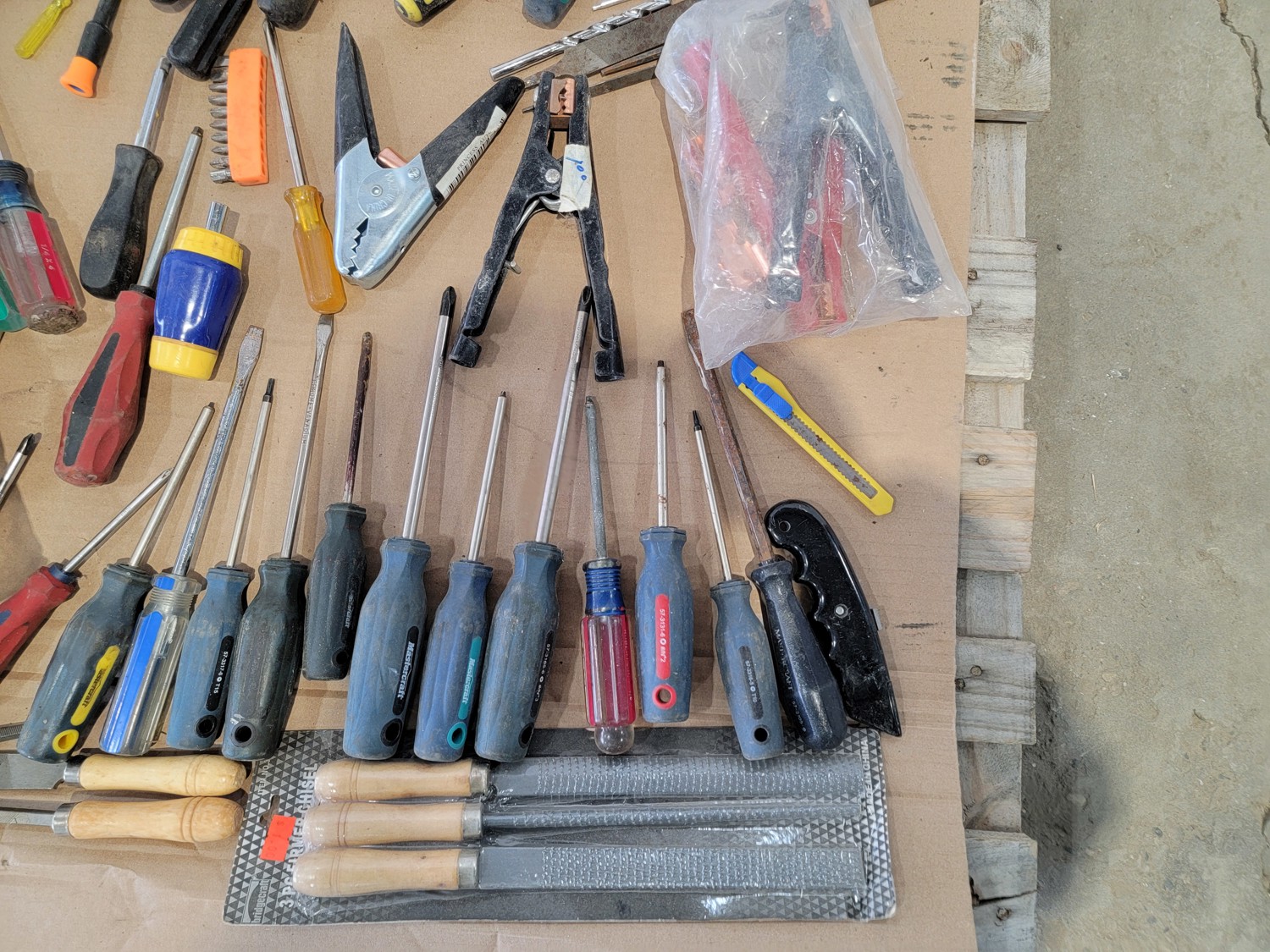 screwdrivers, tin snips, Husky stubby set, files, hammers, measuring tape